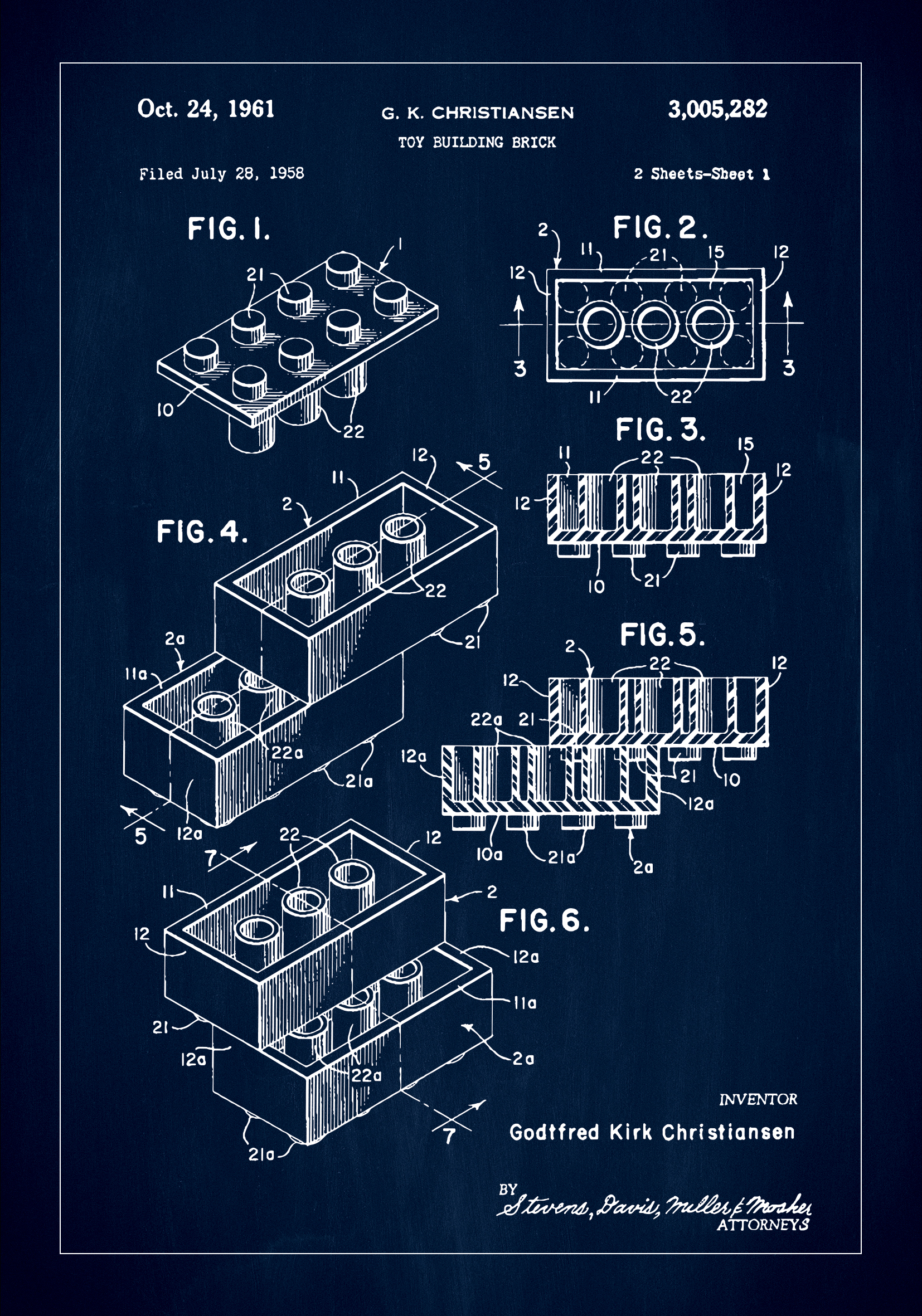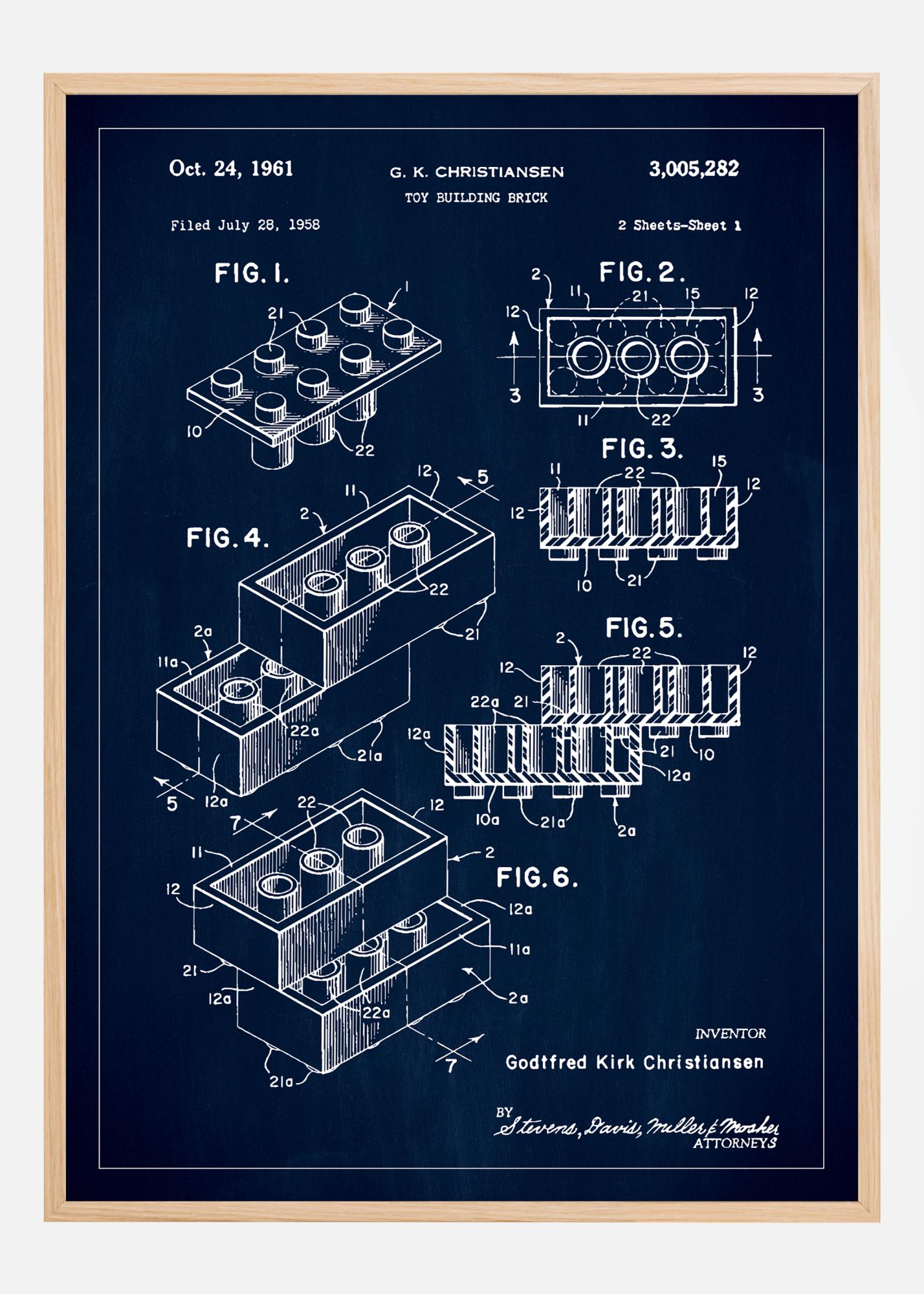 Dieses detailreiche Patentposter zeigt das geniale Design des Spielzeugbausteins von Lego, das das Spiel des kreativen Spielens und Lernens veränderte, geschaffen von Godtfred Kirk Christiansen. Mit der Patentnummer 3,005,282, erteilt am 24. Oktober 1961, fängt diese Illustration die Essenz einer Erfindung ein, die Generationen von Baumeistern und Denkern inspiriert und erfreut hat.