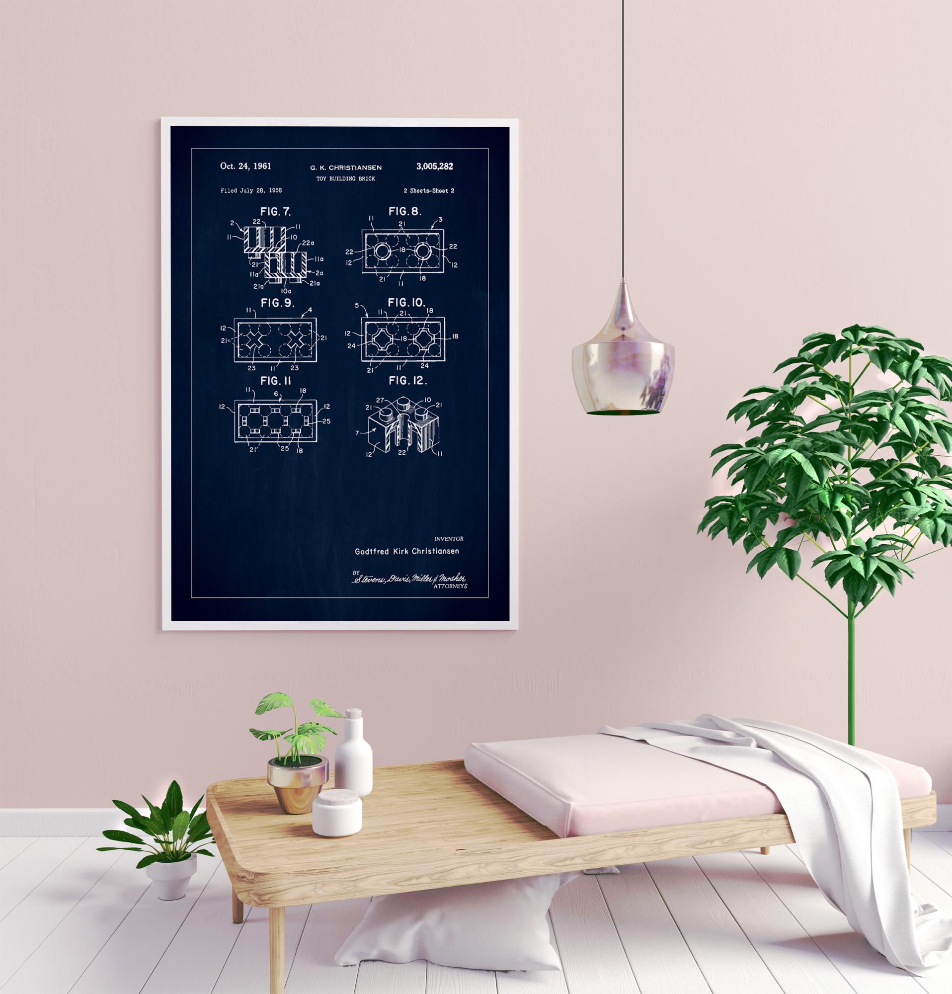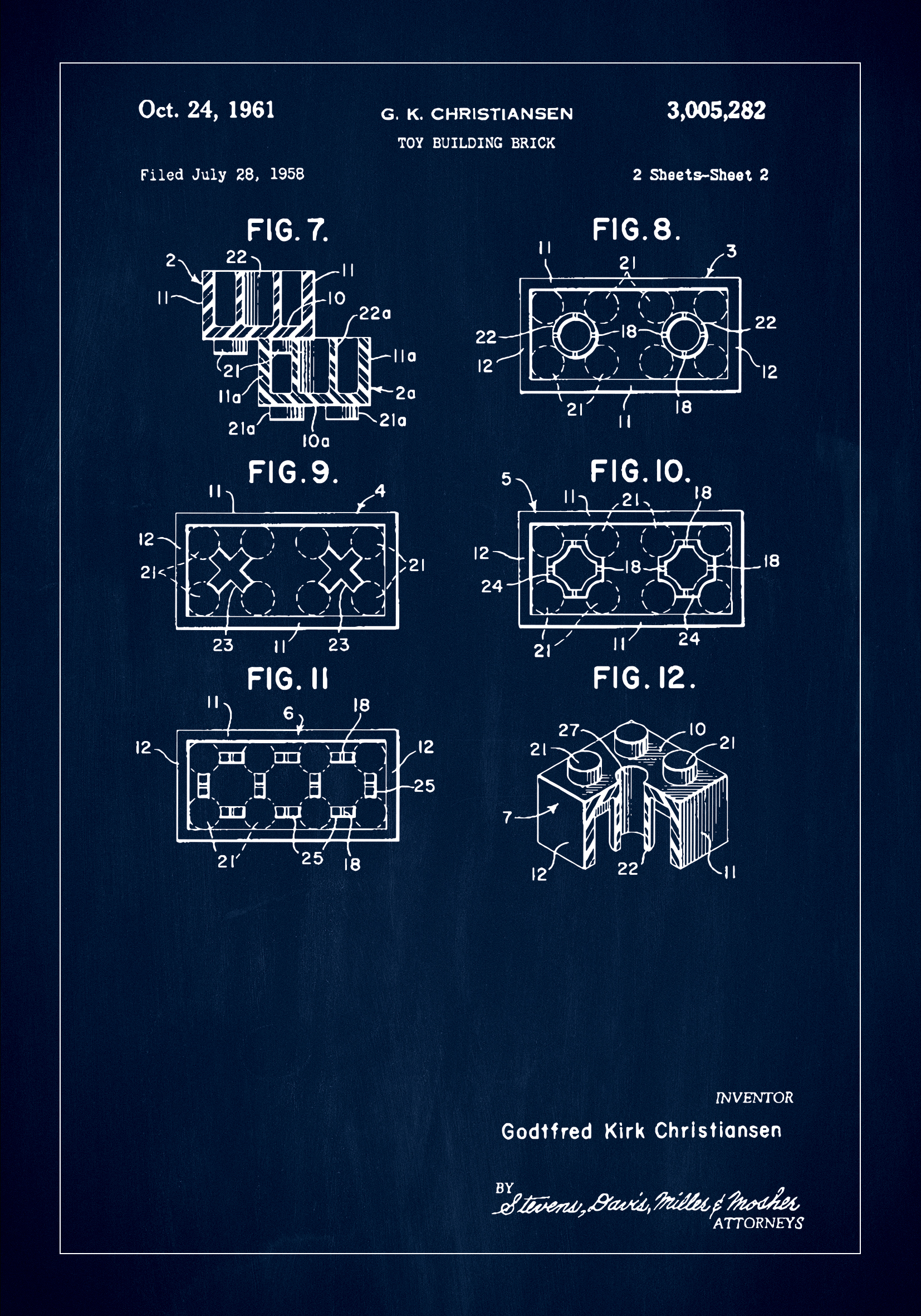 Das Poster ist sorgfältig mit detaillierten Zeichnungen aus dem ursprünglichen Patentdokument illustriert, einschließlich Schnitten und Ansichten von oben, die den einzigartigen und revolutionären Verbindungsmechanismus des Designs zeigen. Weiße Linien auf dem dunkelblauen Hintergrund betonen die kluge und zeitlose Natur des Designs, was diese Patentzeichnung zu einem inspirierenden dekorativen Element für Büros, Spielzimmer oder als Teil einer Sammlervitrine macht. Es dient nicht nur als Erinnerung an die Freude der Kindheit, sondern auch an die kreativen Fortschritte, die weiterhin unsere Welt gestalten.