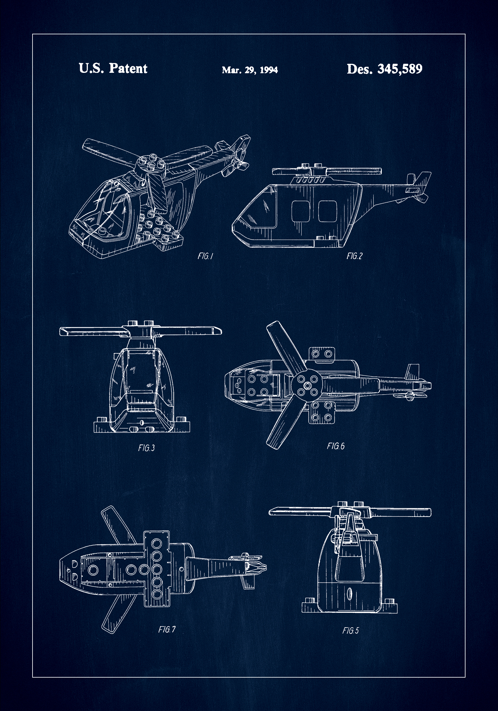 Dieses exklusive Patentposter zeigt das ästhetische und funktionale Meisterwerk eines Helikopters aus Lego hinter dem U.S. Patent Des. 345,589, datiert auf den 29. März 1994. Mit einem tiefen marineblauen Hintergrund, der wunderschön mit den weißen Linien kontrastiert, fängt diese Patentzeichnung das Wesen fortschrittlicher Ingenieurskunst und Design ein. Es ist eine Hommage an Innovation und ideal für diejenigen, die technische Raffinesse und historisch einflussreiches Design in ihrer Inneneinrichtung zu schätzen wissen.