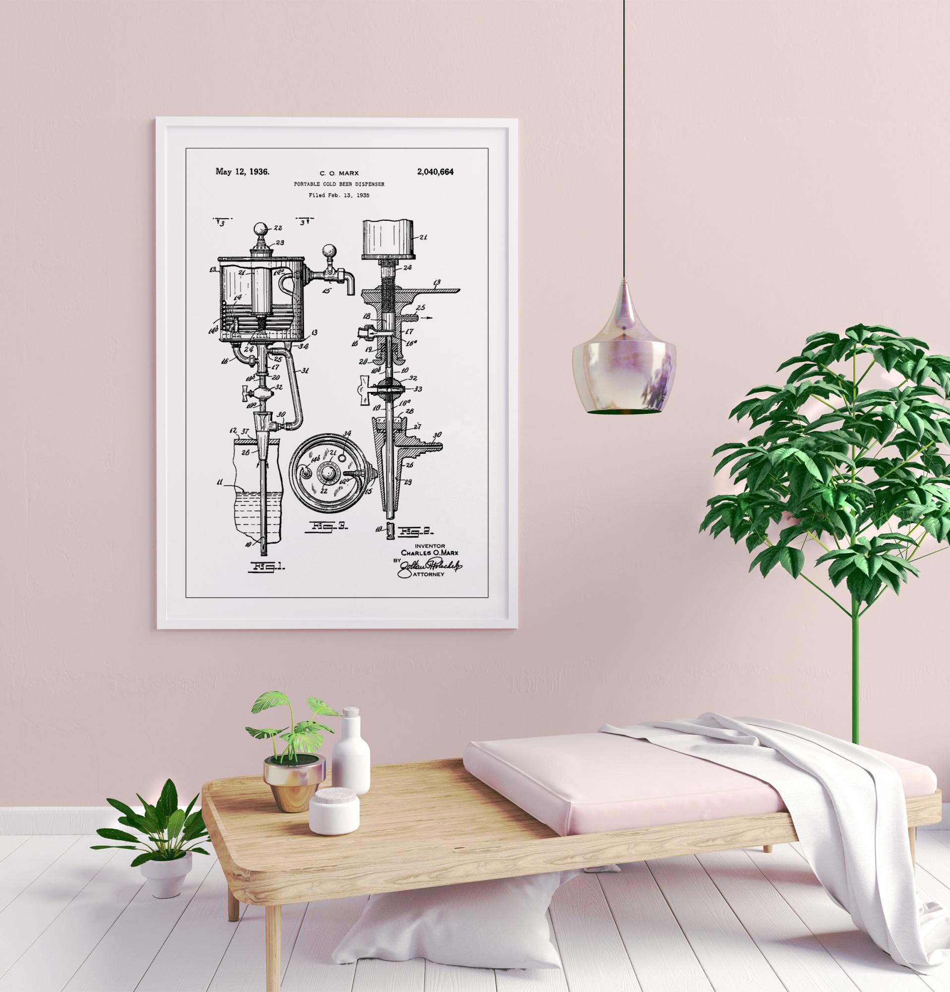 Dieses kunstvolle Patentposter zeigt das detaillierte Design eines tragbaren Bierkühlers, der am 12. Mai 1936 von Charles O. Marx patentiert wurde. Die Patentnummer 2.040.664 ist stolz oberhalb des sorgfältig skizzierten Apparats präsentiert, wobei jede Linie und jedes Detail einer einzigartigen Schöpfung der industriellen Ära Leben einhaucht. Der elegante Schwarz-Weiß-Kontrast macht diese Patentskizze zu einem zeitlosen Einrichtungsgegenstand, der perfekt in eine anspruchsvolle Lounge oder ein Sammlerzimmer eines Enthusiasten passt.