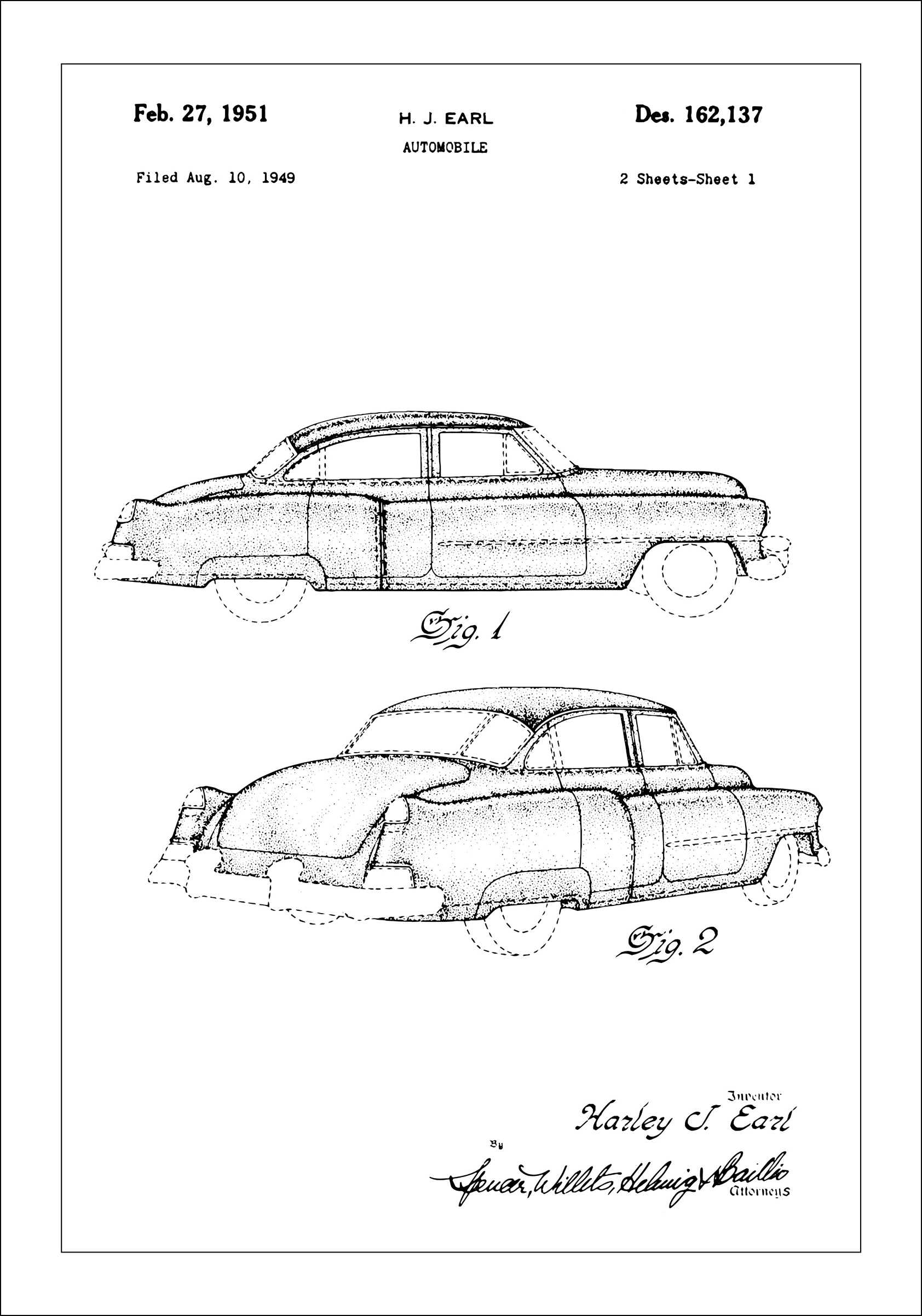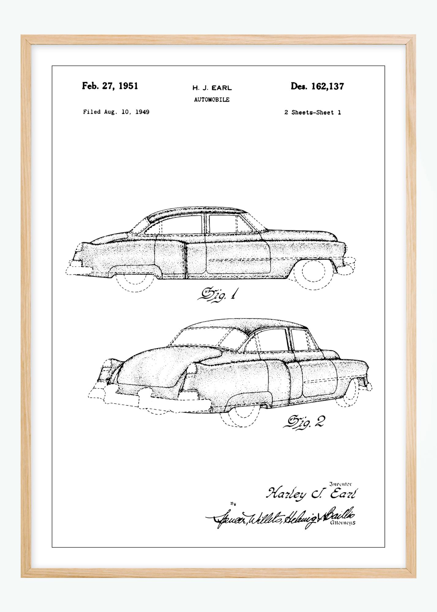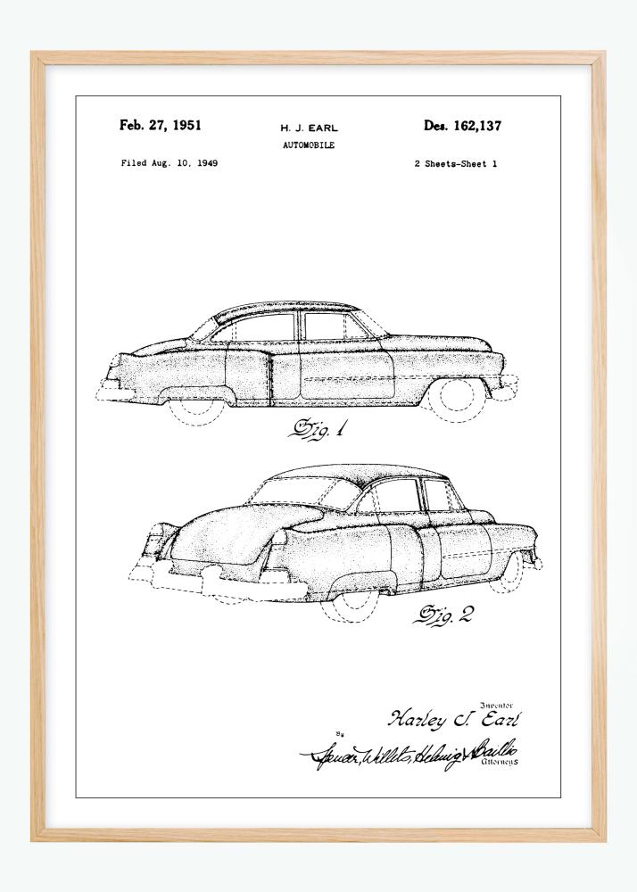 Dieses Patentposter präsentiert eine raffinierte Autozeichnung eines Cadillac, entworfen von dem berühmten H.J. Earl. Datiert auf den 27. Februar 1951, mit der Patentnummer Des. 162.137, die ursprünglich am 10. August 1949 eingereicht wurde, fängt dieses Bild die Essenz der Nachkriegs-Autoindustrie ein. Das Motiv ist eine Hommage an das goldene Zeitalter des amerikanischen Autos und wurde mit einer Aufmerksamkeit für Details erstellt, die sowohl Autohersteller als auch Designliebhaber anspricht.