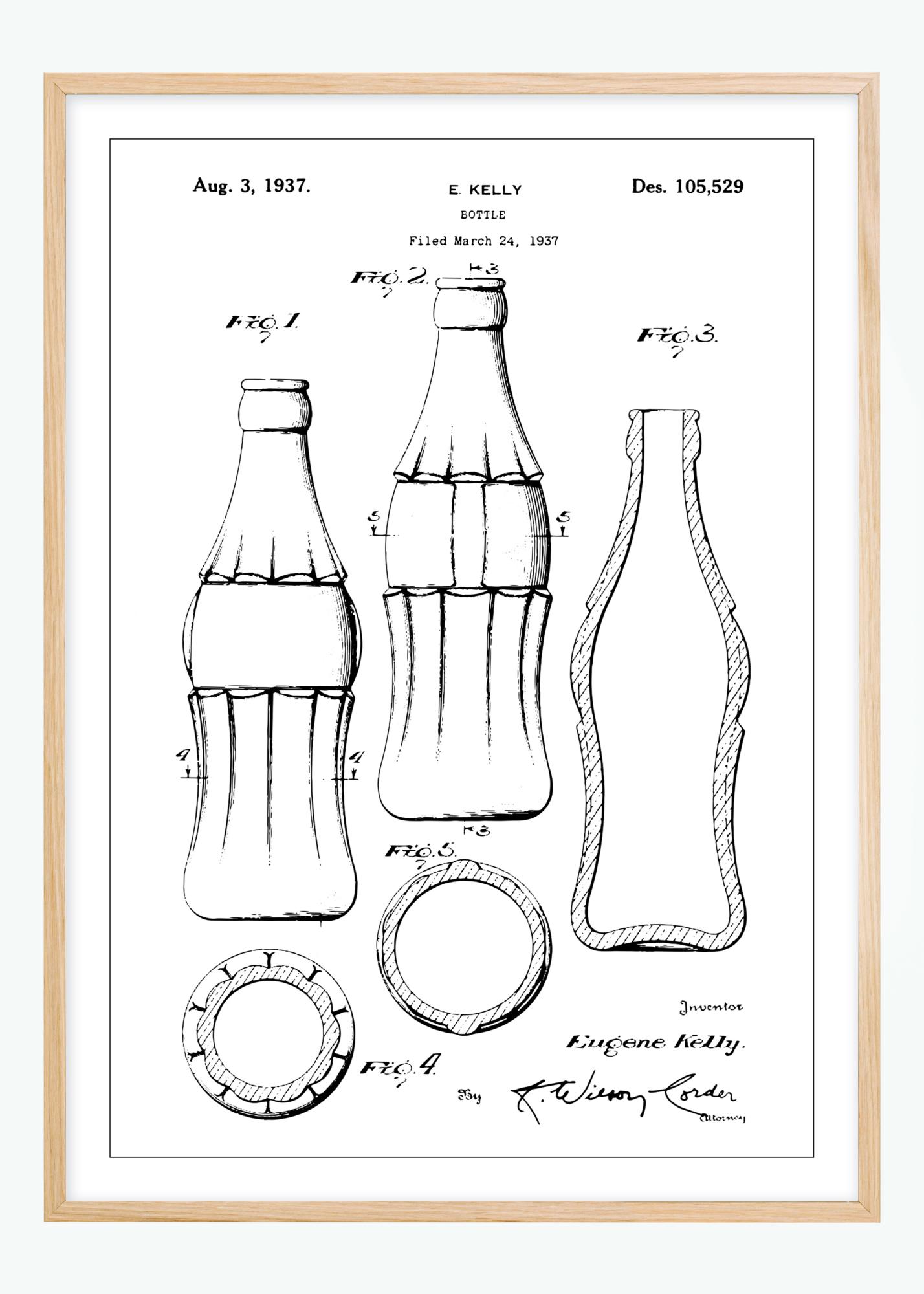 Dieser Patentausdruck zeigt das Design einer CocaCola-Flasche, das E. Kelly am 3. August 1937 unter der Patentnummer Des. 105.529 gewährt wurde. Die Illustration zeigt die detaillierten Konturen und Proportionen der Flasche aus mehreren Blickwinkeln, was ein vollständiges Bild des Designs vermittelt. Die ikonische Form der Flasche ist synonym mit dem Produkt, das sie enthält, geworden und ist ein zeitloses Symbol für Markenbildung und Produktgestaltung.