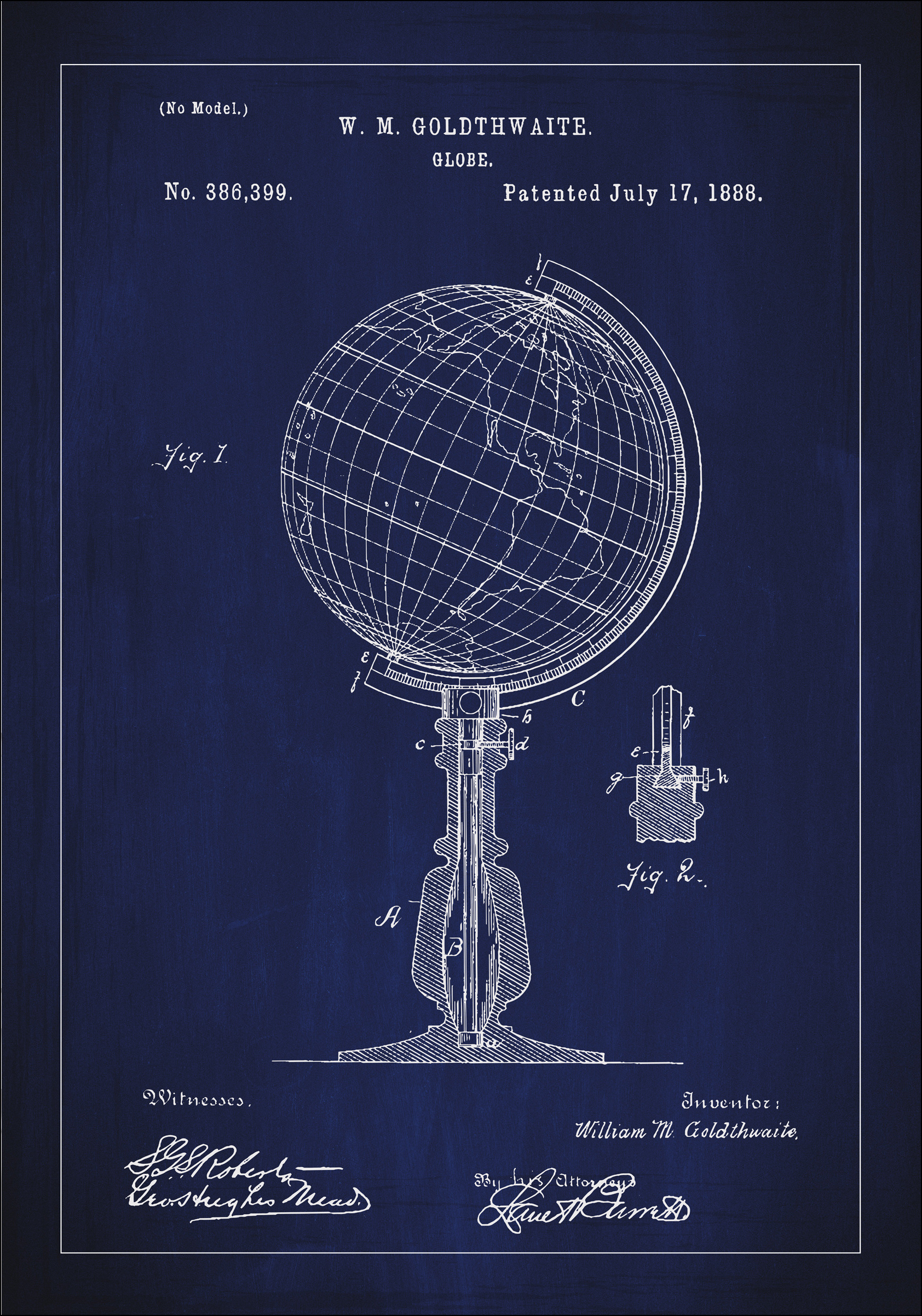 Schaffen Sie einen einladenden und intellektuell stimulierenden Raum mit unserem Patentposter, das W. M. Goldthwaites klassisch gestalteten Globus darstellt, geschützt durch das Patentnummer 386,399 seit dem 17. Juli 1888. Diese detailreiche Patentzeichnung erfasst nicht nur die technische Präzision des Designs, sondern auch die Zeit, in der globale Entdeckung und Verständnis einer breiteren Öffentlichkeit zugänglich wurden. Eine solch künstlerische Darstellung der Welt bietet eine edukative Perspektive und dient gleichzeitig als elegante Dekoration.