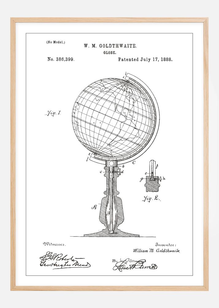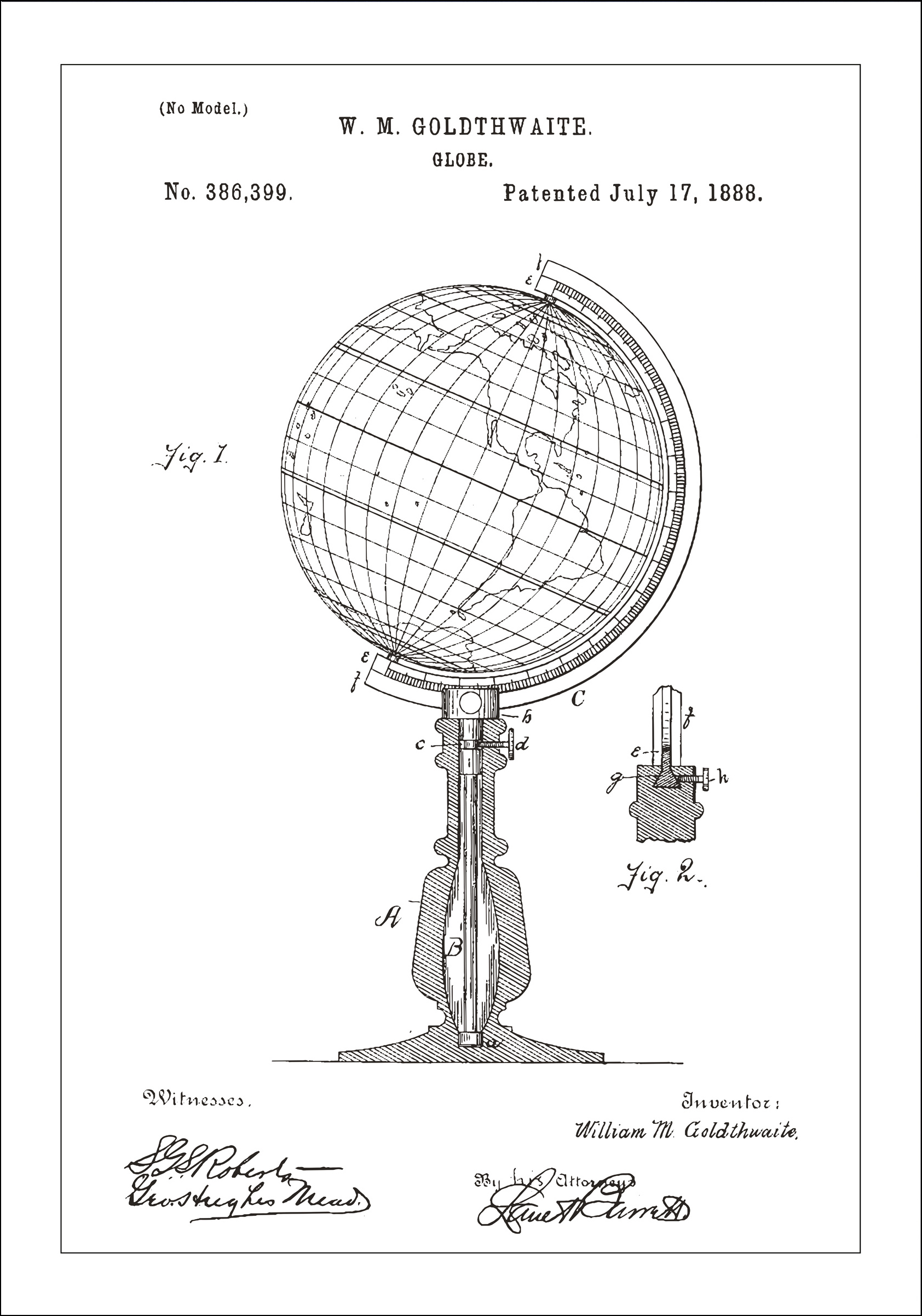 Dieses Patentposter präsentiert W. M. Goldthwaites sorgfältig gestalteten Globus, der unter der Patentnummer 386.399 am 17. Juli 1888 patentiert wurde. Das Poster hebt die zeitlose Eleganz und den pädagogischen Wert dieser klassischen Erfindung hervor und illustriert das menschliche Streben, unsere Welt zu kartieren und zu verstehen. Der Detailreichtum dieser Patentzeichnung ist ein Beweis für Genauigkeit und Kunsthandwerk und schafft in jedem Raum ein Gesprächsthema.
