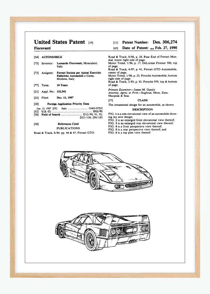 Dieses elegante Patentposter zeigt ein Auto, das von Leonardo Fioravanti für Ferrari entworfen wurde, einen der ikonischsten Namen in der Automobilindustrie. Erteilt am 27. Februar 1990 unter der Patentnummer Des. 306,274, repräsentiert das Dokument das ästhetische Design eines Ferrari F40, das die Essenz von Geschwindigkeit und Innovation einfängt. Die Illustrationen des Patents heben die markanten Linien und die aerodynamische Silhouette hervor, die die Marke definiert haben.