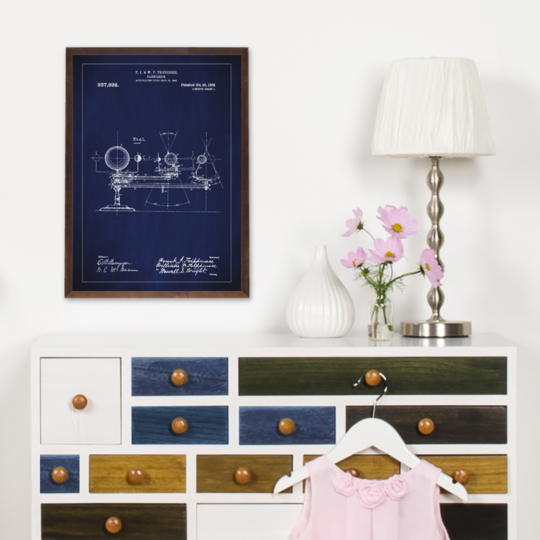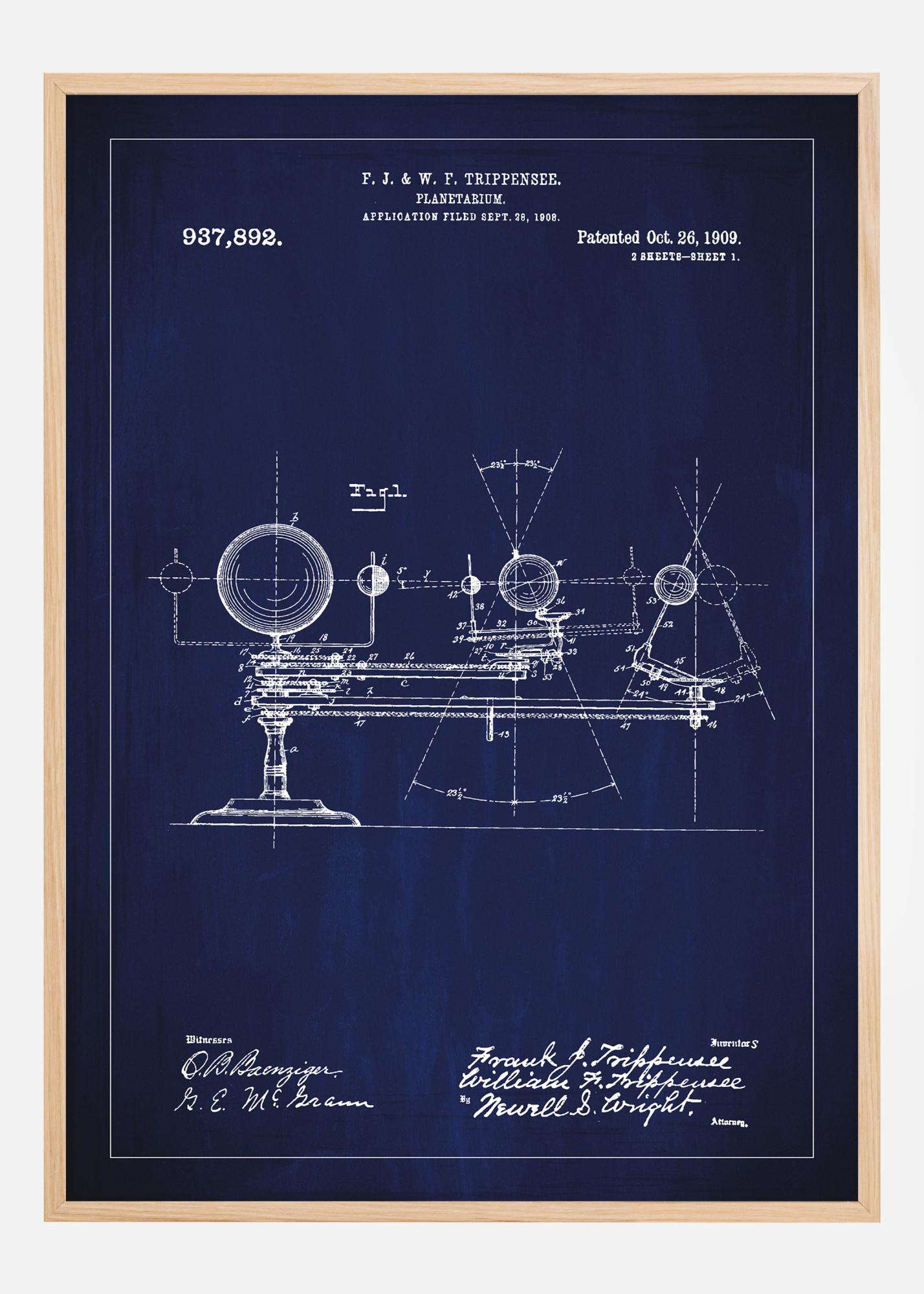 Mit Präzision und Sorgfalt gestaltet, enthüllt dieses Patentplakat die Komplexität eines klassischen Planetariums – eines Geräts, das über Jahrhunderte hinweg verwendet wurde, um die Bewegungen der Planeten in unserem Sonnensystem zu veranschaulichen und zu vermitteln. Die sorgfältig markierten Teile und die feinen Linien vor dem tiefblauen Hintergrund machen dies zu einer auffälligen Wanddekoration, die nicht nur Kunst, sondern auch ein pädagogisches Werkzeug ist. Perfekt für das Heimbüro, das Wissenschaftsklassenzimmer oder als einzigartiges Geschenk für einen Wissenschaftsliebhaber; diese Patentzeichnung ist ein wahrer Schatz.