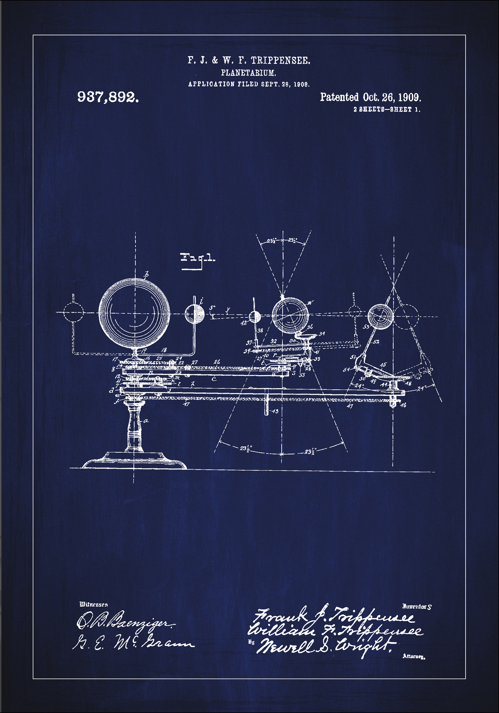 Dieser prächtige Patentauszug zeigt die Patentzeichnung eines Planetariums, das an F. J. & W. F. Trippensee unter der Patentnummer 937,892 erteilt wurde. Das Patent, das offiziell am 26. Oktober 1909 registriert wurde, ist ein Meisterwerk der technischen Zeichnung und des Designs, das den wissenschaftlichen Bestrebungen und der Erfindungsgabe der damaligen Zeit verkörpert. Die Motive bieten einen Einblick in die Instrumente der frühen Astronomie und sind eine exklusive Dekoration für alle, die sich für die Geschichte der Wissenschaft interessieren oder antike wissenschaftliche Instrumente schätzen.