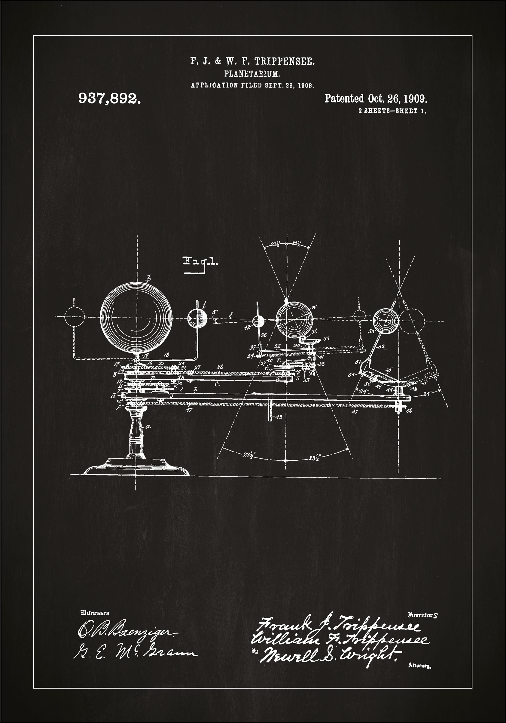 Dieses sorgfältig gestaltete Patentposter präsentiert ein Planetarium, ein Instrument, das den Weg für das Studium der Bewegungen der Himmelskörper ebnete. Die Patentskizze zeigt das Design von F. J. & W. F. Trippensee, dem am 26. Oktober 1909 die Patentnummer 937.892 erteilt wurde, nach der Anmeldung am 28. September 1908. Jedes Detail und jede Komponente der Konstruktion ist wunderschön wiedergegeben, was die Komplexität und Präzision dieses Lehrmittels für die Astronomie offenbart. Es ist ein fesselndes und inspirierendes Bild für alle, die eine Leidenschaft für den Sternenhimmel und die pädagogischen Werkzeuge haben, die verwendet wurden, um ihn zu erforschen.