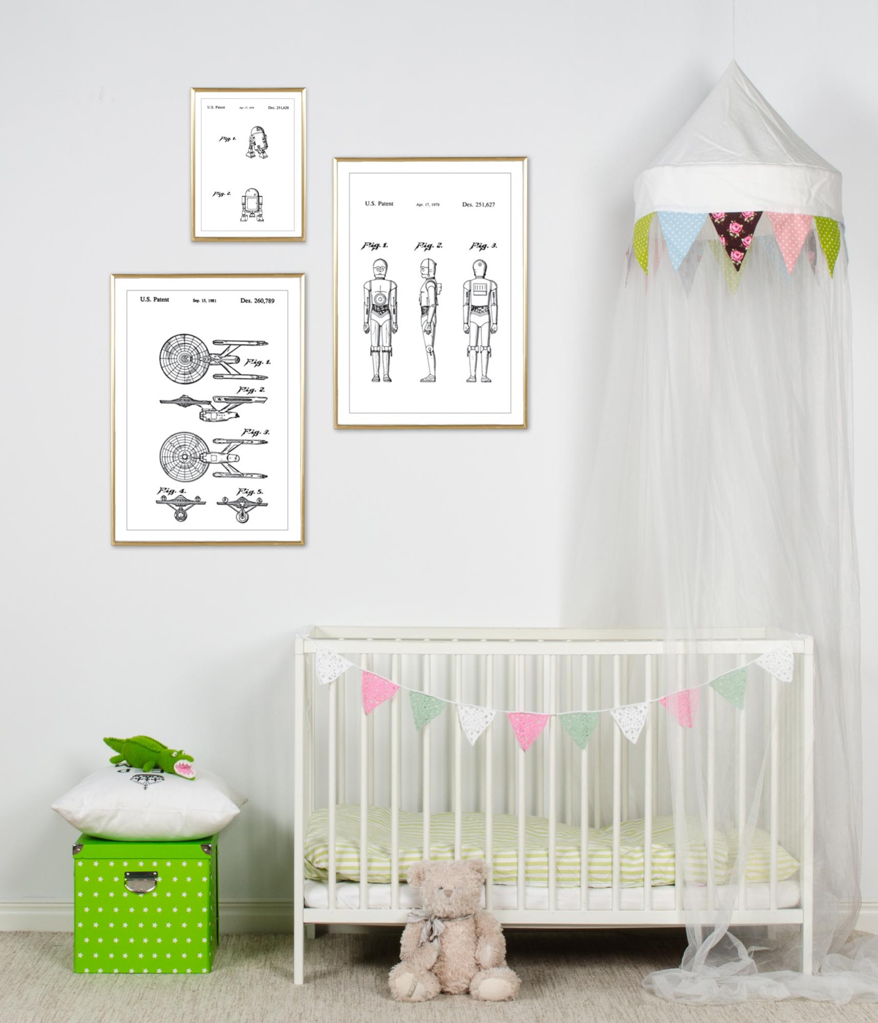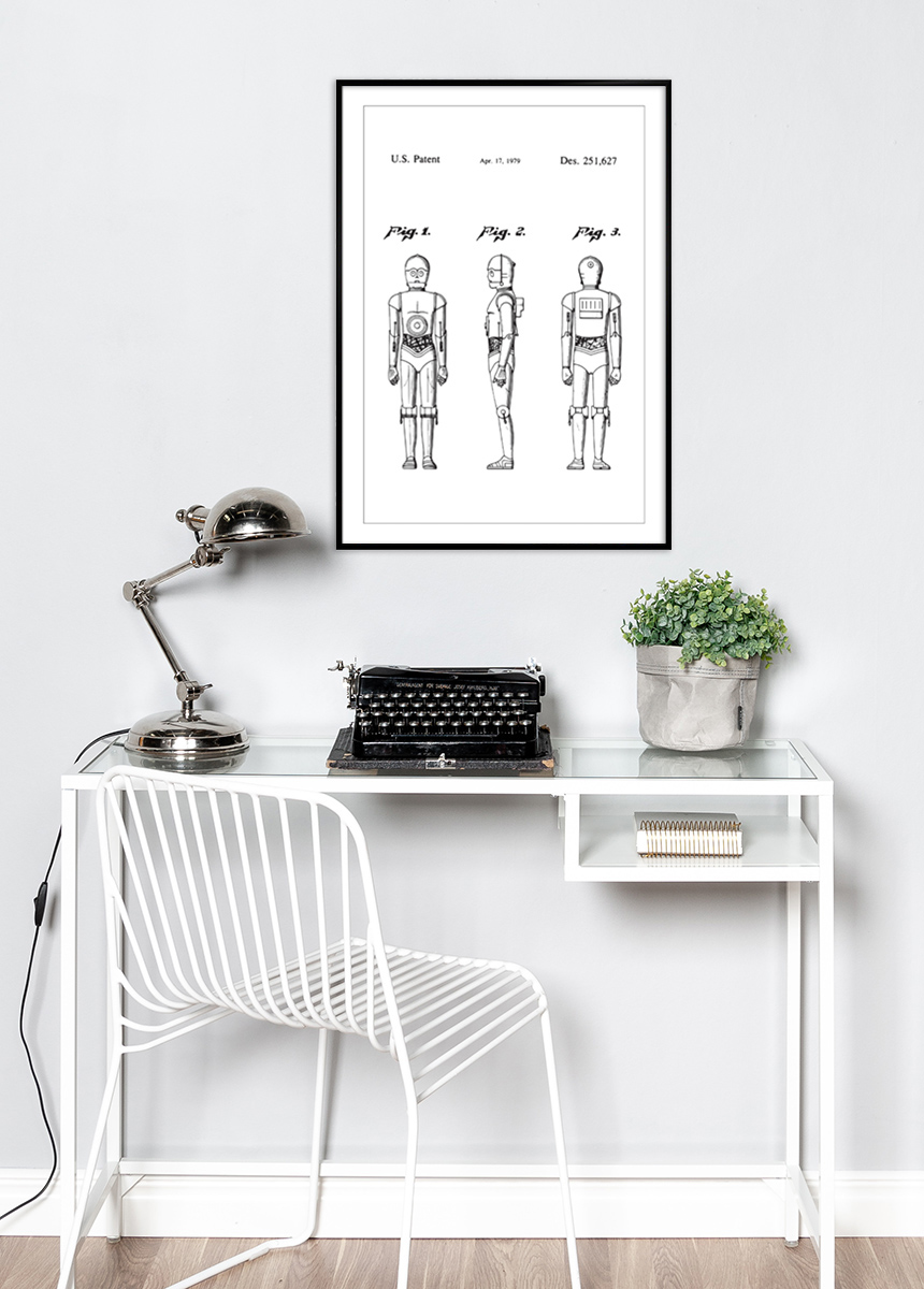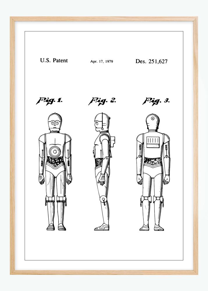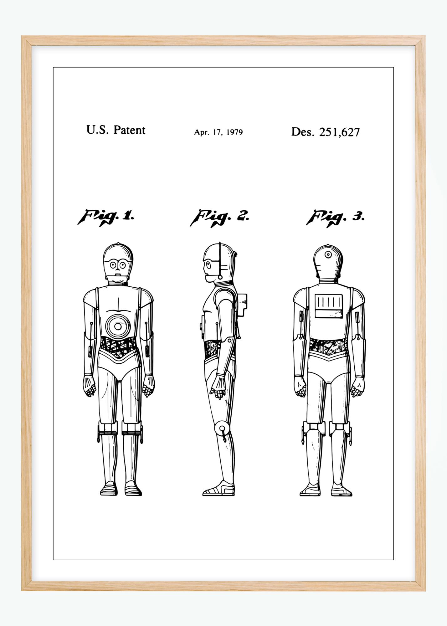 Dieses einzigartige Patentposter zeigt einen C3PO aus StarWars, mit dem U.S. Patent Des. 251,627, erteilt am 17. April 1979. Die Figur ist aus drei verschiedenen Blickwinkeln dargestellt, was einen vollständigen Überblick über das Design bietet. Dieses Poster fängt die frühe Faszination für Robotik und deren potenzielle Anwendungsbereiche ein. Mit seinem detailreichen und technisch gestalteten Bild ist es eine perfekte Wanddekoration für Technikenthusiasten und Fans der Retrofuturismus.