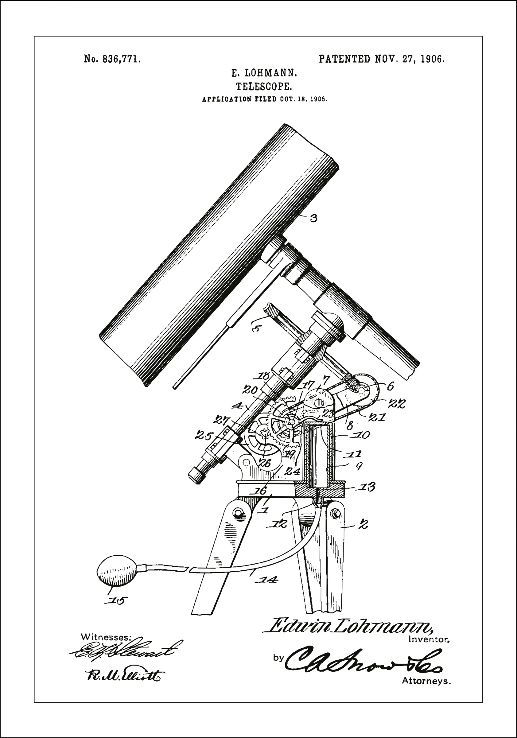 Dieses Patentposter illustriert ein meisterhaftes Design eines Teleskops, eine Erfindung von E. Lohmann, die am 27. November 1906 unter der Nummer 836,771 patentiert wurde. Der Detailreichtum der Zeichnung hebt die technischen Komponenten und die mechanische Komplexität dieses optischen Instruments hervor. Die schwarz-weiße Illustration vor dem schwarzen Hintergrund bietet einen starken visuellen Kontrast, der die technische Eleganz von Lohmanns Design betont und es zu einem begehrten Einrichtungsdetail für alle Wissenschafts- und Astronomieinteressierten macht.