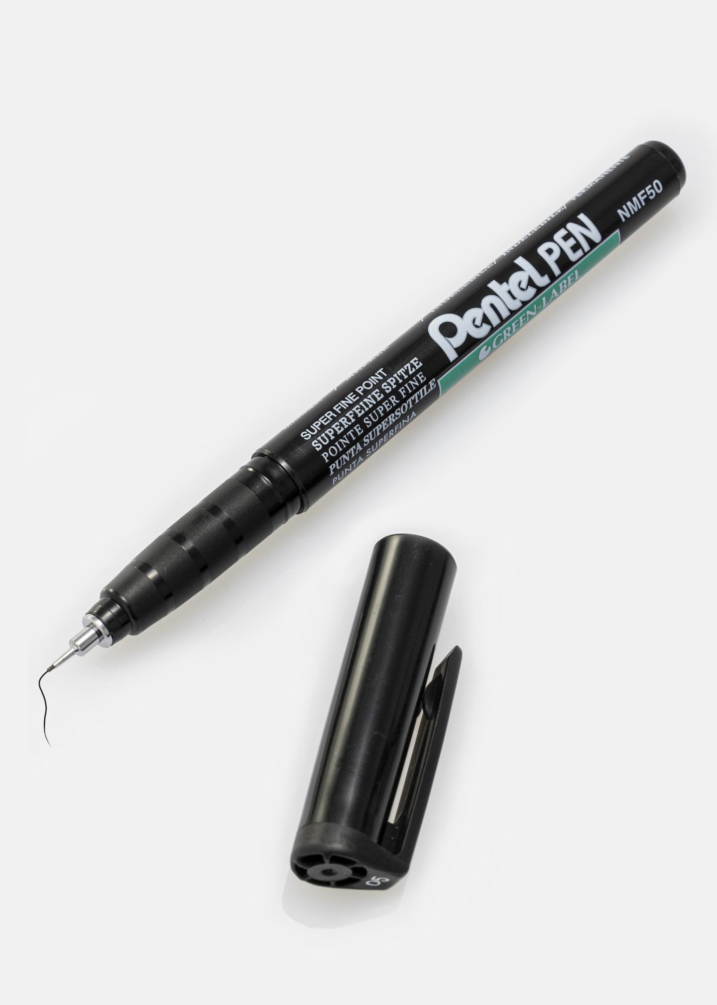 Dünner schwarzer Stift von Pentel mit einer Breite von 0,5 mm an der Spitze, der einen eleganten Eindruck verleiht.