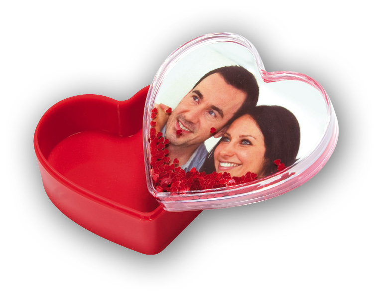 Herzförmiger Fotorahmen, der wie eine "Schneekugel" funktioniert, aber statt den weißen Schneeflocken mit kleinen roten Herzen gefüllt ist. Hinter dem Bilderrahmen ist genügend Platz, um etwas aufzubewahren. Perfekt für eine romantische Überraschung!