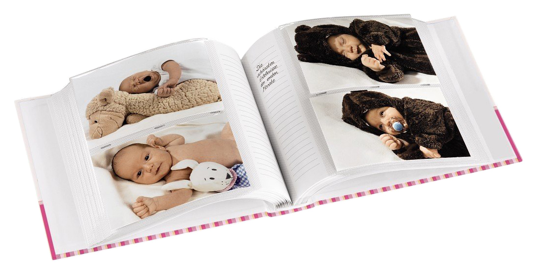 Sammle deine Babybilder in einem verspielt gestalteten Album mit praktischen Fotohüllen! Dieses niedliche Design kombiniert Motive kleiner Kleidungsstücke, Schnuller, Babyflaschen, Kinderwagen, Teddybären und anderer guter Dinge, die im Leben eines kleinen Kindes nicht fehlen dürfen. Die Serie ist in den Farben Blau und Rosa erhältlich.