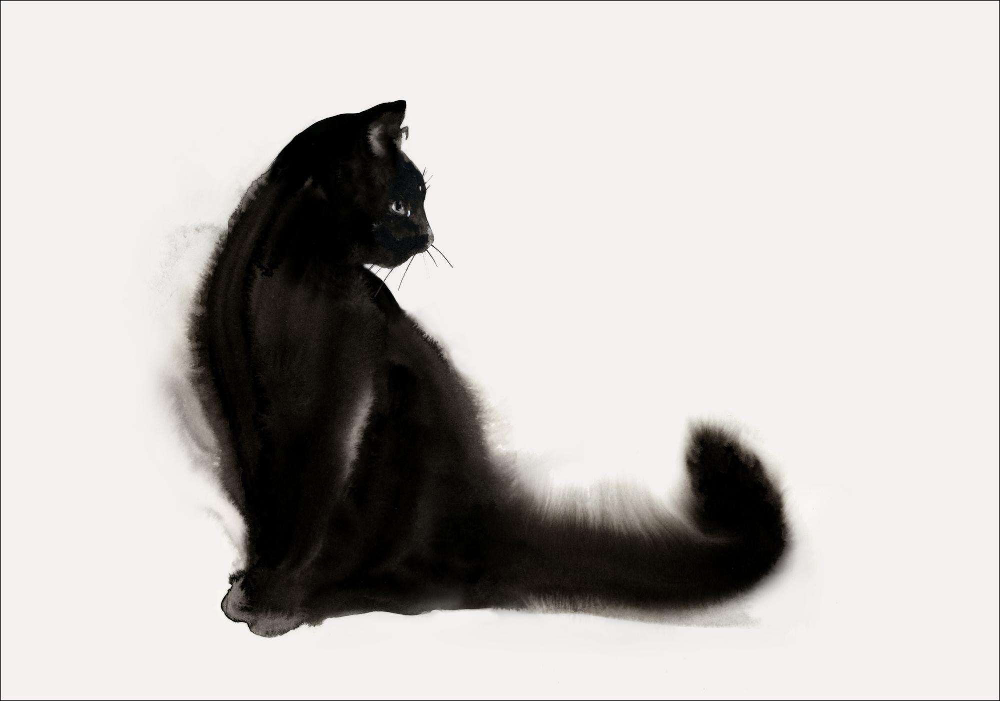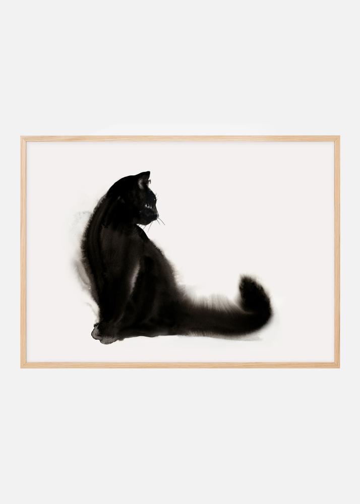 Ein schöner Druck einer schwarzen burmesischen Katze. Auf weißem Hintergrund blickt die schwarze Katze über ihre Schultern, als ob sie etwas beobachten würde. Das natürliche Licht scheint auf die Vorderbeine der Katze, wodurch ein weißer Fleck entsteht. Ein atemberaubendes Bild für Katzenliebhaber.