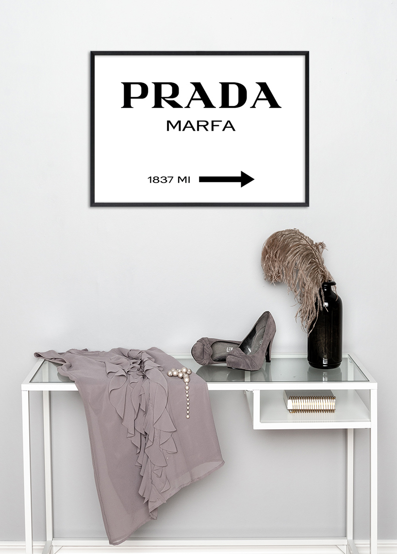 Poster mit einem Wegweiser zum permanenten Kunstwerk Prada Marfa, geschaffen von den Künstlern Elmgreen und Dragset. Die Installation wurde am ersten Oktober 2005 eingeweiht und soll einem Pradageschäft ähneln. Der schwarz-weiße print passt sowohl zum Kunstliebhaber als auch zu dem, der die Modewelt mag, und kann vorteilhaft zusammen mit anderen plakat mit grafischen Motiven aufgehängt werden. Ergänzen Sie mit einem einfachen schwarzen oder weißen Bilderrahmen, der den Text für sich sprechen lässt und der in die meisten Umgebungen passt.