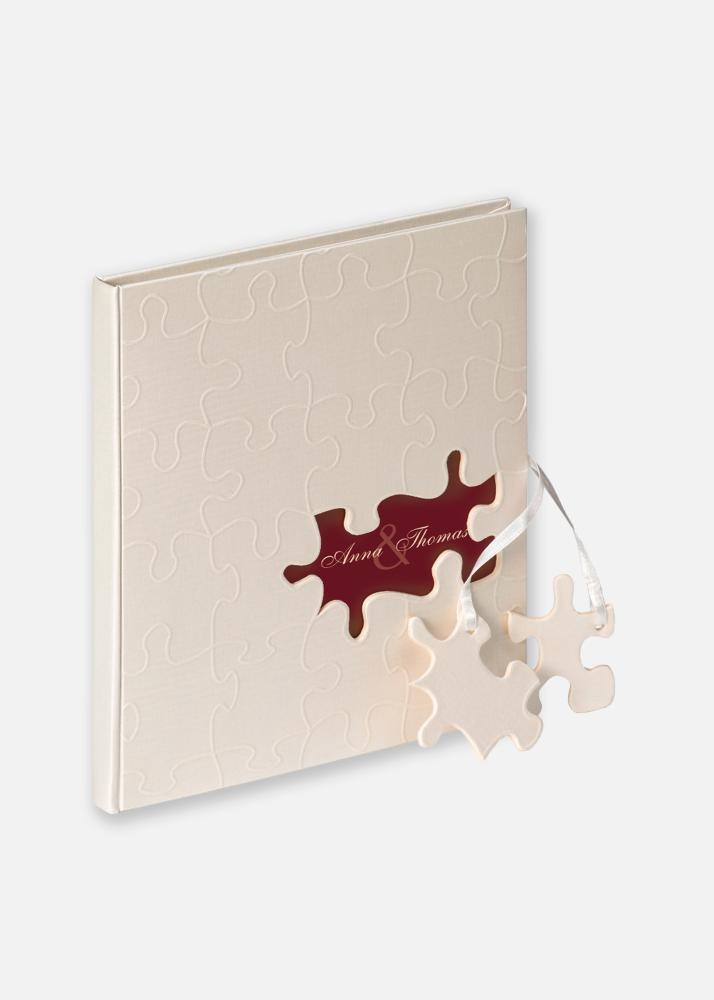 Gästebuch mit weißem und rotem Leineneinband. Auf der Vorderseite des Gästebuchs ist Platz für ein persönliches Bild oder die Namen des Brautpaares. Auch als passendes Hochzeitsalbum für deine Hochzeitsbilder erhältlich.