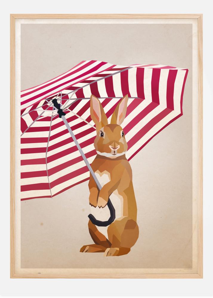 Ein niedliches Kunstwerk mit einem Kaninchen, das einen Regenschirm zwischen seinen beiden oberen Gliedmaßen hält. Das braun-weiße Kaninchen hält vor einem beigen Hintergrund einen rot-weißen Regenschirm. Mit den Augen des Kaninchens, die direkt in die Kamera schauen, ist dies der perfekte Druck für das Schlafzimmer Ihres Kindes.