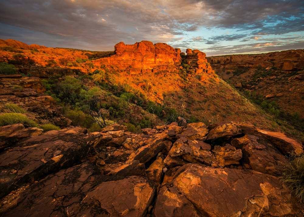 Poster mit einem Fotografie von kargen roten Bergen bei Sonnenuntergang, etwas für denjenigen, der Wüsten und Felsformationen mag, um an die Wand zu hängen. Die warmen roten Töne gegen den eisblauen Himmel und die Tiefe im Bild schaffen ein interessantes Motiv. Rahmen Sie das poster mit einem stilvollen Fotorahmen ein und platzieren Sie es an einer Bildwand zusammen mit anderen Wüstenmotiven.