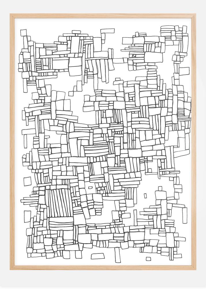 Ein Musterposter aus geometrischen Quadraten in schwarzen Linien auf weißem Hintergrund. Hunderte von kleinen Quadraten und Rechtecken verbinden sich zu einem seltsamen Muster. Schauen Sie es sich an und versuchen Sie, die Muster und Formen darin zu finden, um eine überzeugende Ergänzung für Ihr Zuhause zu schaffen.