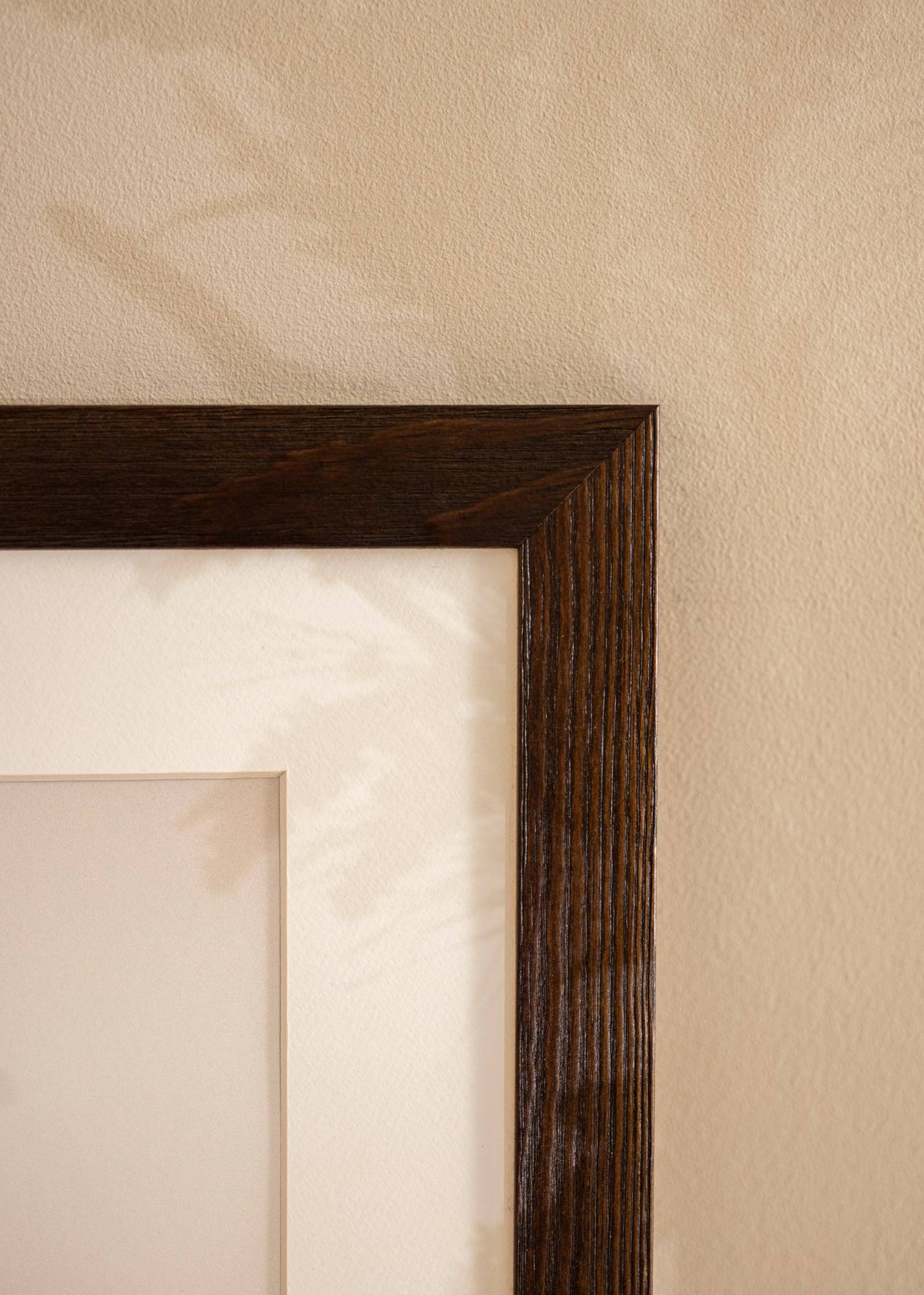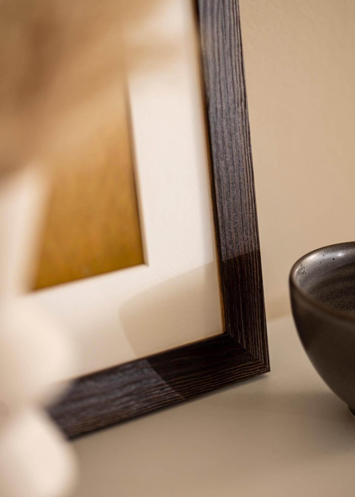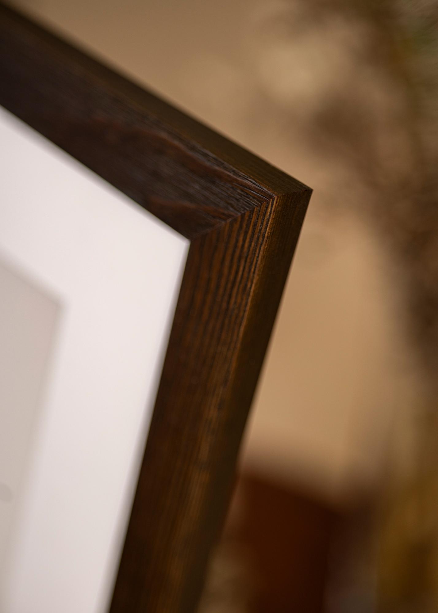 Gediegener brauner Holzrahmen mit sichtbarer Holzmaserung und einem breiten Profil. Perfekt, wenn du einen dunklen Holzrahmen suchst, der ein natürliches Gefühl verleiht. Gut geeignet für Ambientefotos und Landschaftsbilder.