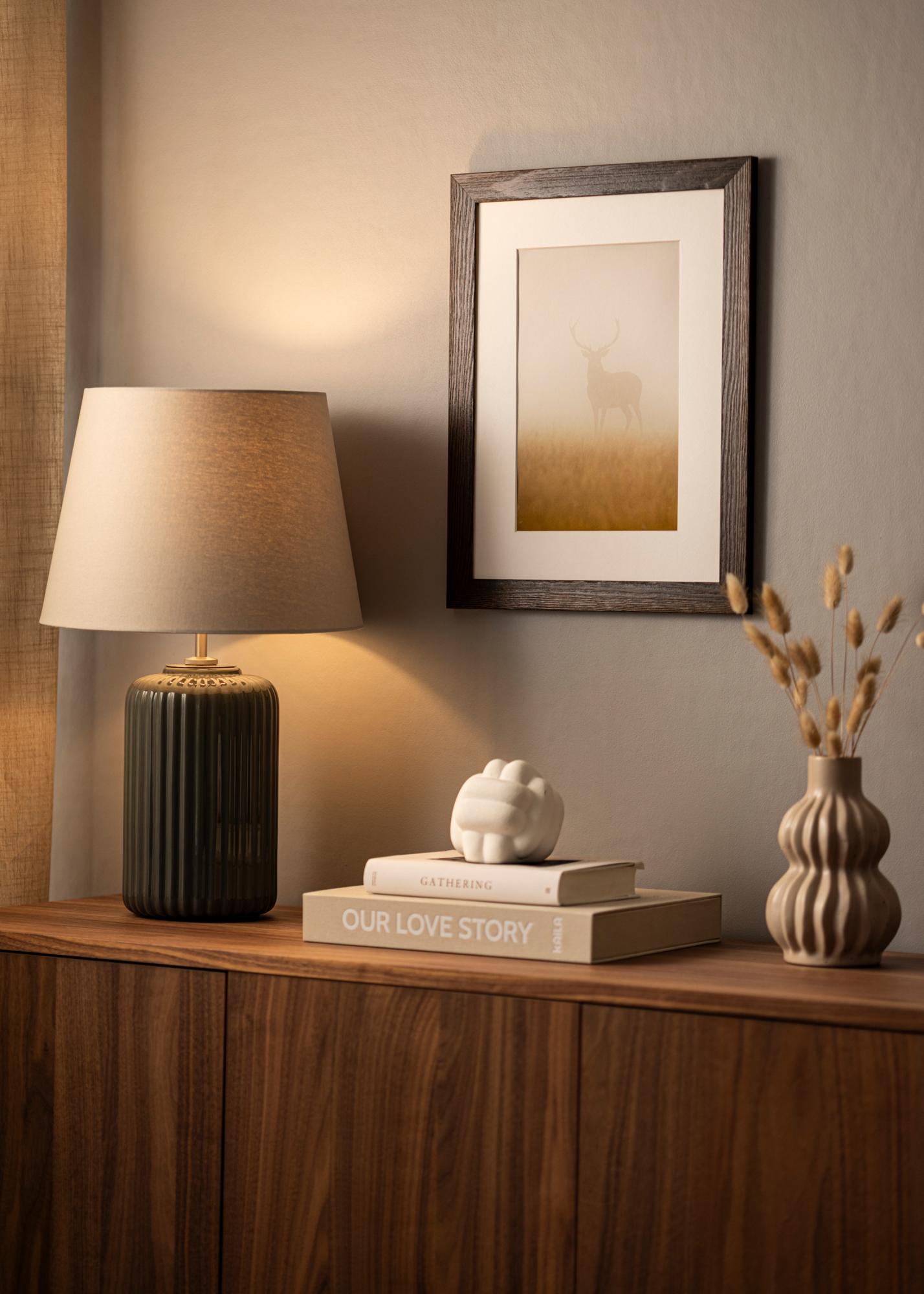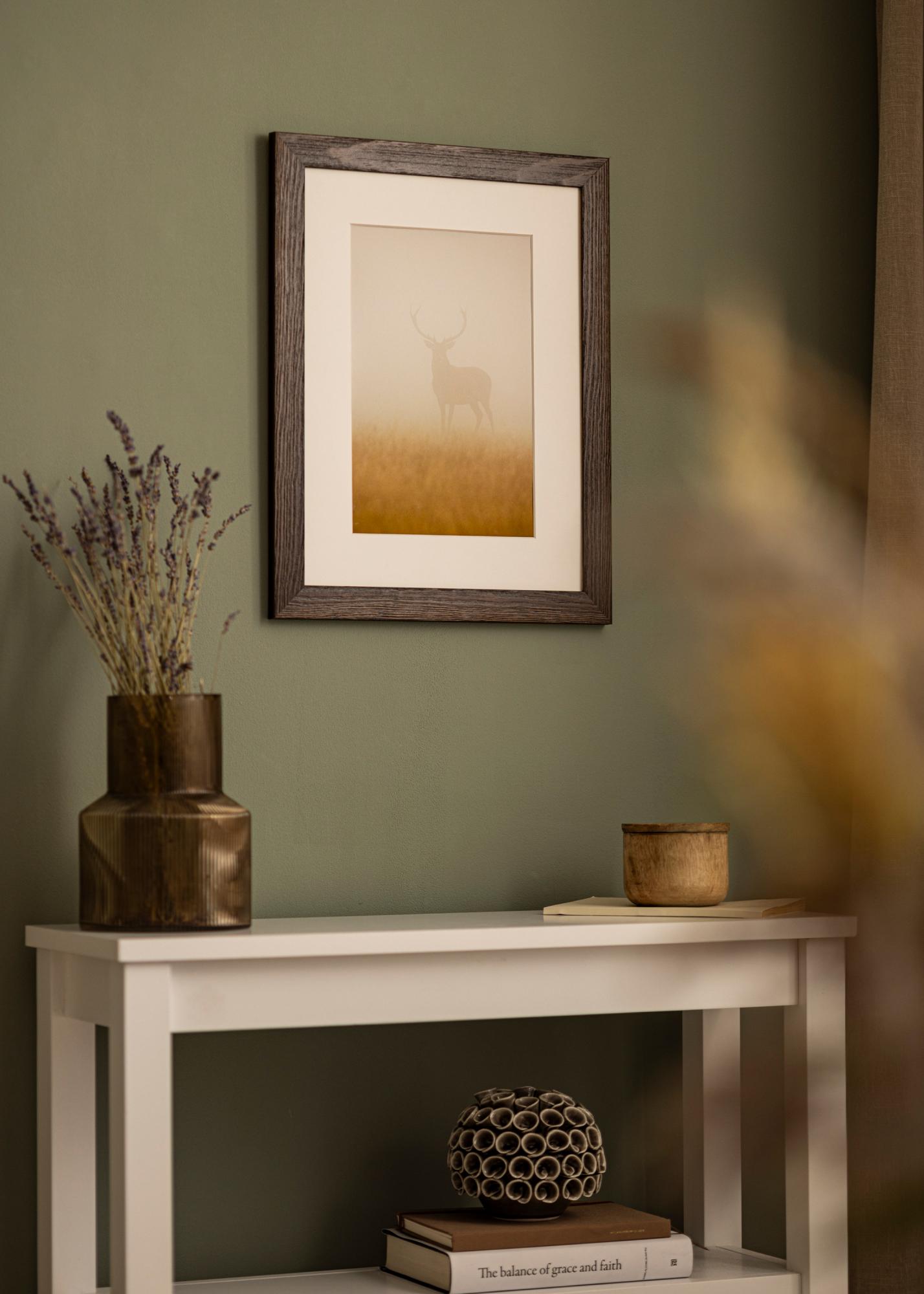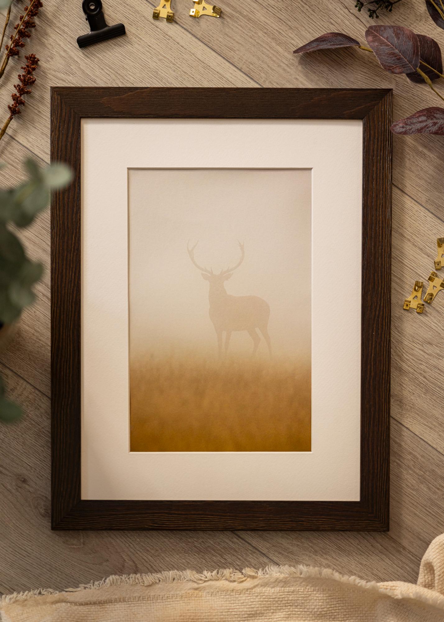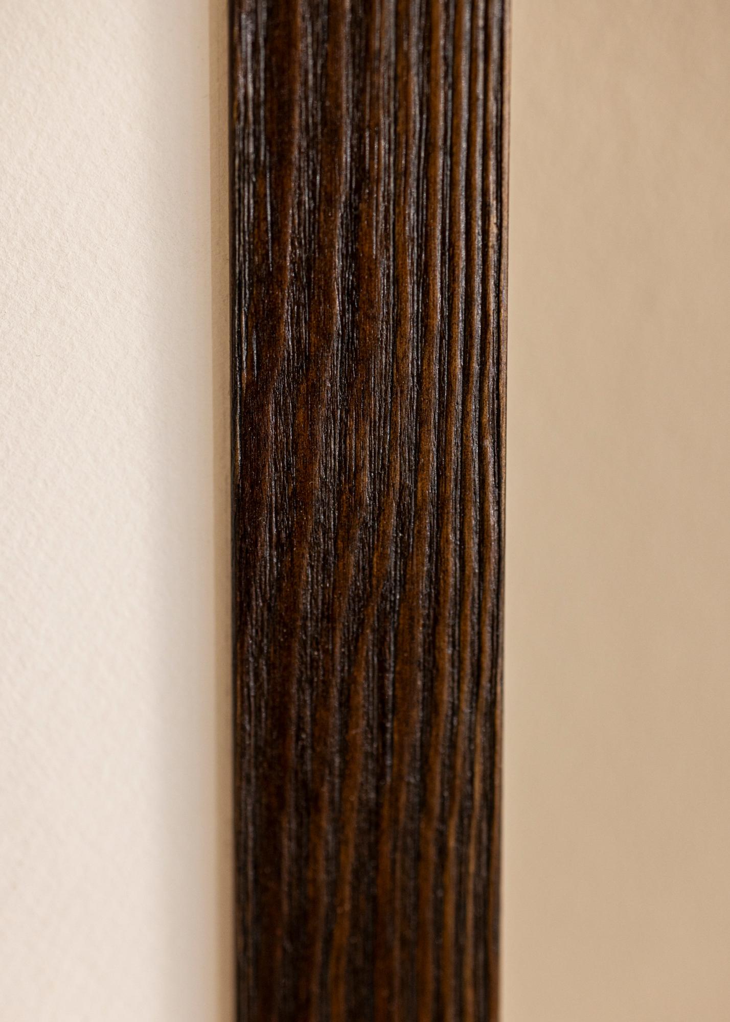Gediegener brauner Holzrahmen mit sichtbarer Holzmaserung und einem breiten Profil. Perfekt, wenn du einen dunklen Holzrahmen suchst, der ein natürliches Gefühl verleiht. Gut geeignet für Ambientefotos und Landschaftsbilder.