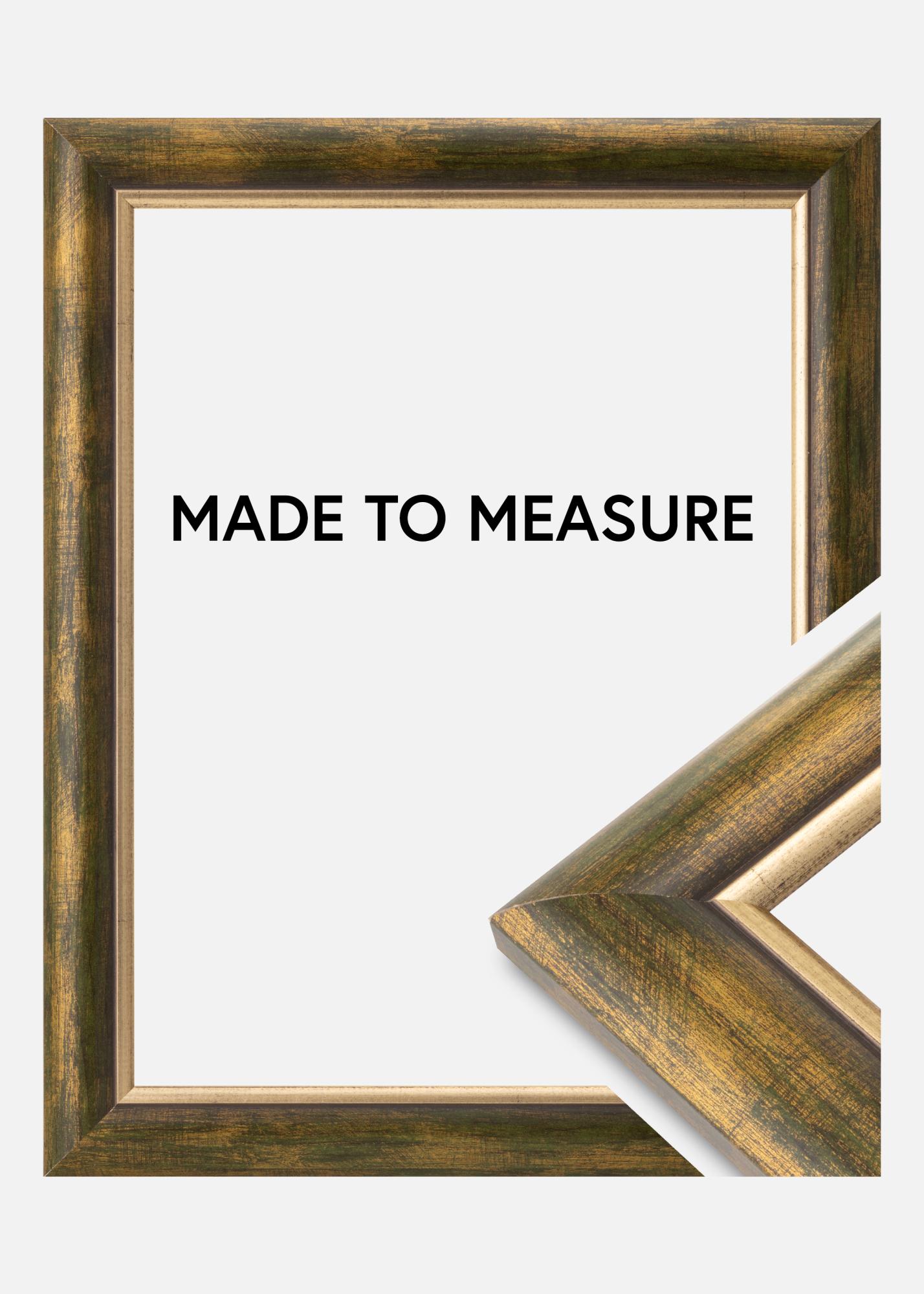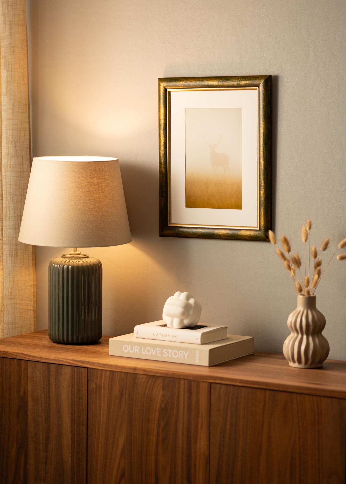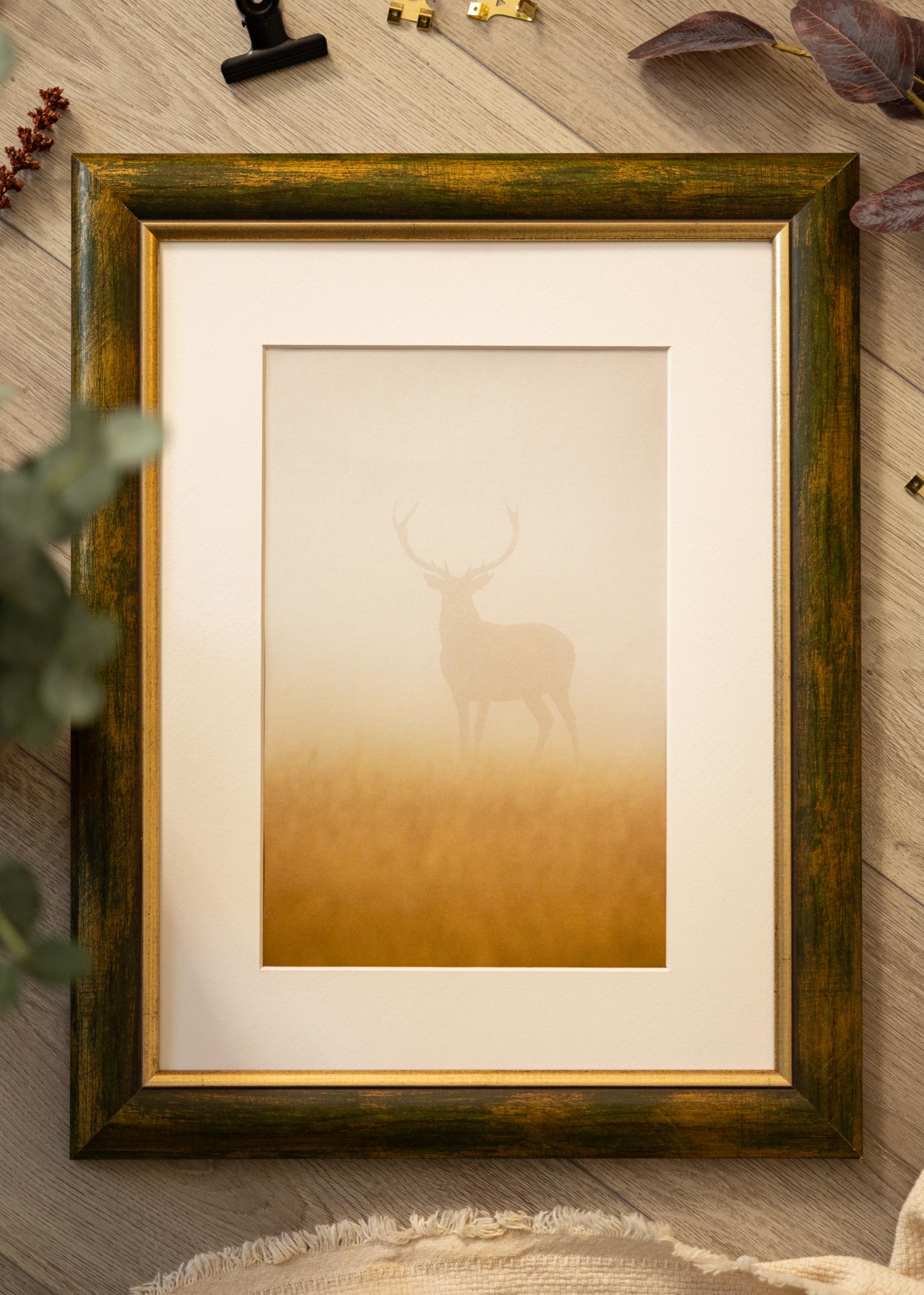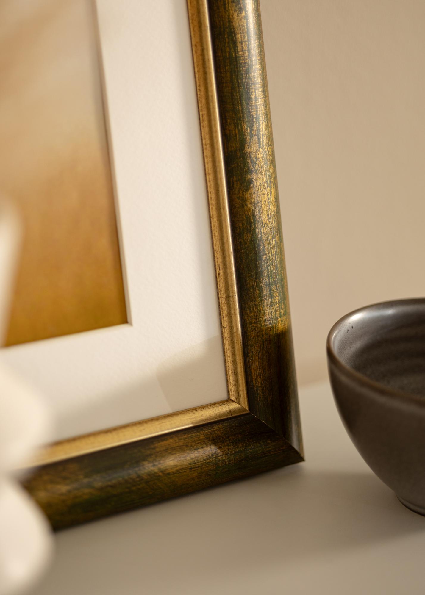 Zeitloser Holzrahmen aus Finnland mit einer schönen grüngetönten Holzoberfläche mit einem goldenen Rand, der direkt am Motiv verläuft und dem Motiv ein harmonisches Gefühl verleiht. Der Bilderrahmen hat ein breites Profil von 41 mm und ist 19 mm tief, was ihm eine zusätzliche Dimension verleiht.