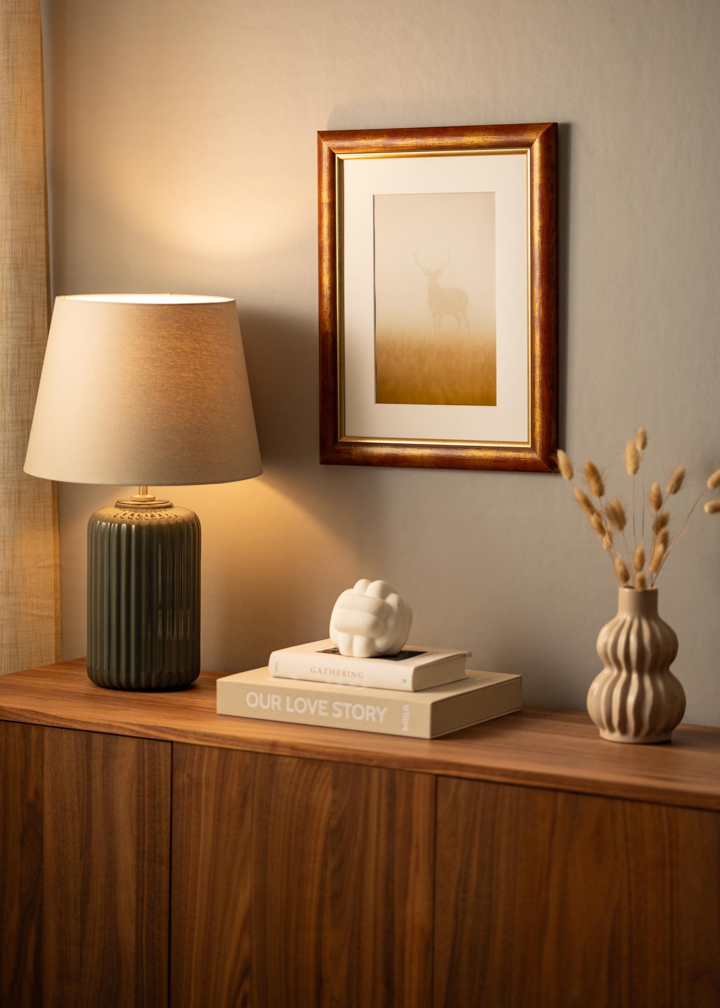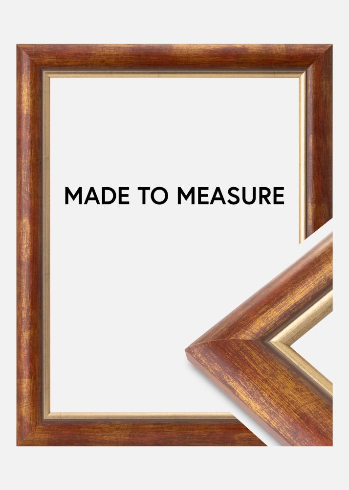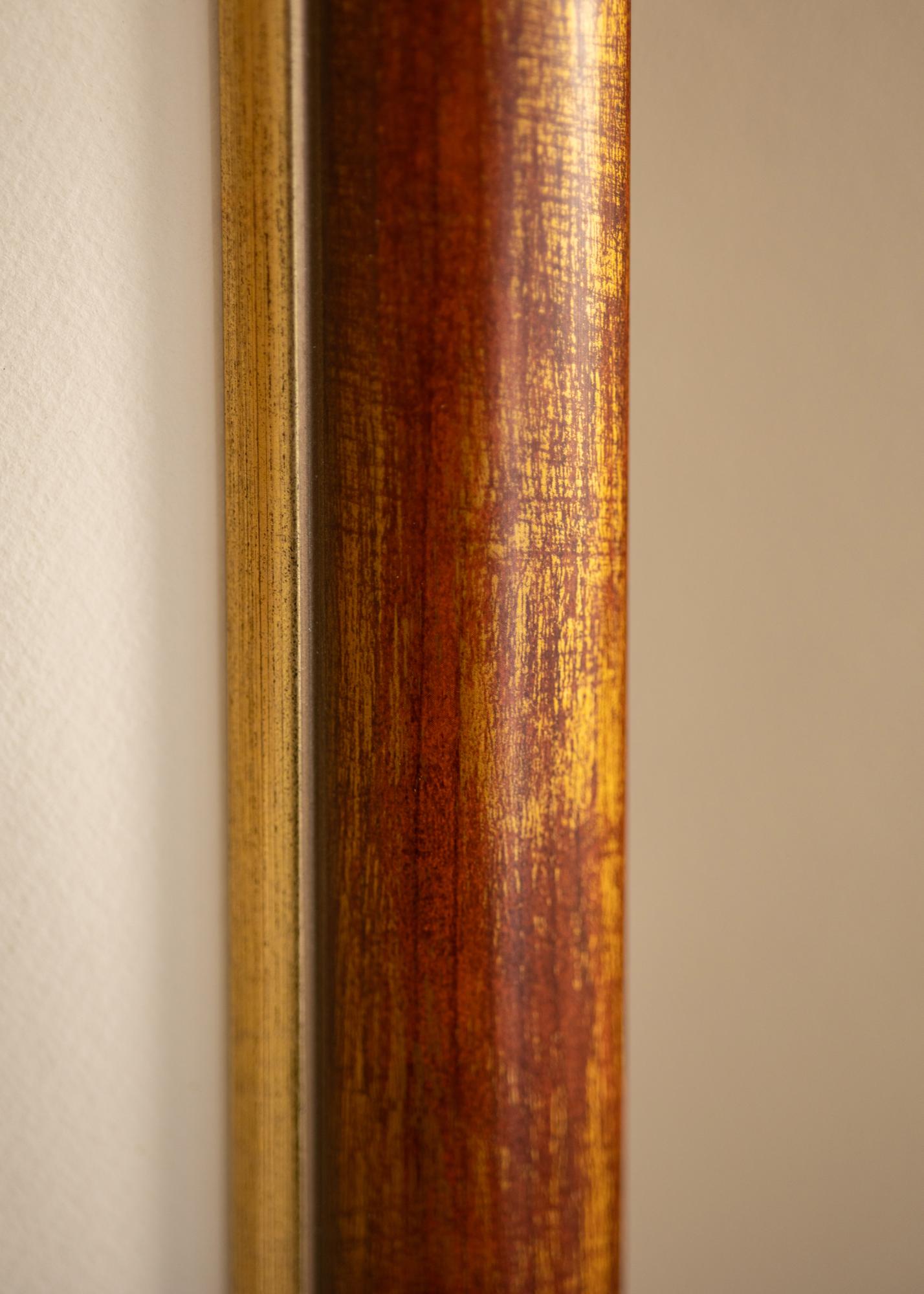 Zeitloser Holzrahmen aus Finnland mit schöner rotgetönter Holzoberfläche und einem goldenen Rand, der direkt am Motiv verläuft und ein harmonisches Gefühl erzeugt. Der Bilderrahmen hat ein breites Profil von 41 mm und ist 19 mm tief, was ihm eine zusätzliche Dimension verleiht.