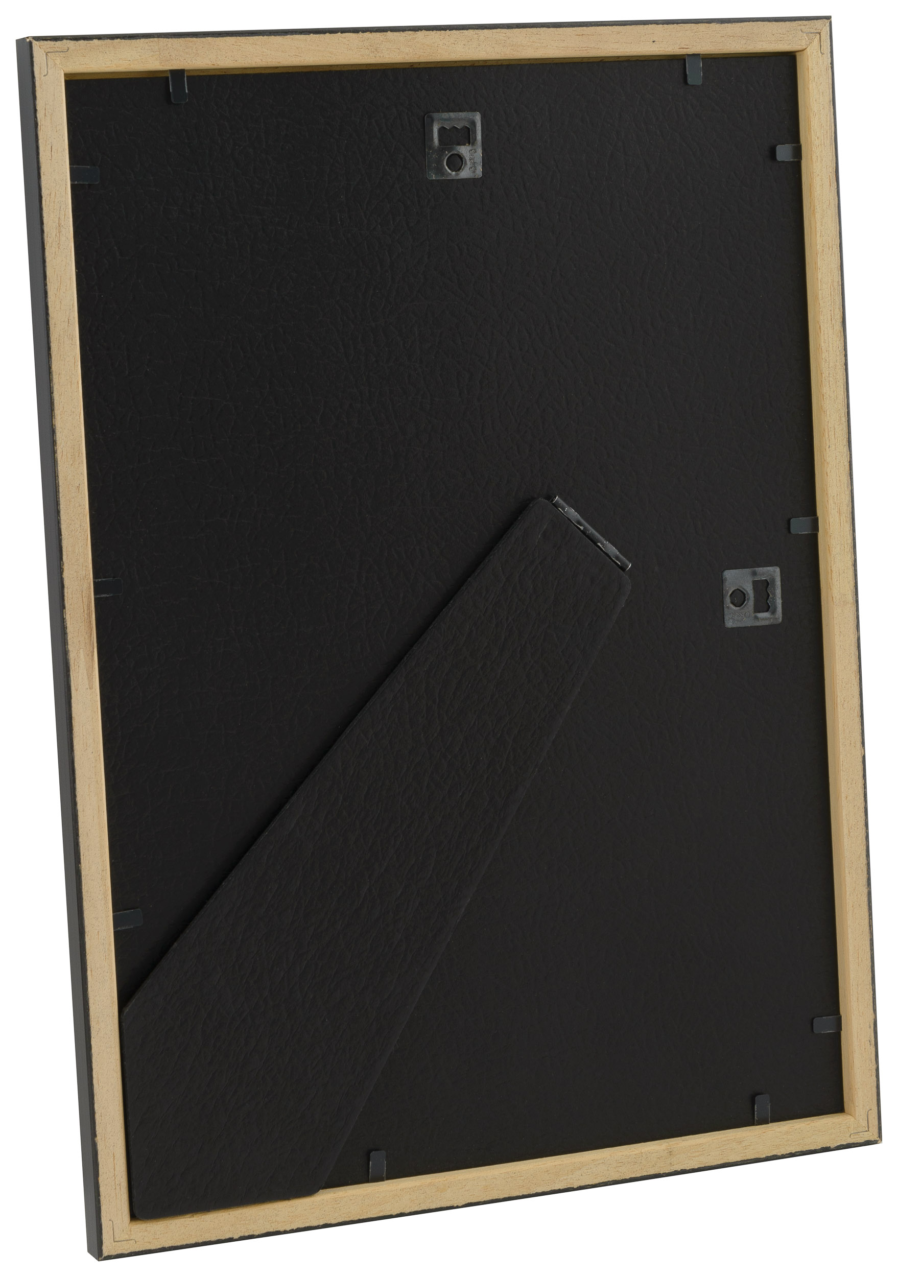 Platziere dein Foto, dein Gemälde oder dein Poster in diesen stilvollen Bilderrahmen! Der Bilderrahmen besteht aus schwarz bemaltem Holz und ist mit Antireflexglas ausgestattet. Das Rückenteil und das Stützbein sind mit schwarzem Kunstleder bezogen, wodurch ein besonders luxuriöses Gefühl vermittelt wird.