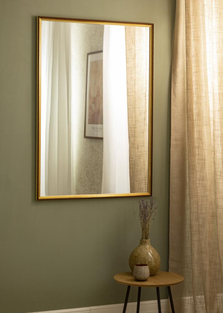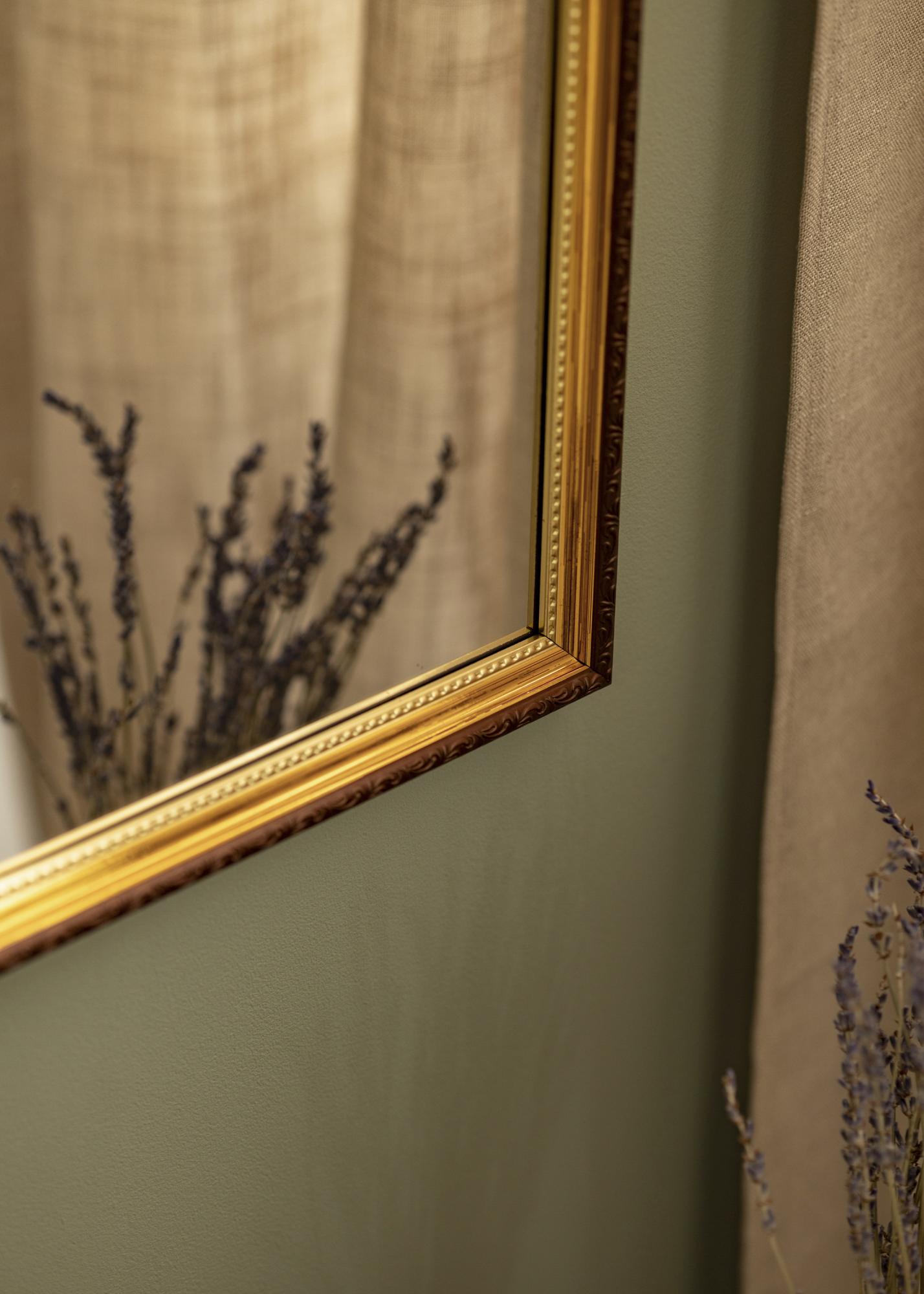 Der Spiegel Abisko Gold ist ein schöner Wandspiegel für alle, die sich einen dekorativen, eleganten Spiegel im Retro-Stil wünschen. Der Spiegel ist mit einem Rahmen in braunem Farbton ausgestattet. Am Spiegelausschnitt verstärkt die goldene Farbnuance das Retro-Design und den ansprechenden Ausdruck dieses hübschen Wohnspiegels. Die Rahmenleiste hat eine Breite von 25 mm und das stilvolle Ornament-Muster macht diesen Wandspiegel zu einem echten Blickfang, der sowohl in Wohnzimmer als auch in Schlafzimmer oder Eingangsbereich passt.