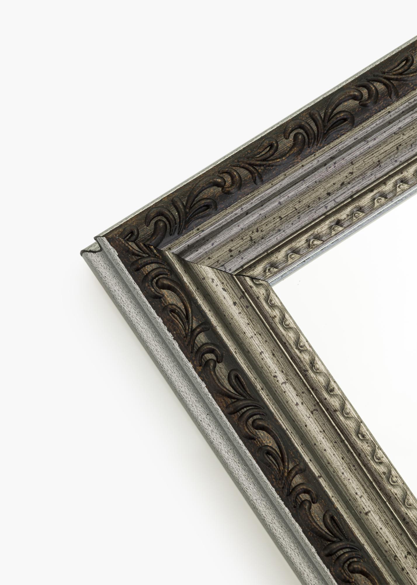 Dieser Wandspiegel überzeugt durch seinen schönen Rahmen in stilvollem, silbernem Farbton, der durch eine schwarze Kante dezent betont wird. Die elegante Farbgebung dieses Wandspiegels ergänzt sich wunderbar mit dem Ornament-Muster des Rahmenprofils, wodurch ein sehr ansprechender, stilsicherer Gesamteindruck entsteht. Die Rahmenleiste hat eine Breite von 25 mm. Der Rahmen ist aus Komposit, einem Kunststoffverbundmaterial, gefertigt.