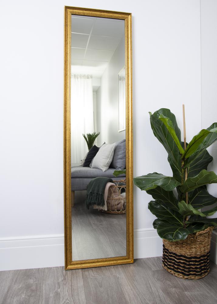 Stilvoll profilierter Goldspiegel mit einer antik-behandelten Oberfläche, die den Rahmen lebendiger erscheinen lässt. Der Spiegel passt genauso gut in ein Zuhause mit stilvollen Möbeln wie in einen glamourösen begehbaren Kleiderschrank, da er nicht so viel Platz einnimmt, aber dennoch den ganzen Körper zeigt. Kombiniere den Spiegel mit Einrichtungsdetails in Messing- oder Goldfarbe, um ein harmonisches Gesamtbild im Interieur zu schaffen und den Spiegel hervorzuheben.
