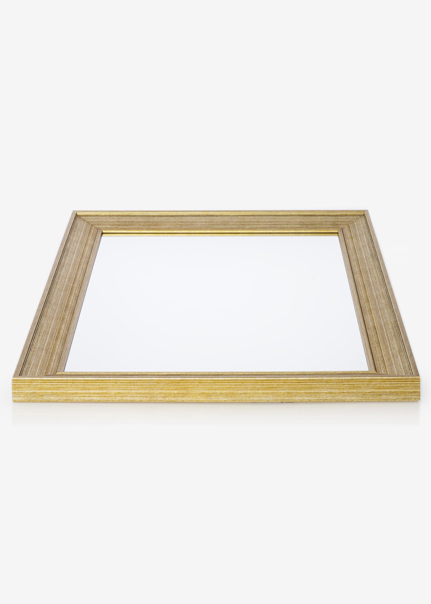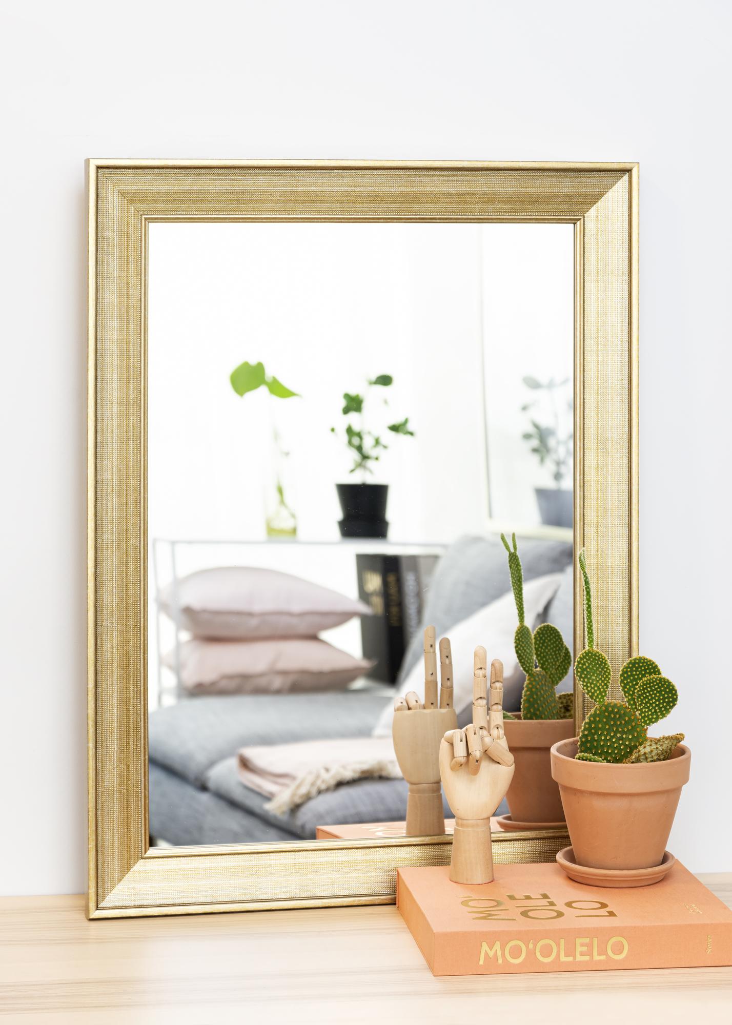 Vergolde deine Wand mit einem schönen Goldspiegel und anderen Gegenständen im selben Farbton. Dieses Modell hat einen Rahmen mit einem klassisch profiliertem Teil, der direkt neben dem Glas und an den Außenkanten verläuft, während der breite Mittelteil eine Textur aufweist, die an kleine Goldketten erinnert.