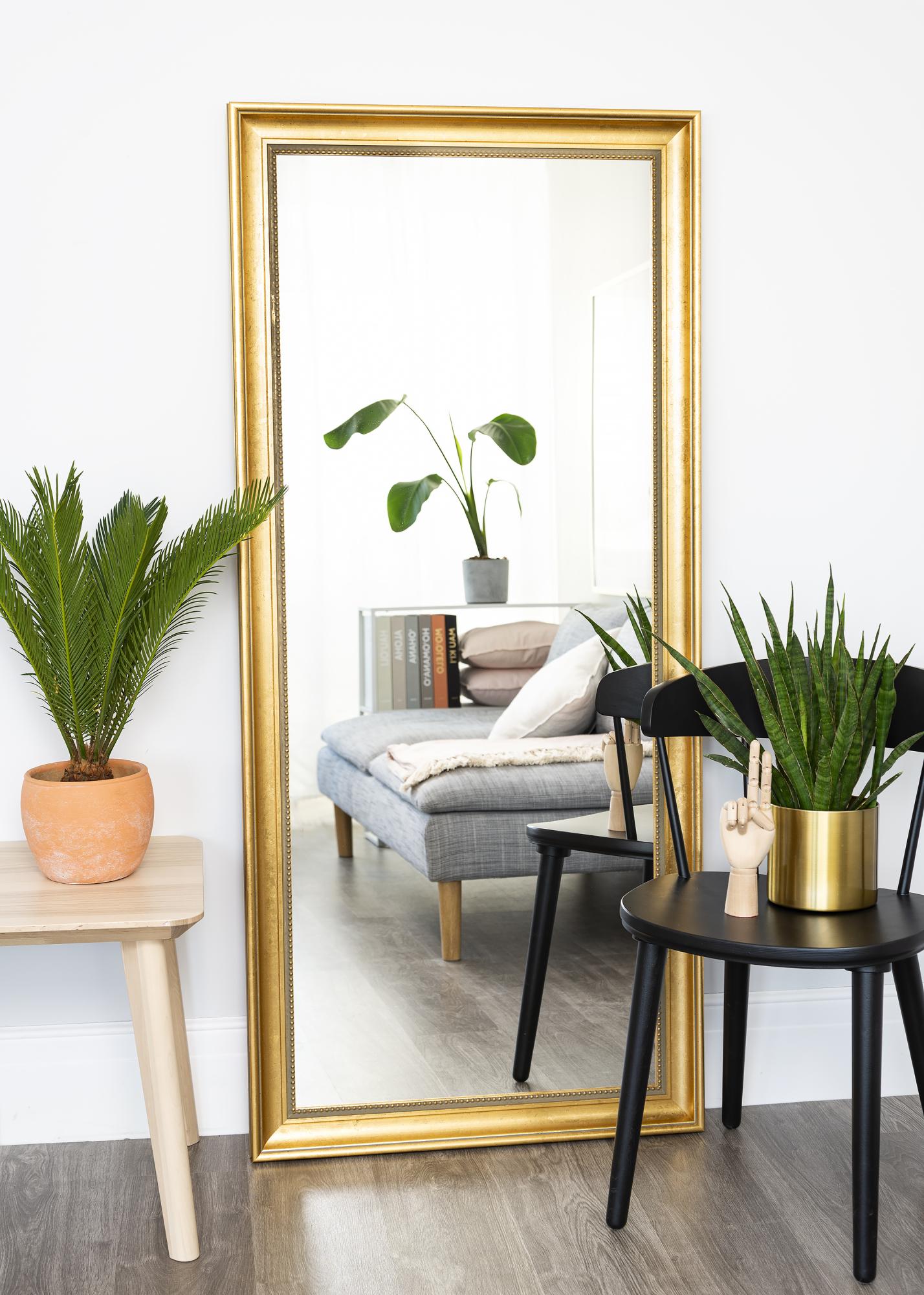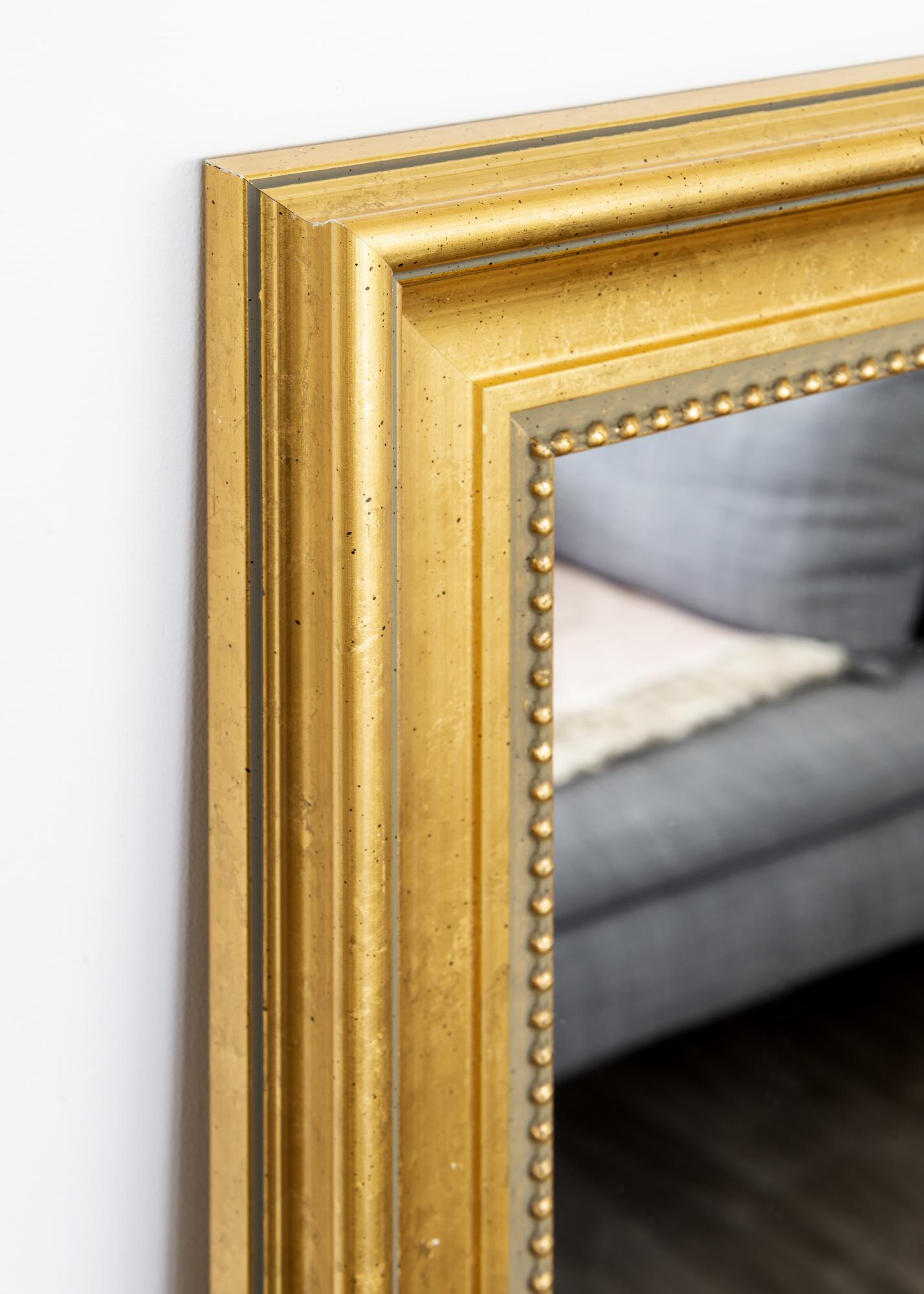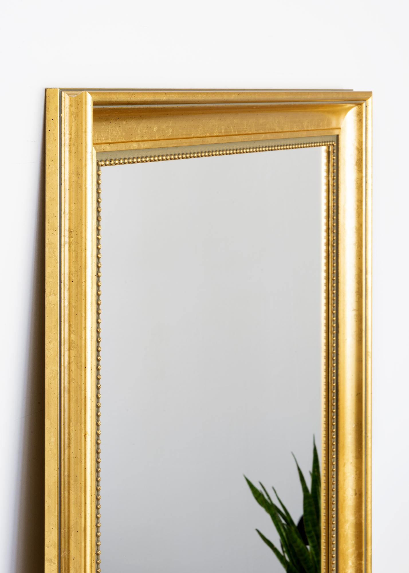 Kaufen Sie sich einen edlen Spiegel und verleihen Sie Ihrem Flur, Ihrem Wohnzimmer oder Ihrem Badezimmer ein besonders luxuriöses Flair! Dieser stilvolle Spiegel ist in diversen Größen erhältlich, sodass Sie schnell und einfach die Ausführung finden, die genau für Ihre Zwecke geeignet ist. Der Spiegelrahmen hat ein klassisches Design mit breitem Profil und einem diskreten Perlenmuster, das um das Glas verläuft. Das Holz stammt aus nachhaltiger Forstwirtschaft und hat eine wunderschöne, goldfarbene Patina.