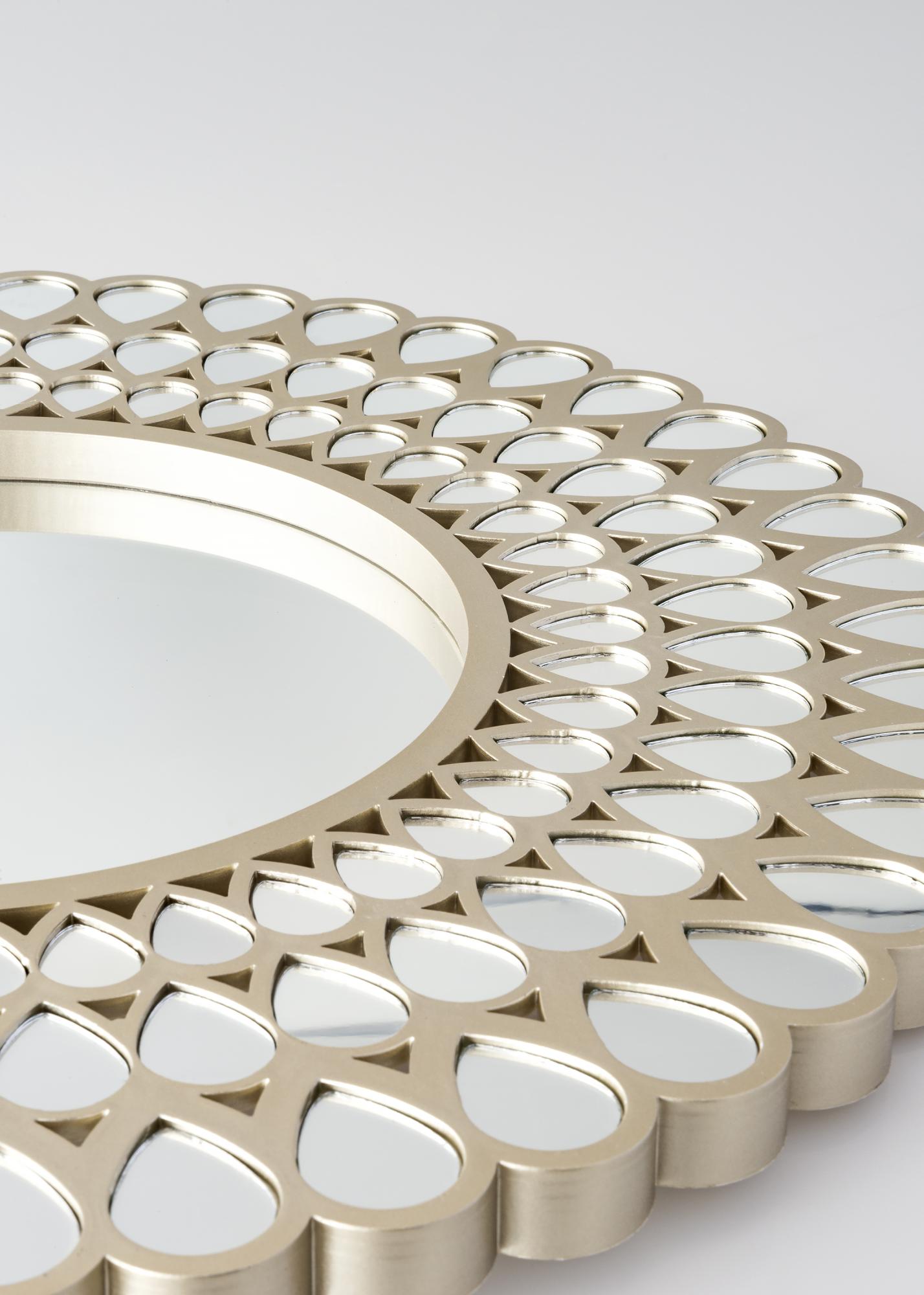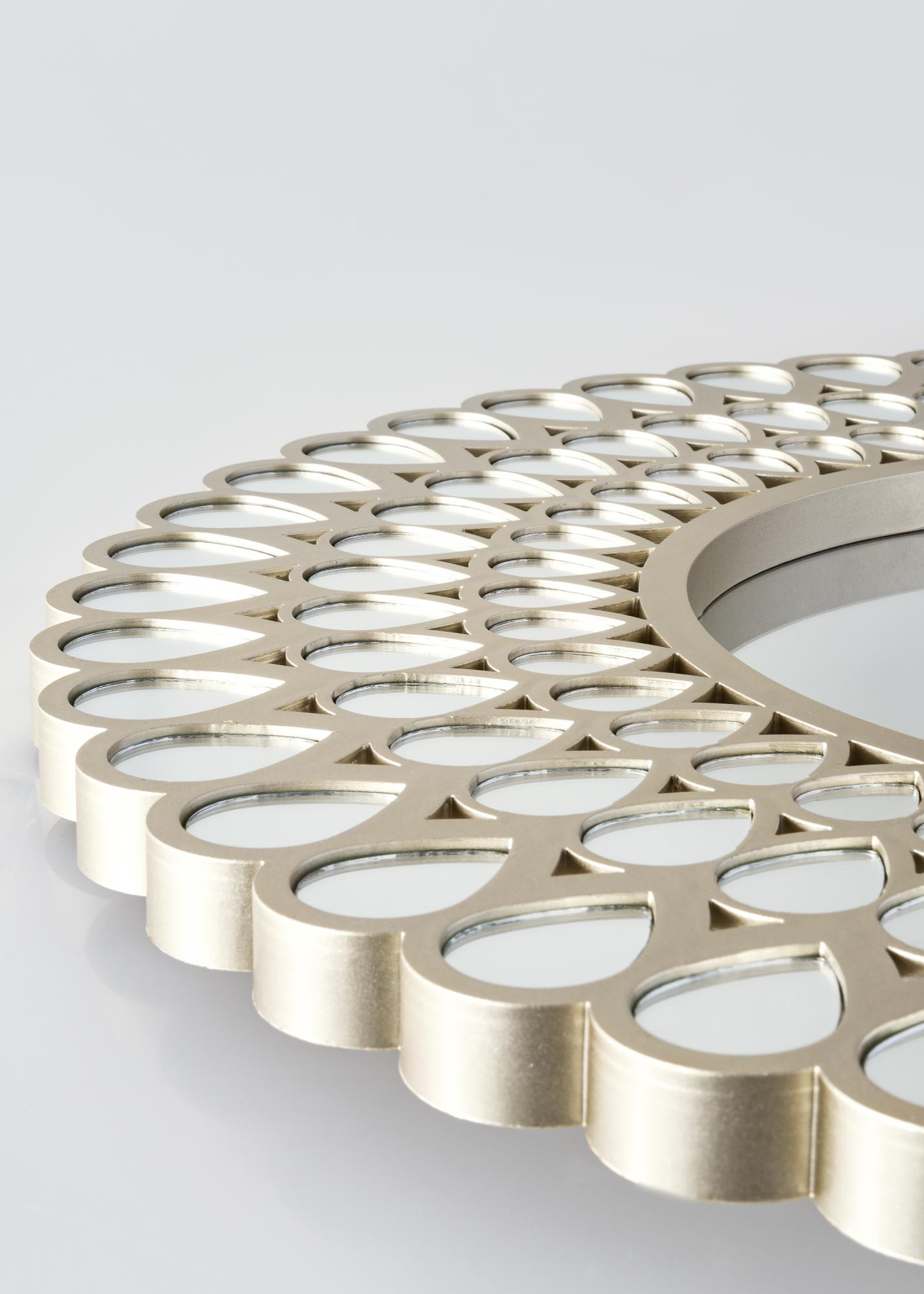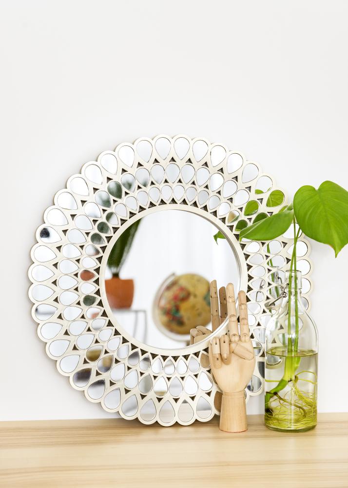 Das Spiegelmodell Bea ist ein runder Wandspiegel in aufwendigem, sehr dekorativem Design. Der silberfarbene Rahmen setzt sich seinerseits aus kleinen, tropfenförmigen Spiegeln zusammen, was dem Ganzen Eleganz und eine besondere, exklusive Note verleiht.