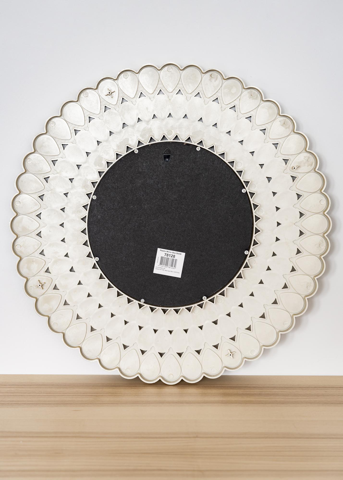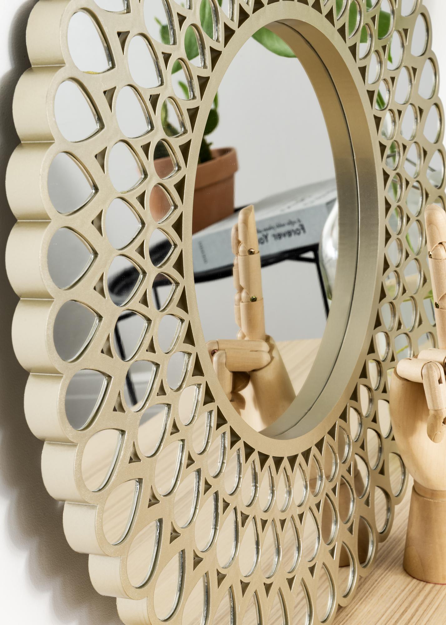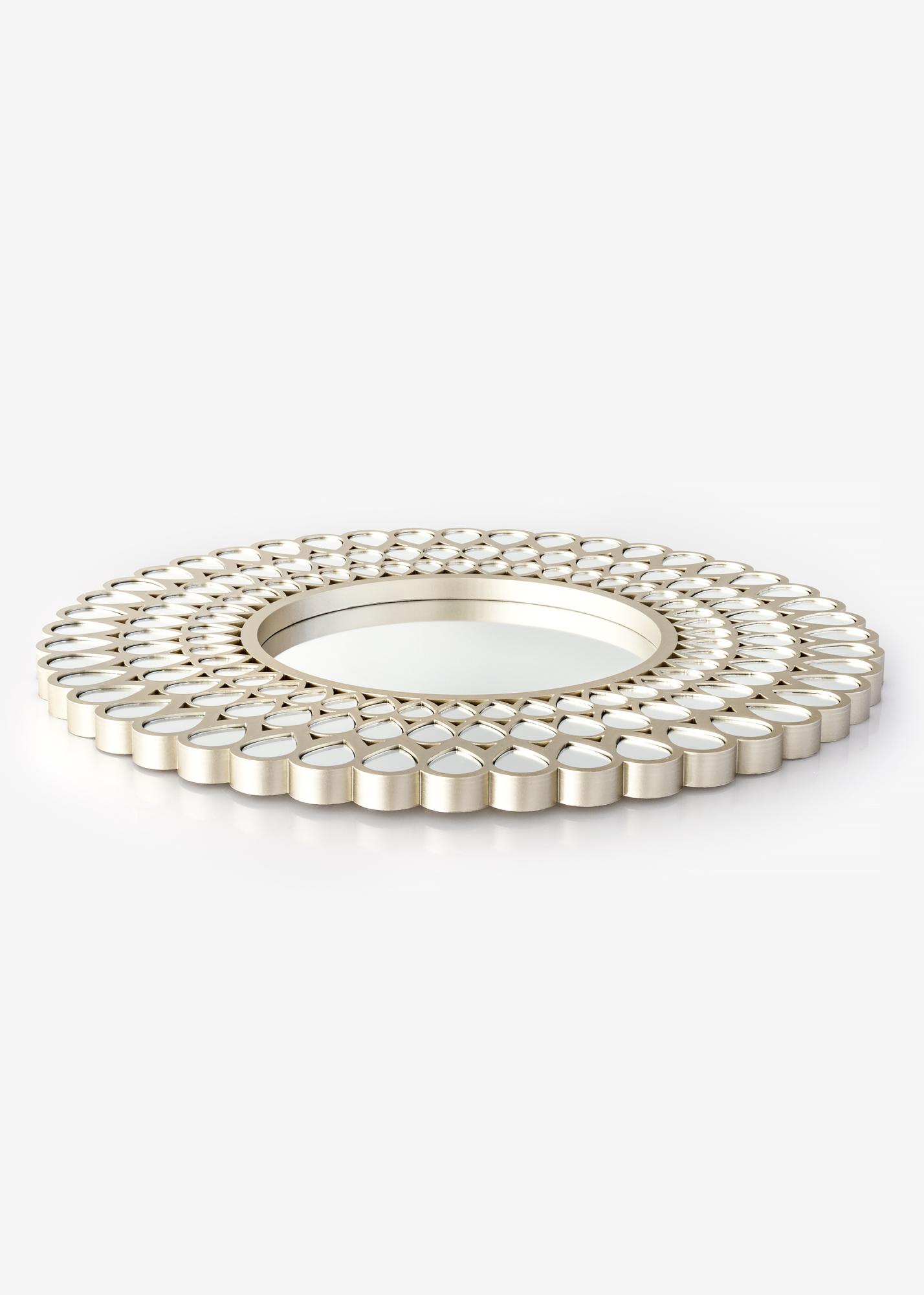 Das Spiegelmodell Bea ist ein runder Wandspiegel in aufwendigem, sehr dekorativem Design. Der silberfarbene Rahmen setzt sich seinerseits aus kleinen, tropfenförmigen Spiegeln zusammen, was dem Ganzen Eleganz und eine besondere, exklusive Note verleiht.