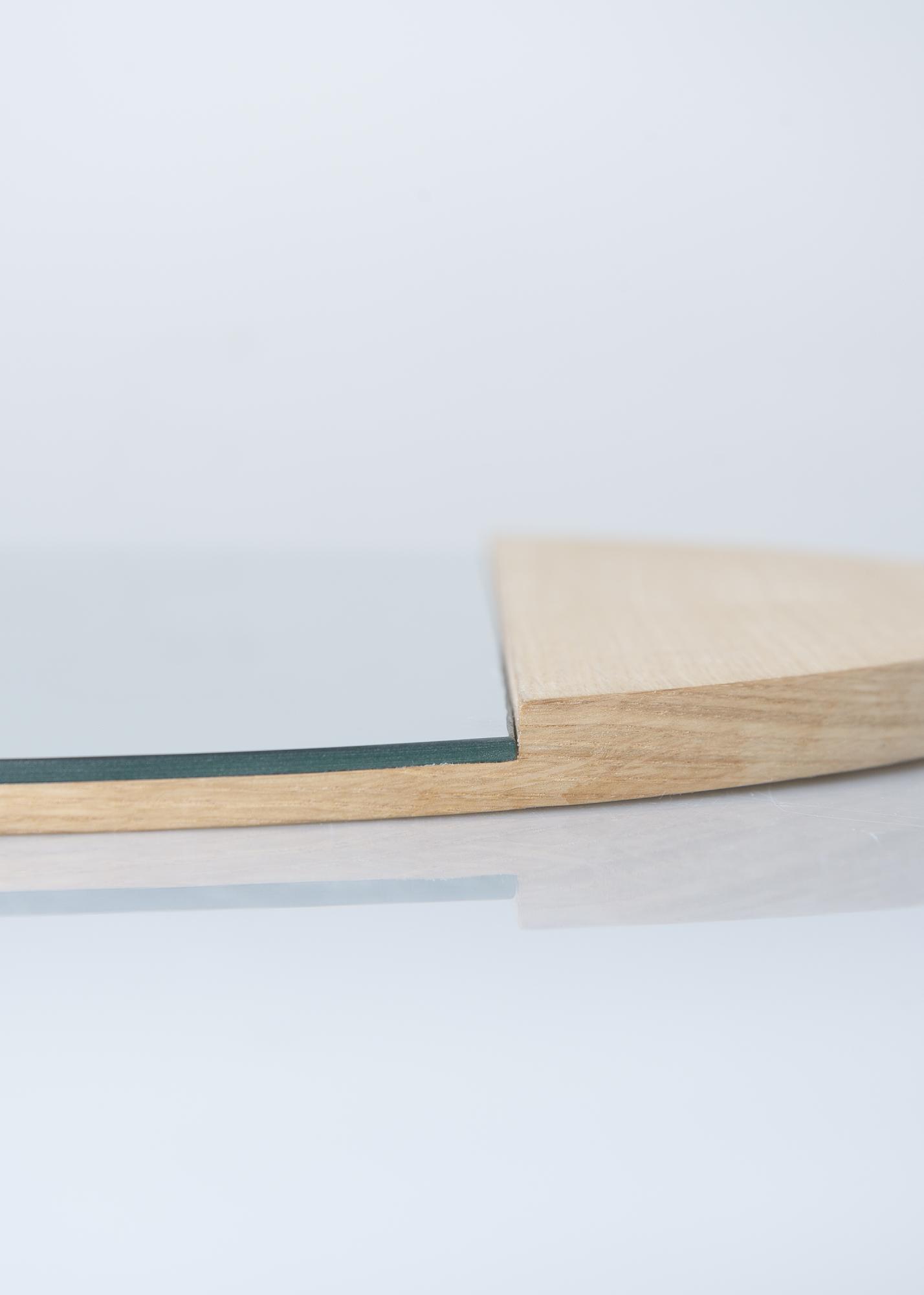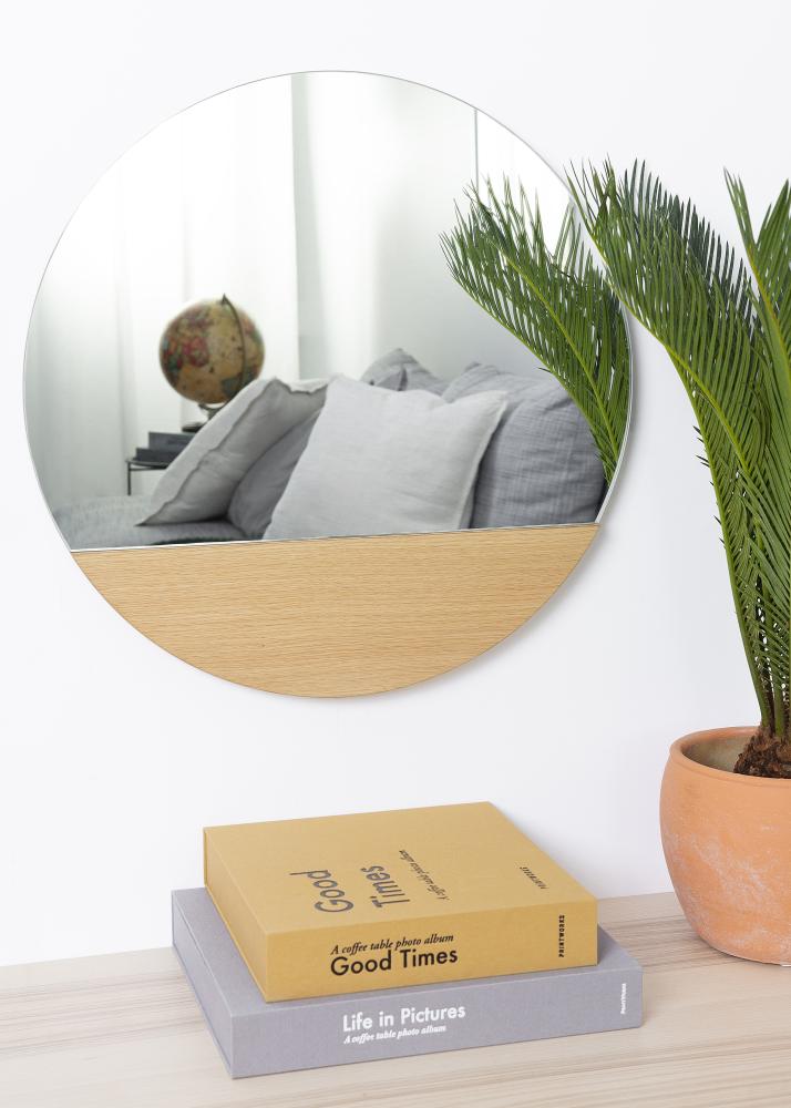 Runder Wandspiegel mit einem schlichten, einfachen aber sehr dekorativen Detail aus Holz. Der untere Teil des Spiegels besteht aus Eiche. Durch dieses einfache Detail bekommt der runde Wandspiegel einen ganz eigenen Stil - mit Stil.