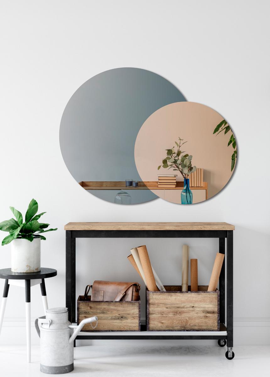 Hier haben wir einen spannenden und trendigen Spiegel von der dänischen Firma Incado, der aus zwei zusammensitzenden kreisförmigen Spiegelgläsern besteht. Der größere Teil des Spiegels ist ungefärbt, während der kleinere Teil in einem schönen Roségold gehalten ist - ein wirklich schöner Spiegel!