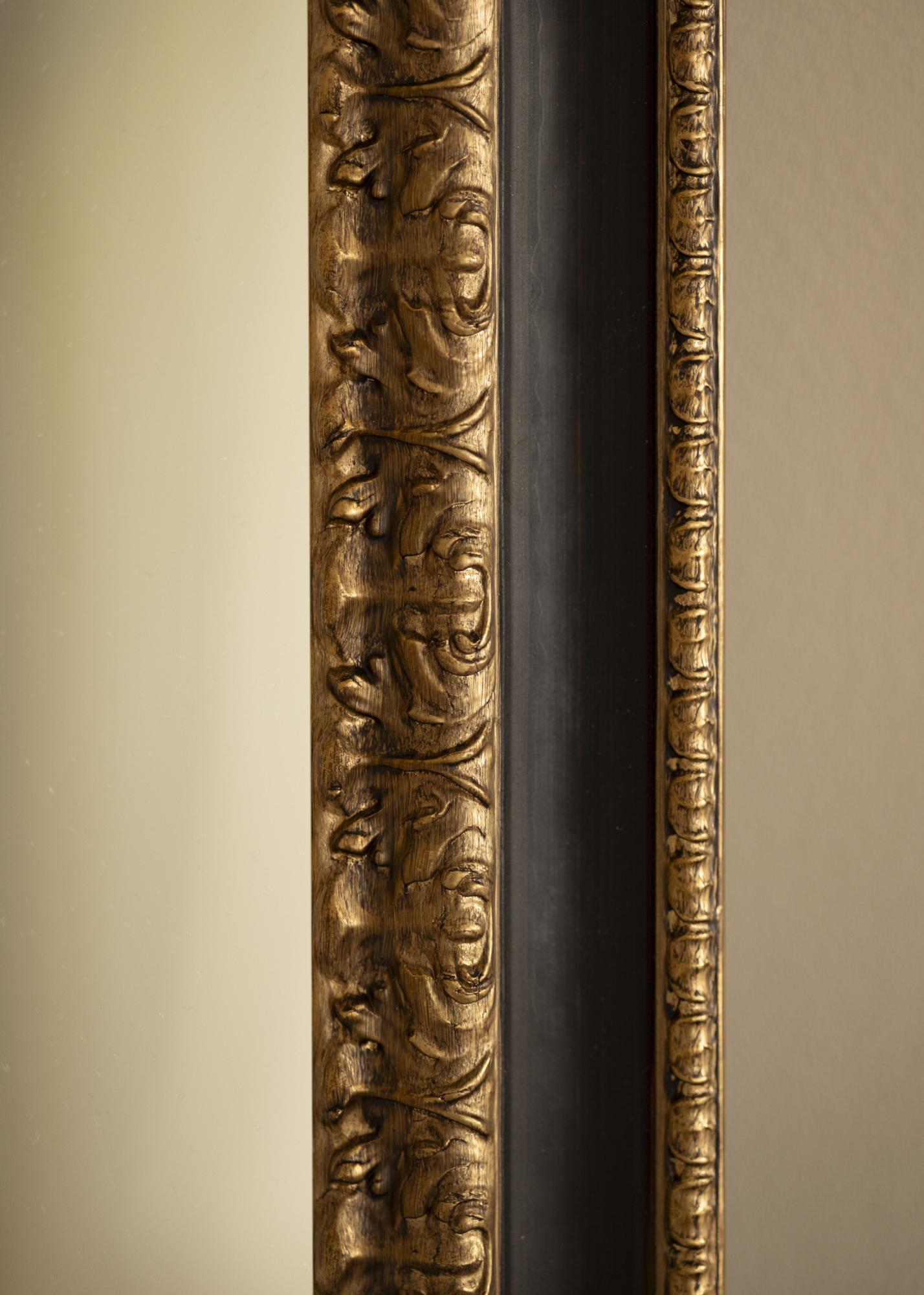 "Drottningholm Gold" ist ein wunderschöner Spiegel im Retro-Stil aus handbemaltem Kiefernholz, hergestellt in Italien. Der Spiegel hat ein üppig verziertes Goldprofil mit einer breiten schwarzen Kante, die dem Rahmen ein elegantes Gefühl verleiht.