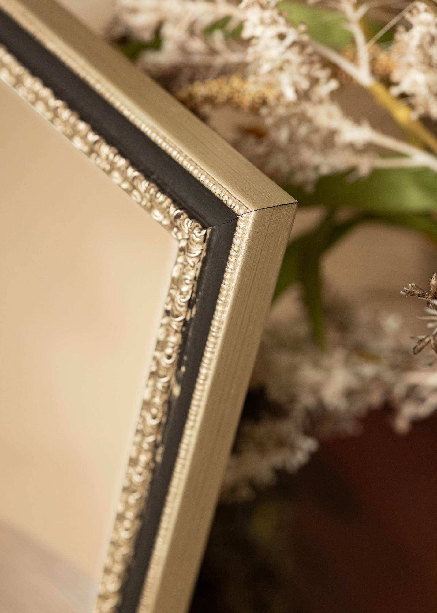 Der Rahmen ist aus Holz gefertigt und hat eine Antikgold-Finish mit dekorativen Ornamenten, die dem Spiegel ein klassisches und zeitloses Gefühl verleihen. Die verzierten Details werden durch den schwarzen Rand weiter hervorgehoben, was ein harmonisches Gleichgewicht zwischen dem Antiken und dem Modernen schafft.