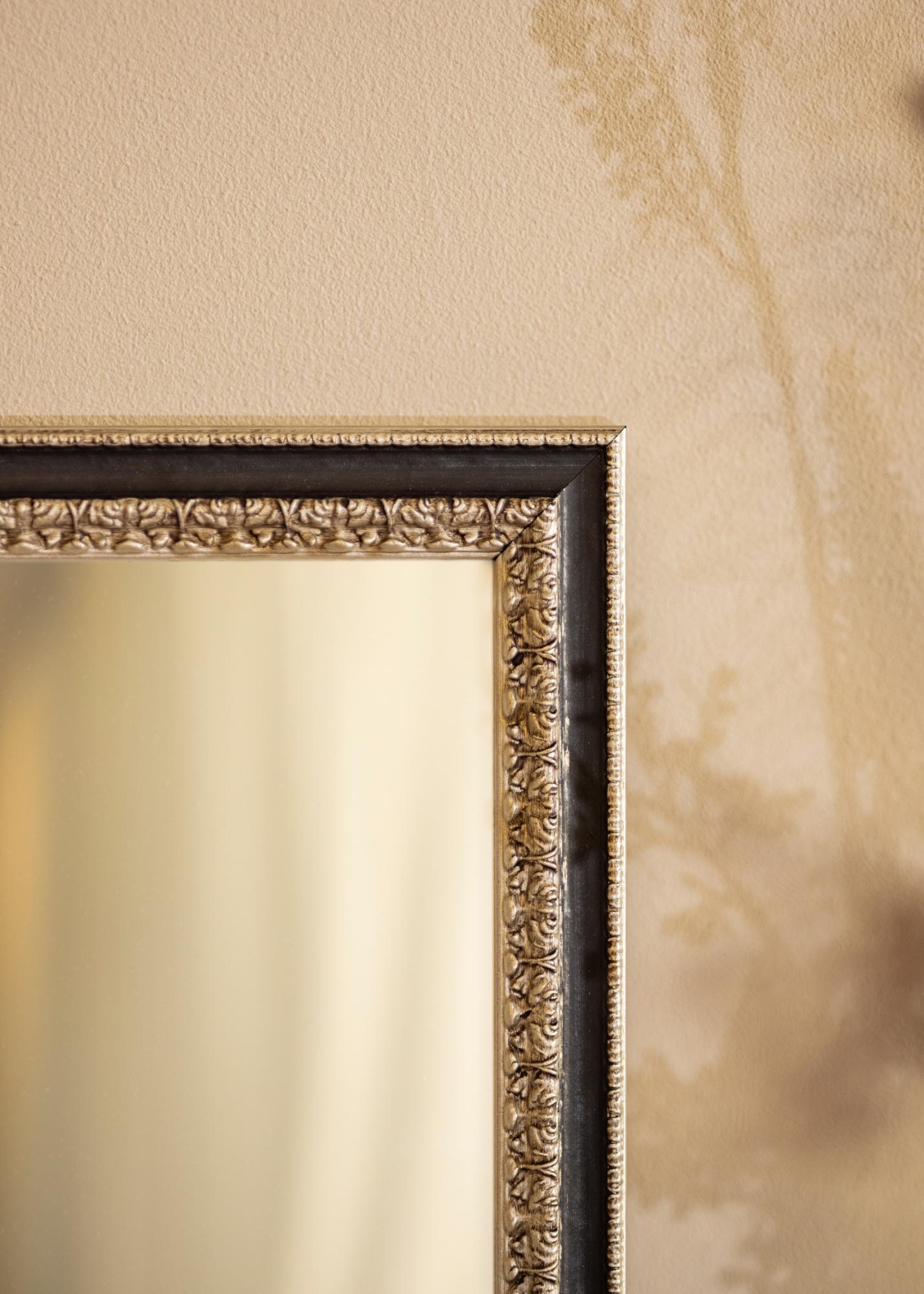 Spiegel Drottningholm Silber II ist ein eleganter und stilvoller Spiegel, der nach Ihren eigenen Maßen gefertigt wird. Mit seiner schönen silbernen Farbe und dem schwarzen Rand wird er zu einem auffälligen Element in jedem Raum. Die 25 mm breite Leiste verleiht dem Spiegel einen markanten Rahmen, während die 17 mm tiefe Tiefe ein Gefühl von Tiefe und Dimension schafft.