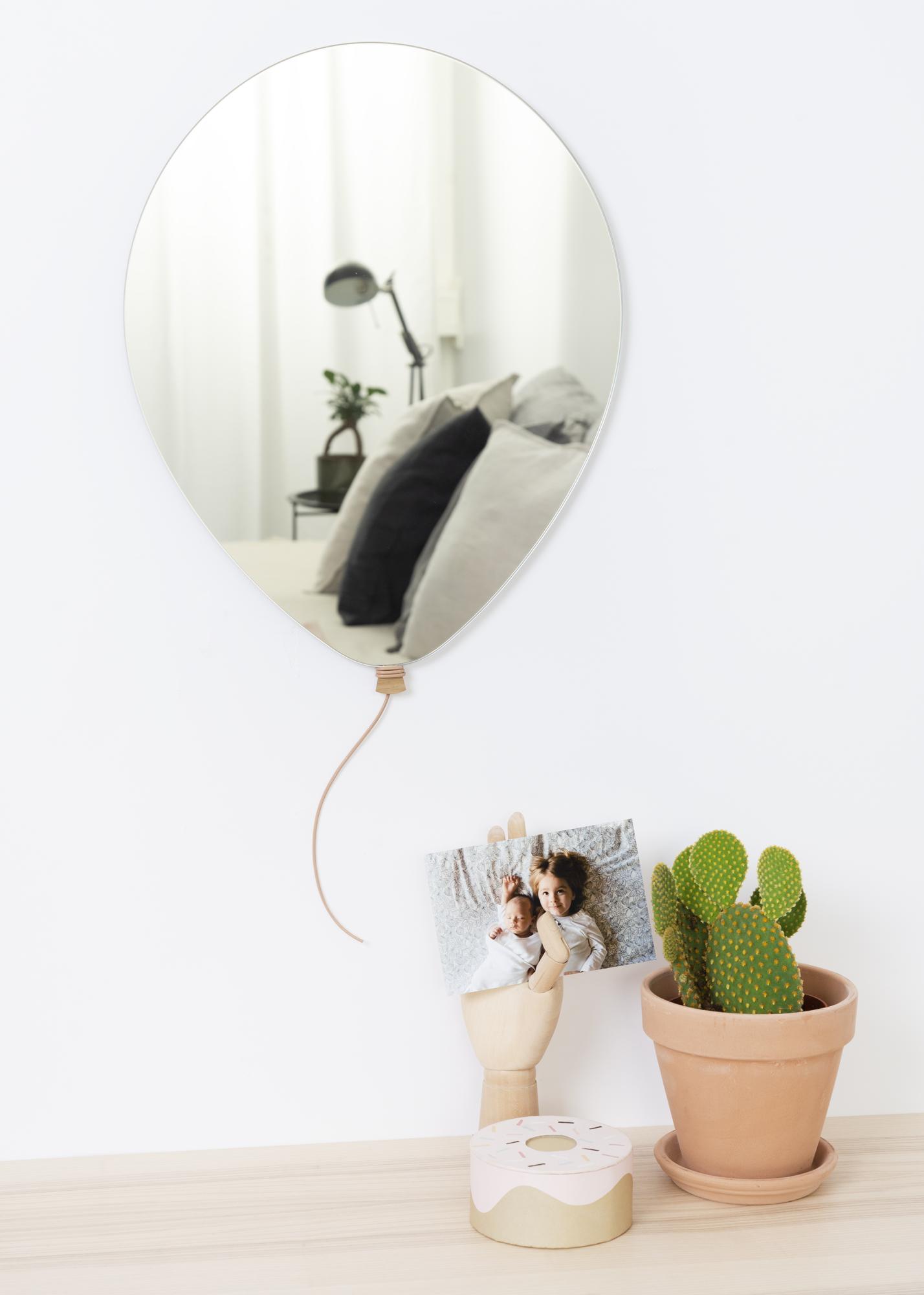 Spiegel in Form eines Luftballons. Balloon Mirror ist der Wandspiegel mit dem luftig-leichten, locker-heiteren Design. Sieht aus wie ein aufsteigender Ballon. Dieser Spiegel ist verspielt und zugleich doch elegant. Passt ins Kinderzimmer oder auch ins Wohnzimmer sowie in den Flur oder sonstige Räumlichkeiten. Der Spiegel Balloon Mirror ist mit hochwertigem Spiegelglas ausgestattet und zeichnet sich durch charmante Details aus: Ballonknoten aus Eiche und eine Ballonschnur aus echtem Leder.
