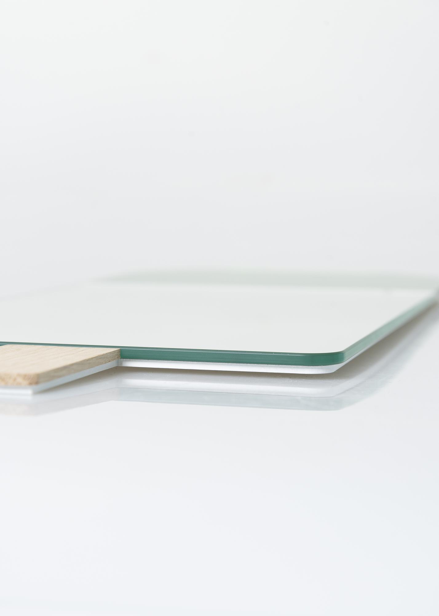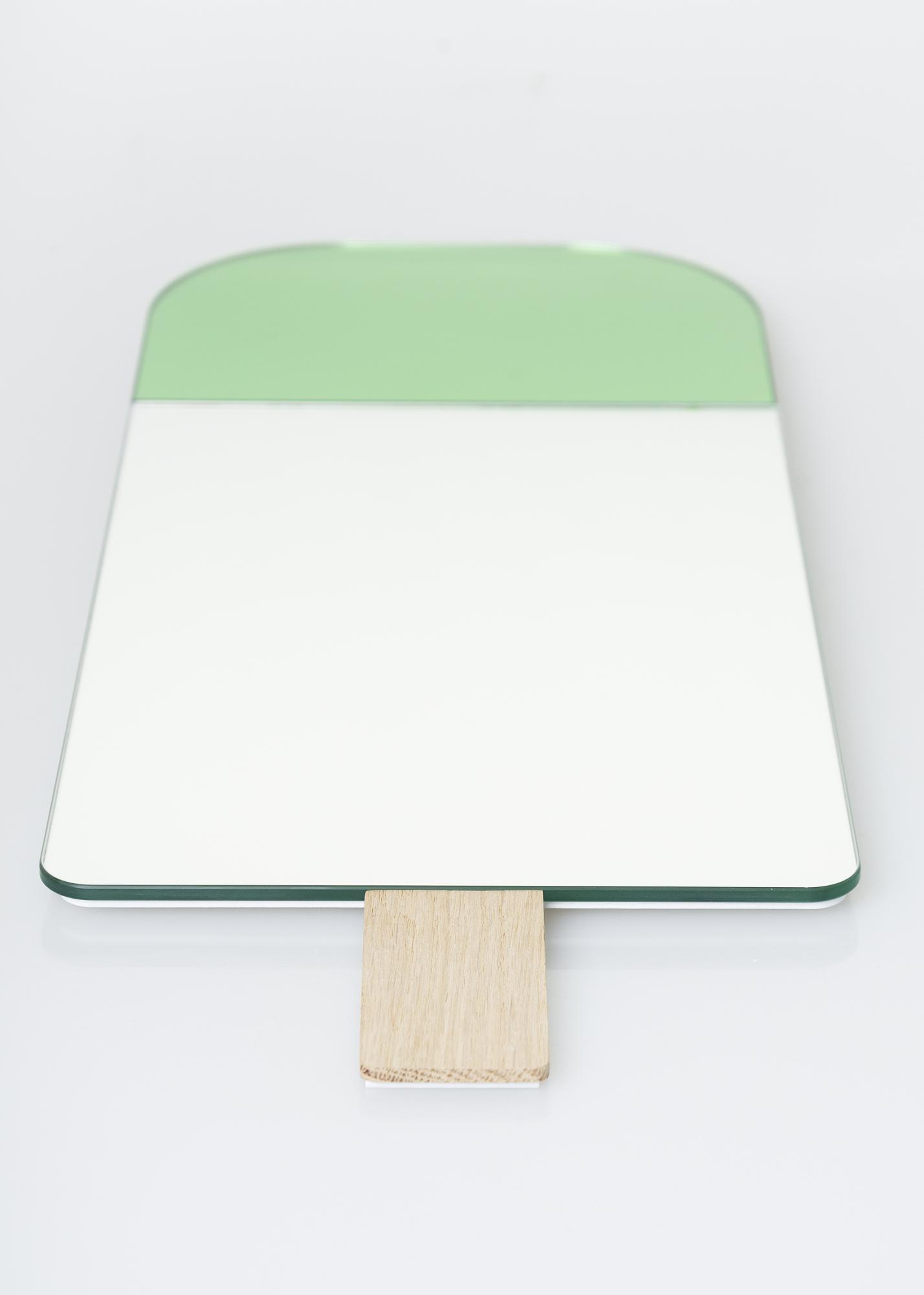 Der Wandspiegel in Stieleis-Form ist aus hochwertigem Spiegelglas gefertigt. Der Holzstiel im unteren Teil des Spiegels ist aus unbehandeltem Eichenholz hergestellt. Den Spiegel mit dem andersfarbigen oberen Teil gibt es in verschiedenen Farben; bei dieser Variante ist die Farbe des oberen Teils Exotic Green.
