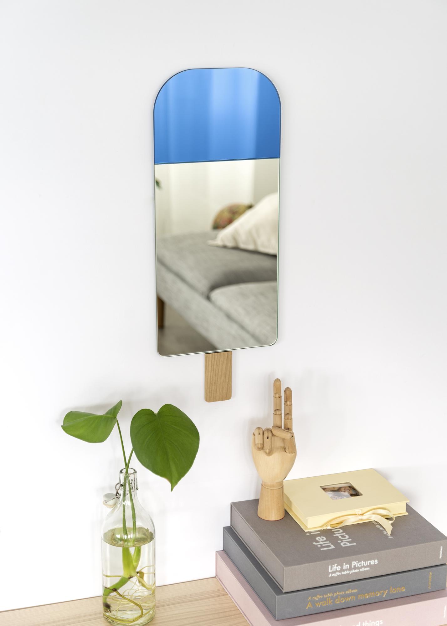 Der Stieleis-Spiegel wurde von Tor & Nicole Vitner Servé für das dänische Label Elements Optimal (EO) entworfen. Skandinavisches Design zum Wohnen und Wohlfühlen. Den Spiegel mit dem andersfarbigen oberen Teil gibt es in verschiedenen Farben; bei dieser Variante ist die Farbe des oberen Teils Ocean Blue.