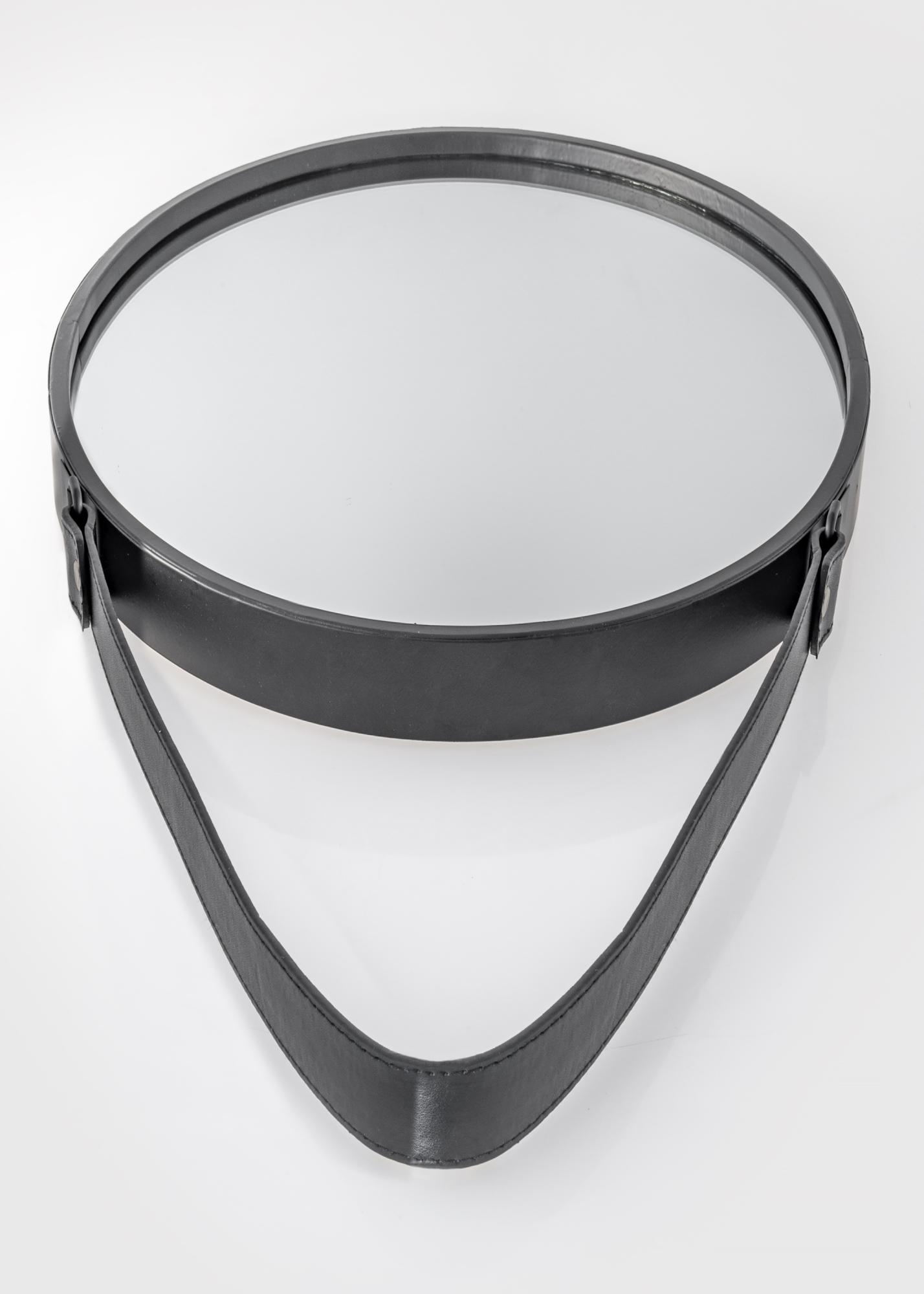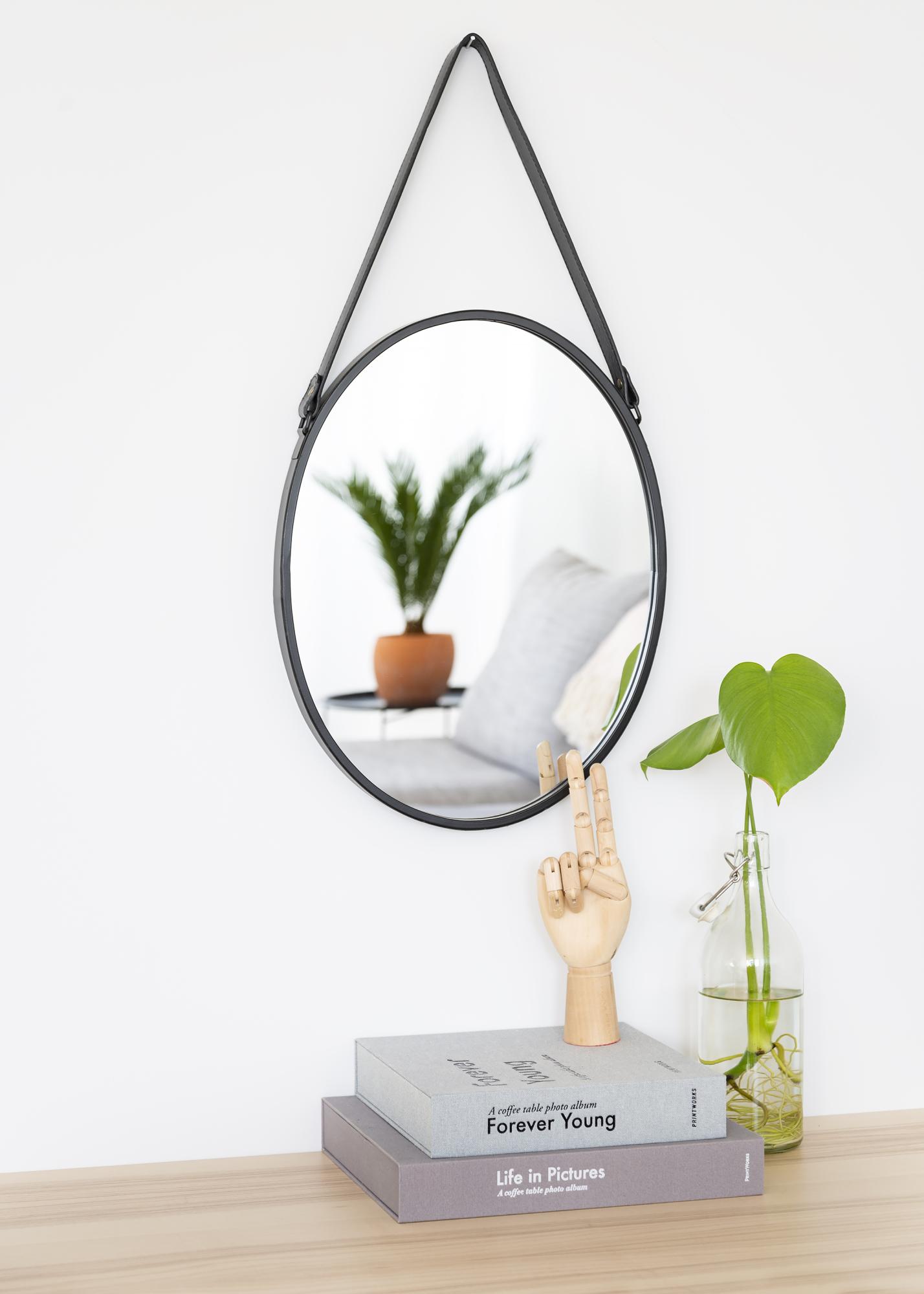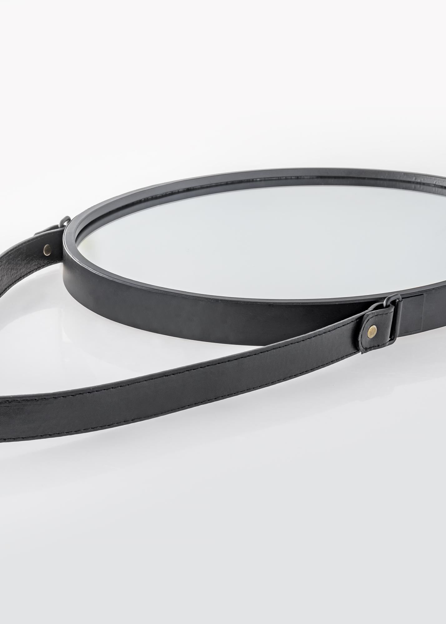 Modern, elegant, funktionell, so präsentiert sich dieser Wandspiegel. Ein schmaler, schwarzer Metallrahmen fasst das Spiegelglas ein. Der ovale Spiegel lässt sich einfach mit dem am Rahmen befestigten Kunstlederband aufhängen.