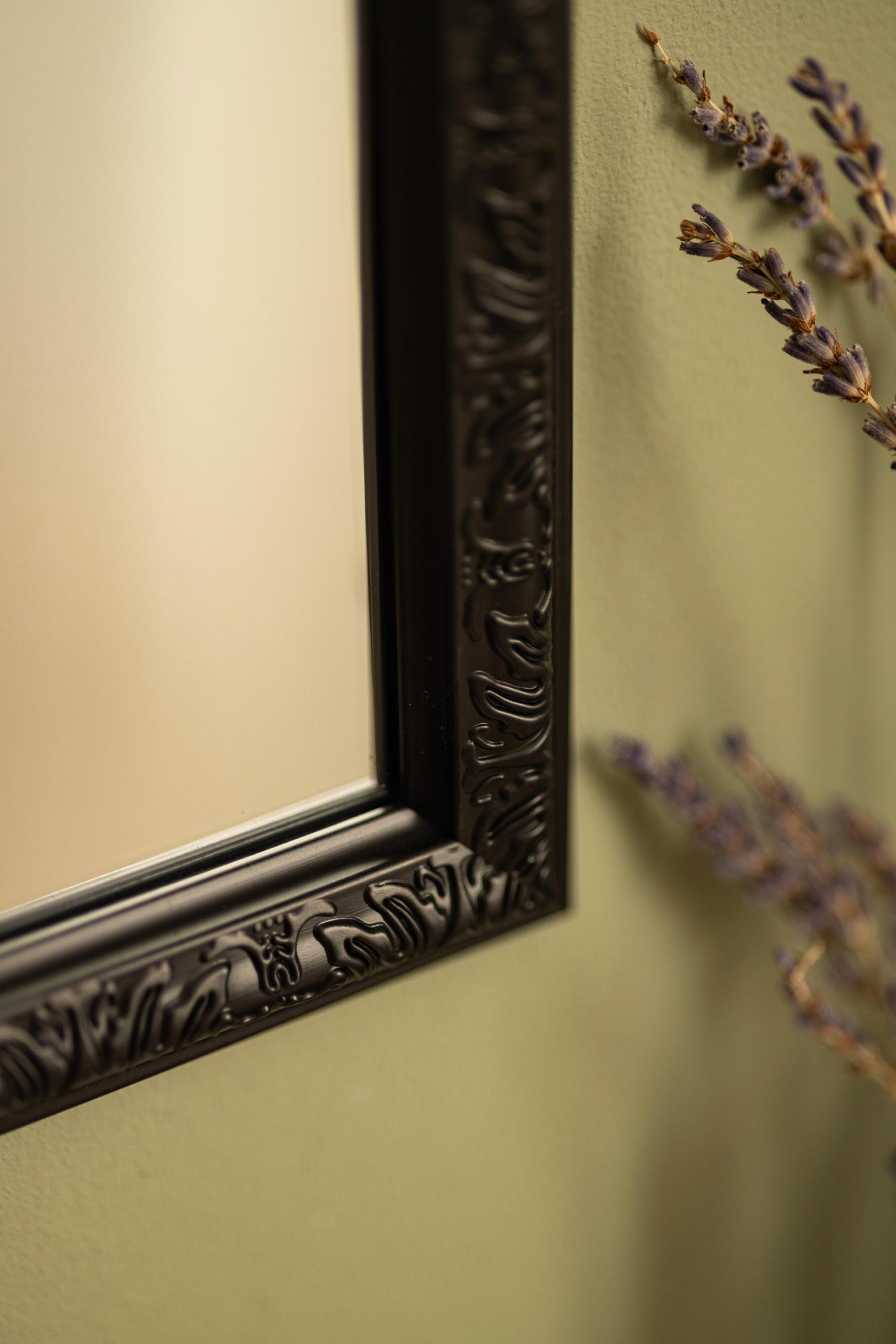 Rahmenkonfigurator starten »Nost heißt diese Reihe von Wandspiegeln. Der Rahmen wurde reich mit unregelmäßigen Symbolen dekoriert, die ihm einen mysteriösen Eindruck verleihen.