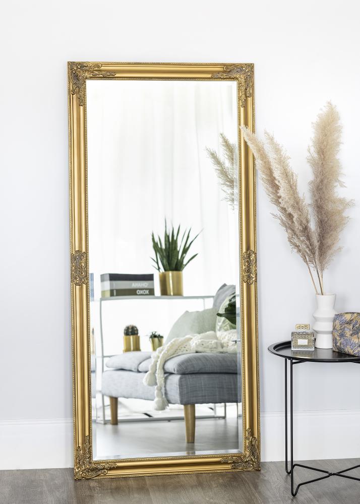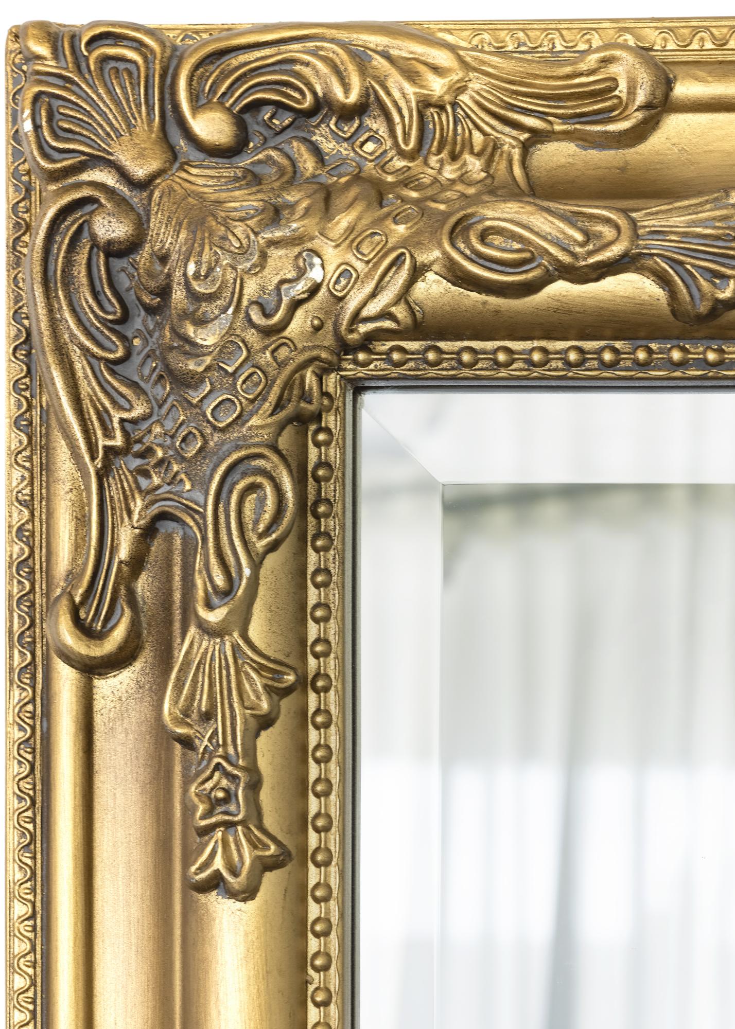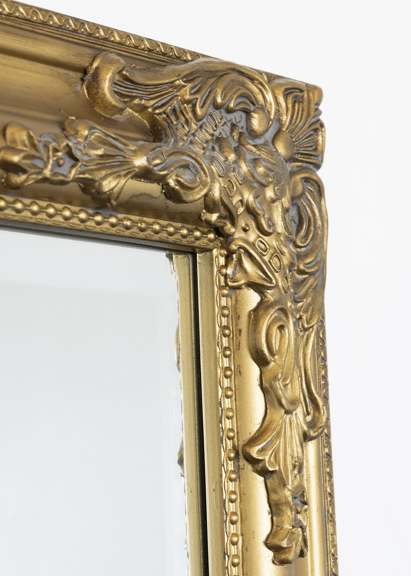 Spiegel mit schönem Profil in Gold mit einer antiken Note, verziert mit Blumenornamenten. Der klassische Stil des Spiegelrahmens passt hervorragend zu Einrichtungsstilen mit älteren Möbeln, kann aber auch verwendet werden, um einen spannenden Kontrast in einem stilvollen, modern eingerichteten Zuhause zu schaffen. Der Spiegel lässt sich wunderbar im Flur, Schlafzimmer oder in einem begehbaren Kleiderschrank aufhängen und wird gemeinsam mit Accessoires in Messing- oder Goldtönen schön hervorgehoben.