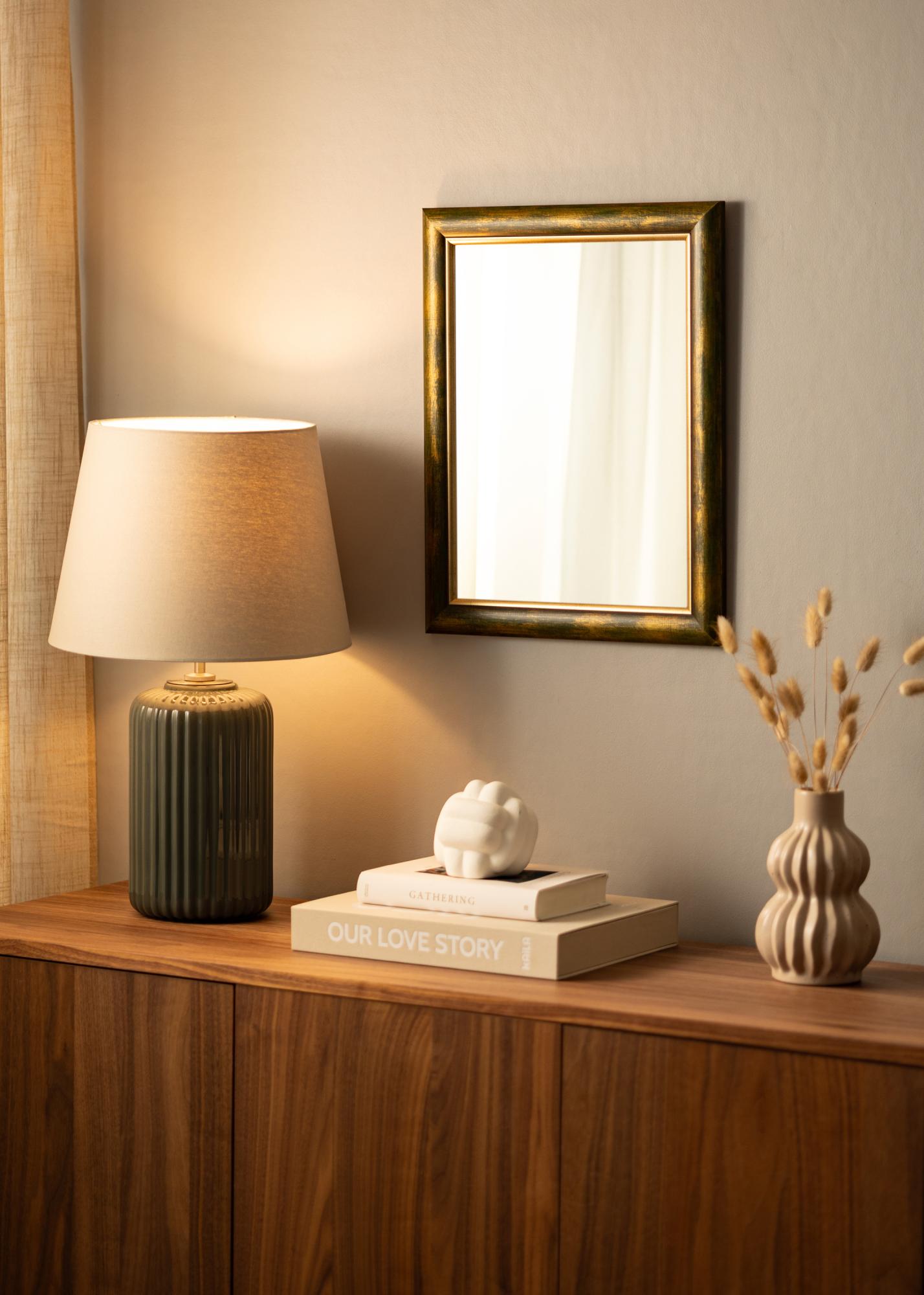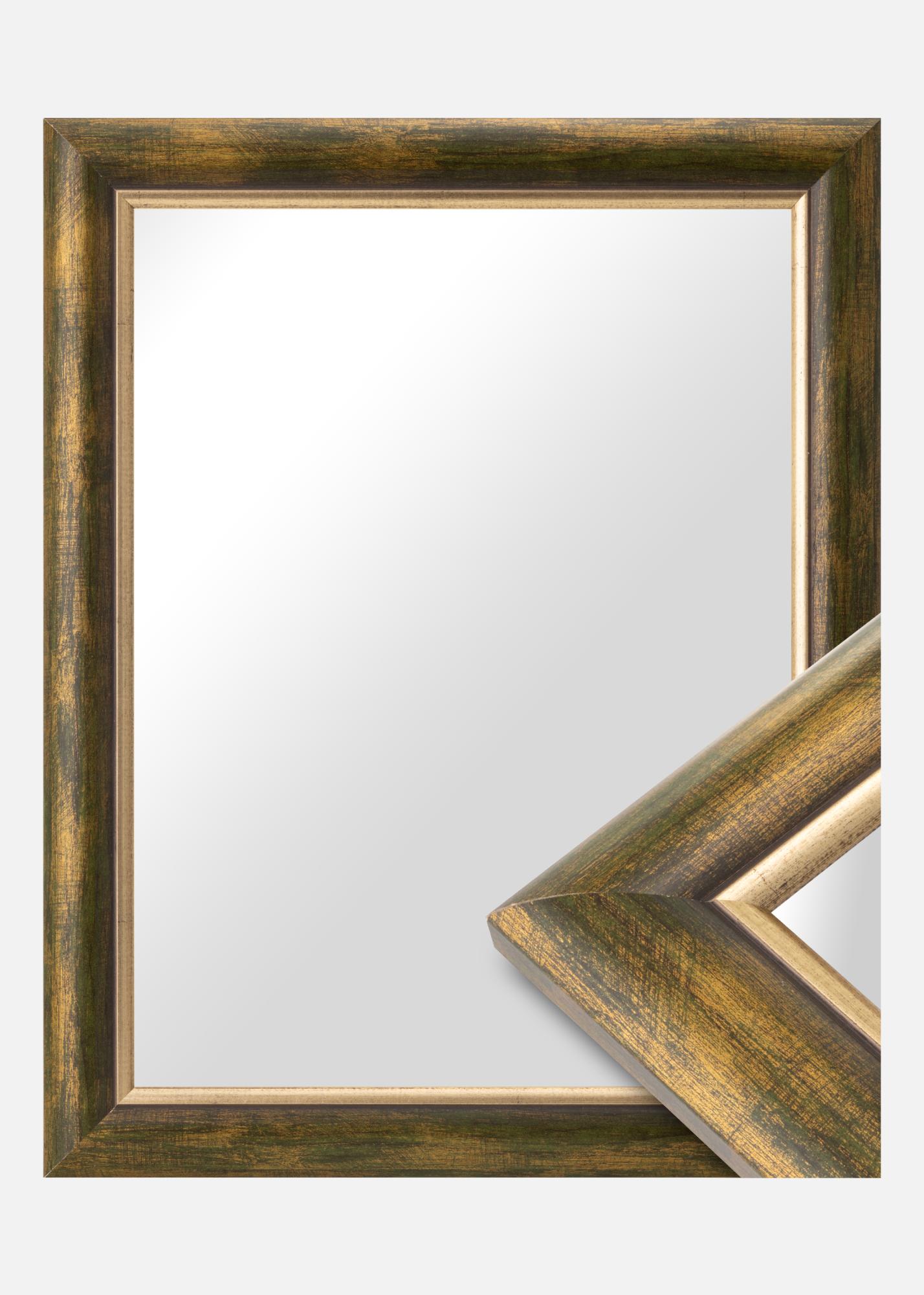Zeitloser Holzrahmen aus Finnland mit einer schönen grün getönten Holzoberfläche mit einer goldenen Kante nahe dem Spiegelglas. Der Rahmen hat ein breites Profil von 41 mm und eine Tiefe von 19 mm, was dem Spiegel zusätzliche Tiefe verleiht.