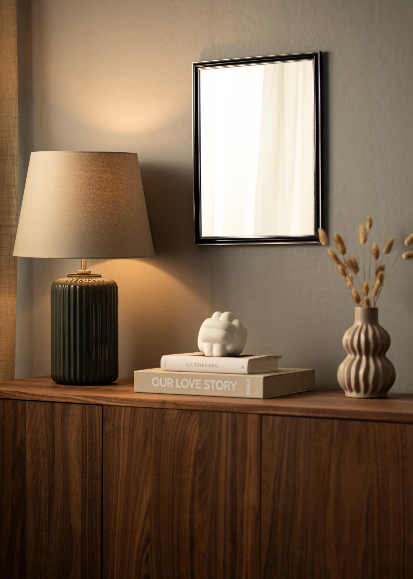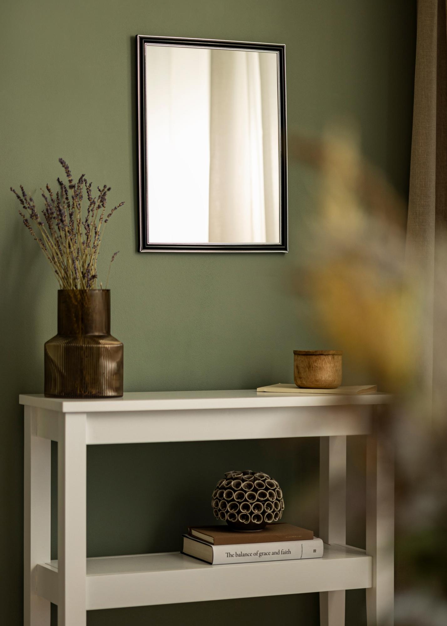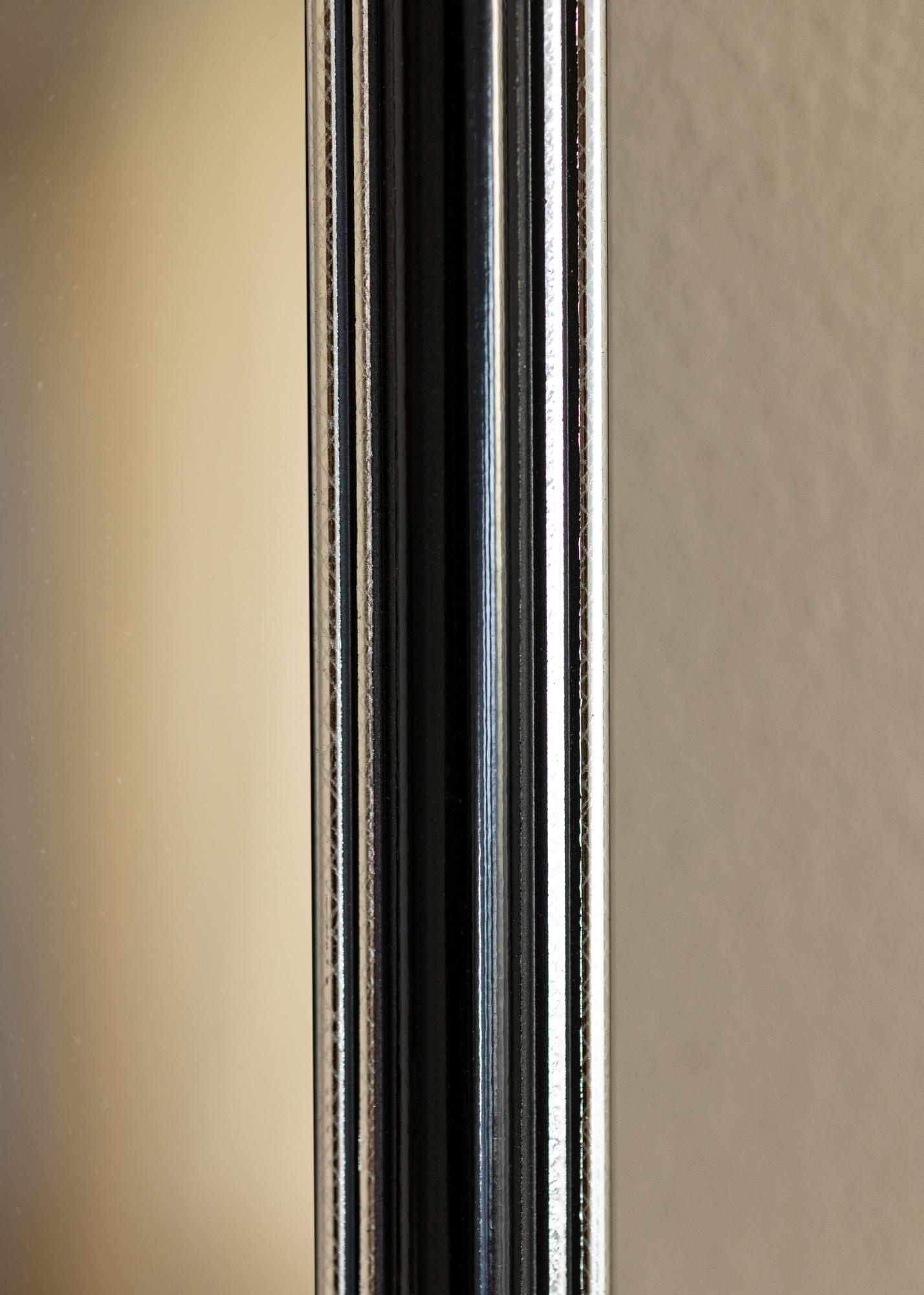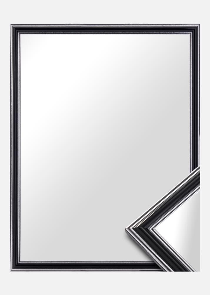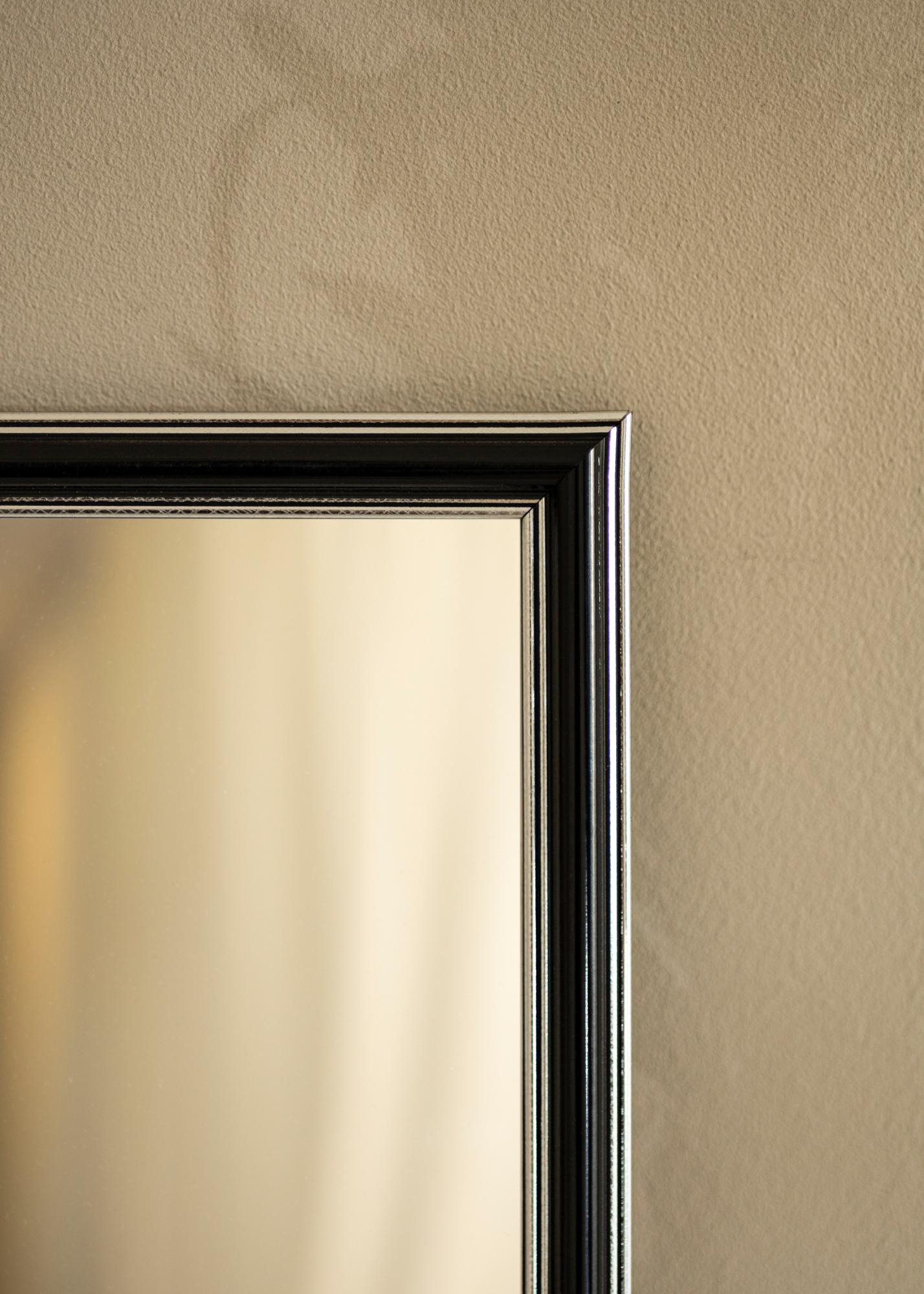 Hol dir einen hübschen Spiegel, der genau dort passt, wo du ihn haben möchtest! Dieser luxuriöse Spiegel wird nach deinen Maßangaben in unserer eigenen Rahmenwerkstatt hergestellt. Der schwarze Mittelteil mit silbernen Rändern innen sowie außen sorgt für eine maskuline Note. Passt hervorragend zu anderen Dekorationen in Silber, Schwarz, Weiß und Lila.