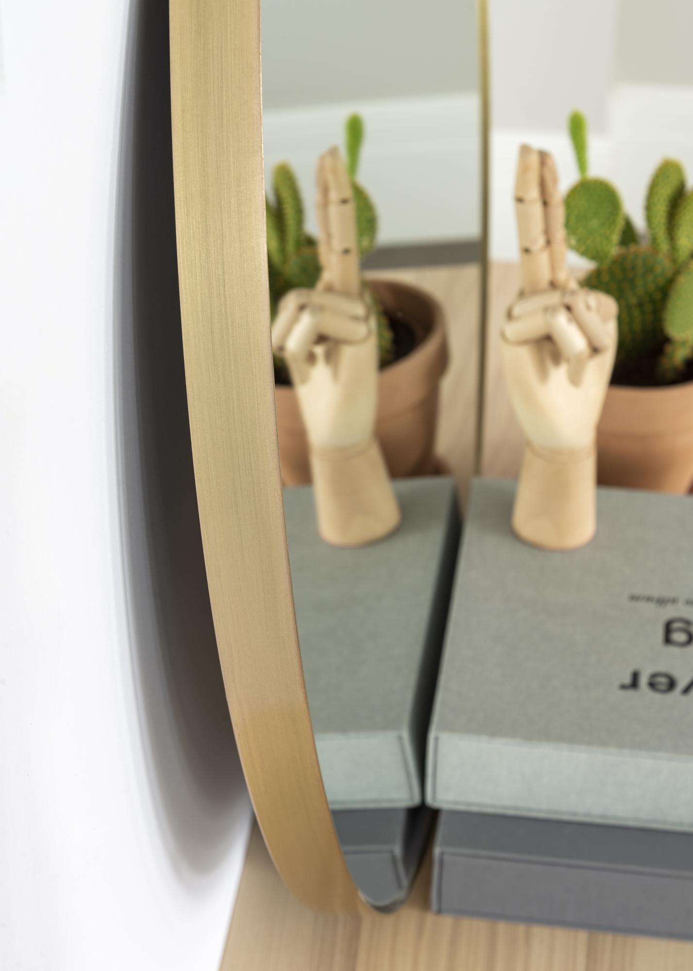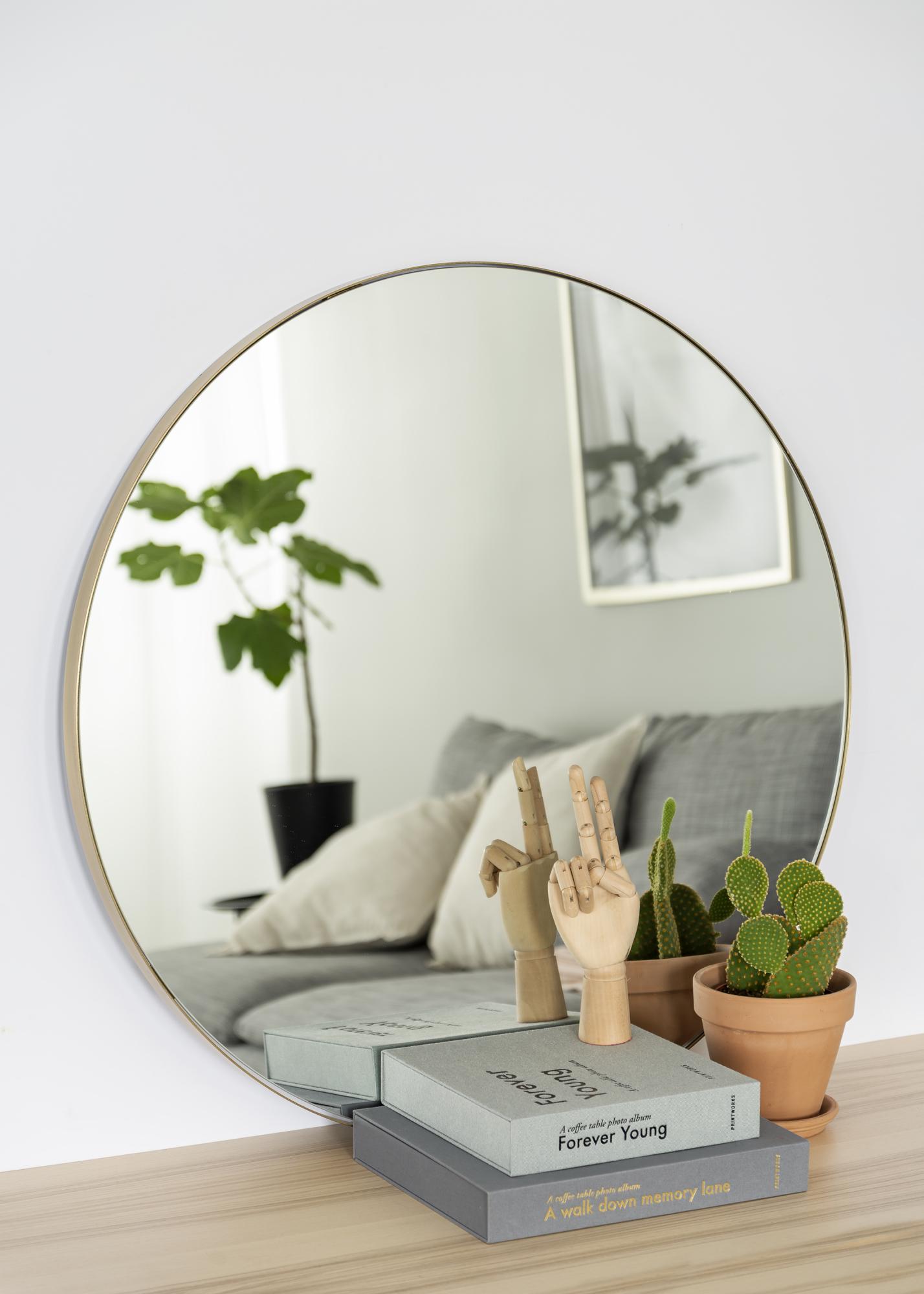 Dieser zeitlos-elegante Wandspiegel wird geschmackvoll von einem messingfarbenen Metallrahmen eingefasst. Der runde Spiegel passt mit seiner schlichten Eleganz zu sowohl modernen als auch klassisch gehaltenen Einrichtungsstilen.