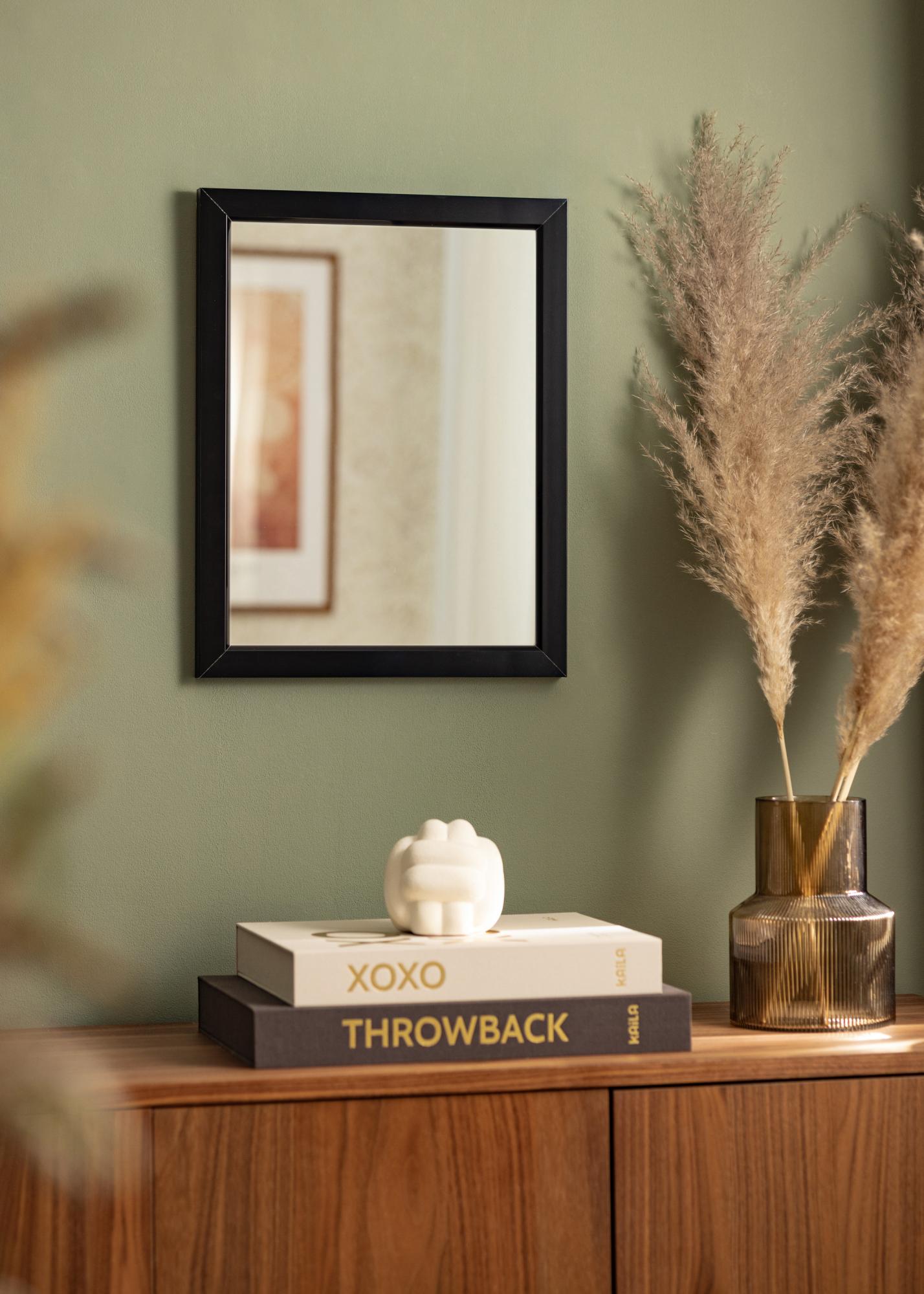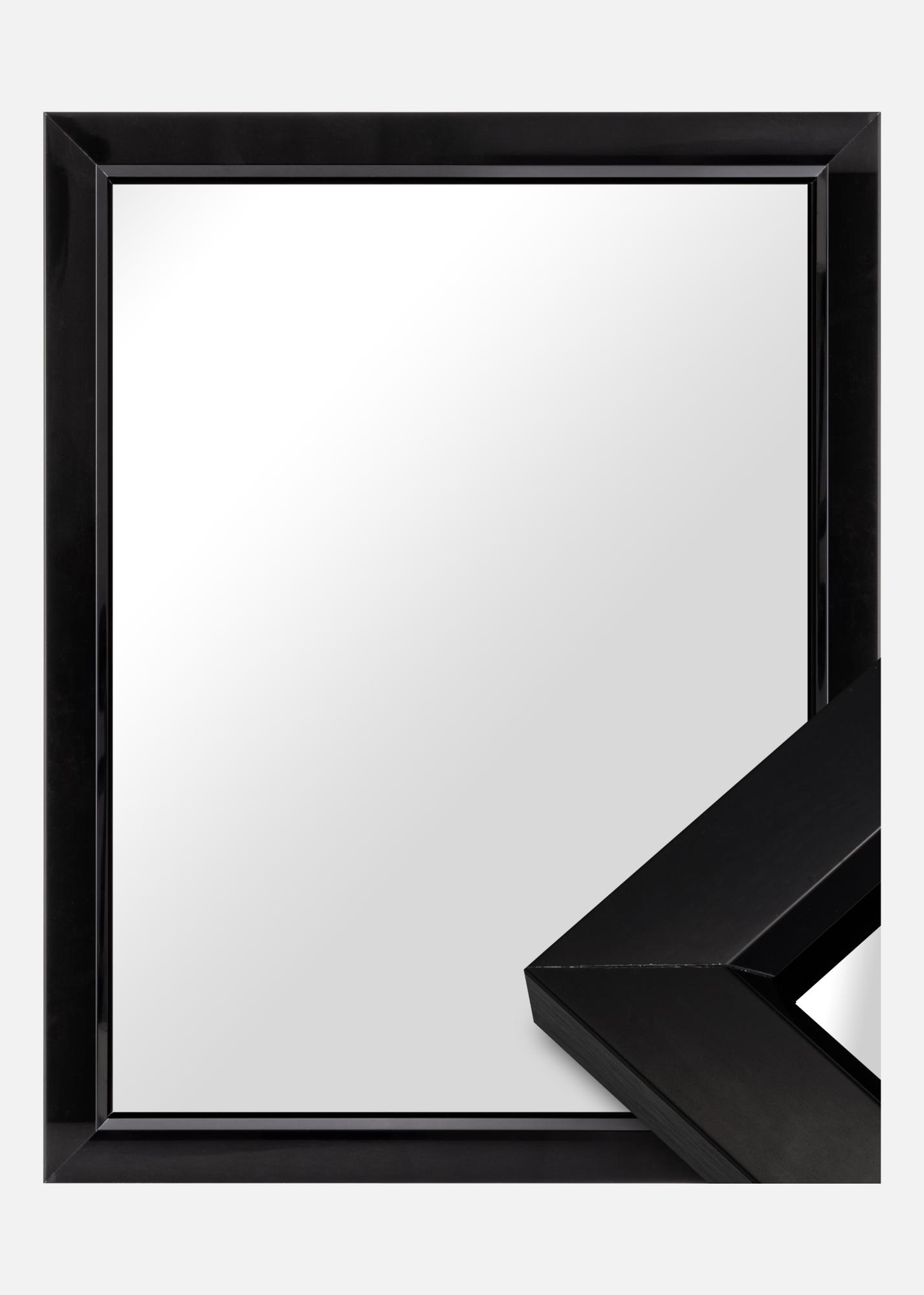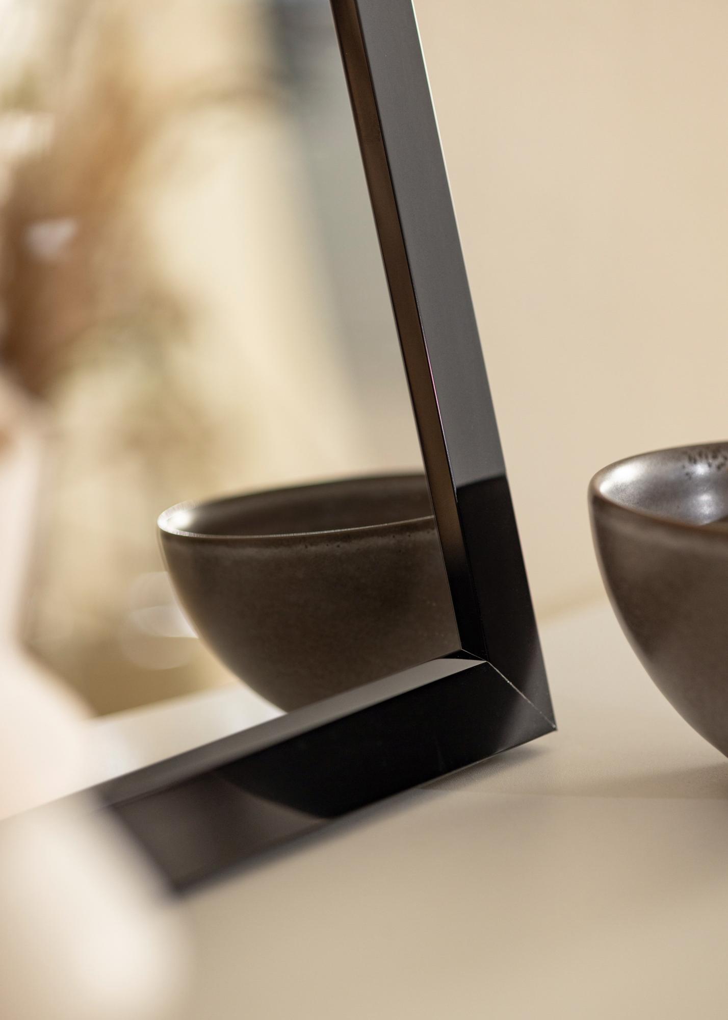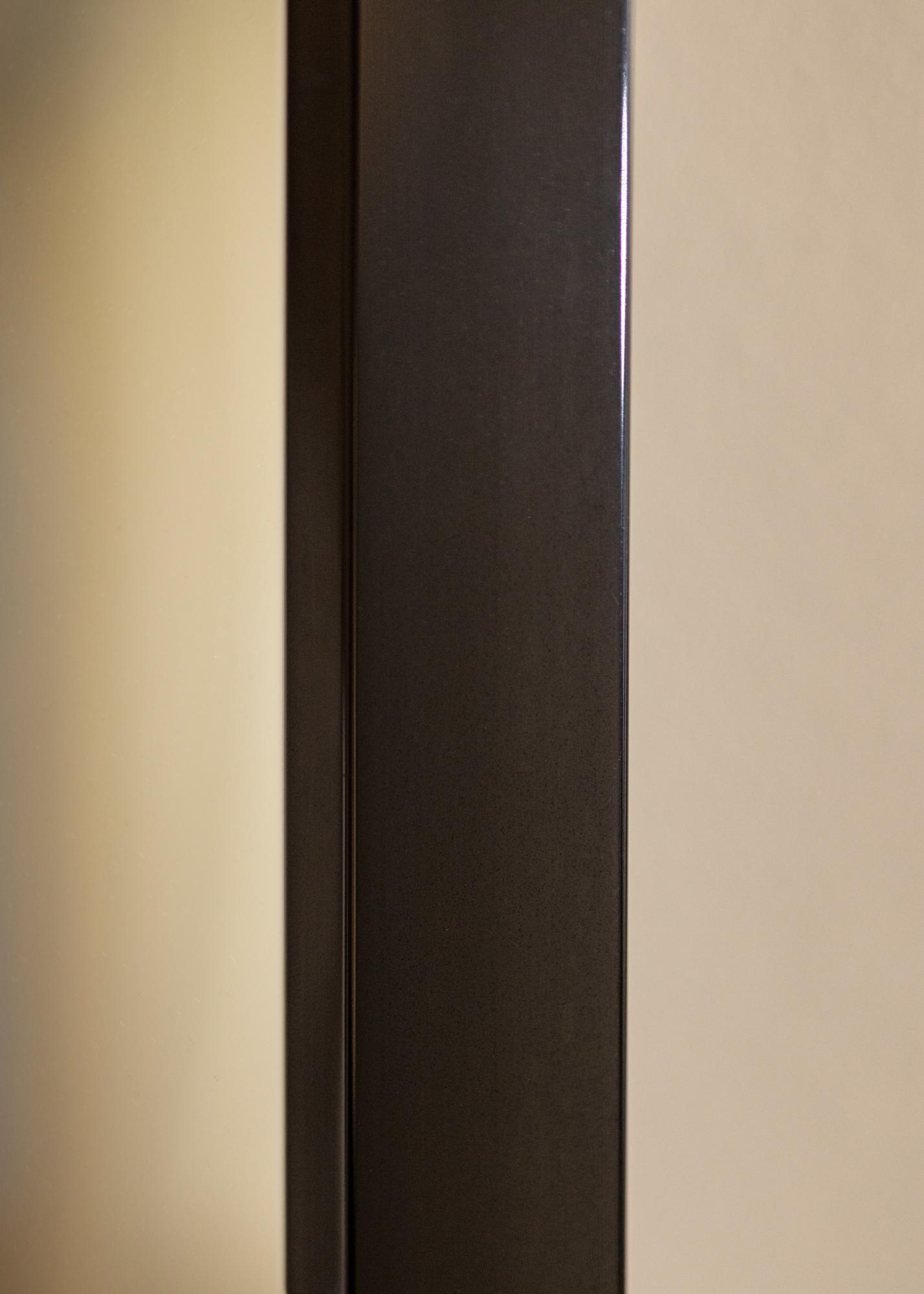Schwarzer schicker Spiegel mit einem hochglänzenden Rahmen aus Aluminium mit einer abschrägten inneren Kante. Die maskuline Note kann einen aufregenden Kontrast zu einer weicheren Innenausstattung bilden, aber durch die glänzende Lackierung passt der Spiegel auch gut in moderne industrielle Einrichtungen. Hänge den Spiegel gemeinsam mit grafischen Postern oder Bildern mit schwarzen Rahmen auf. Durch das Anbringen gegenüber eines Fensters wird optisch mehr Raum im Zimmer geschaffen.